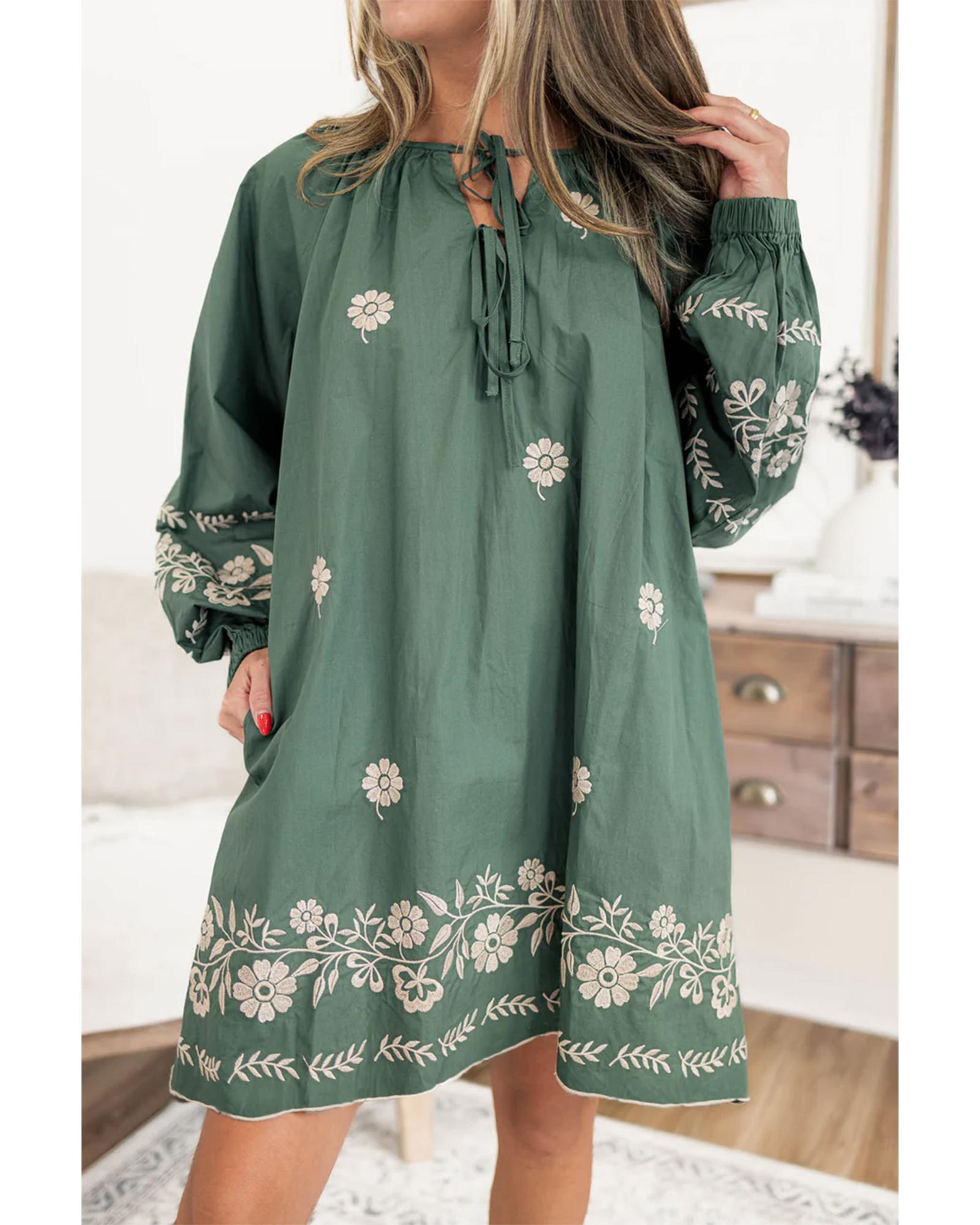 - Mist Green Tie Neck Boho Floral Pattern Puff Sleeve Shift Dress