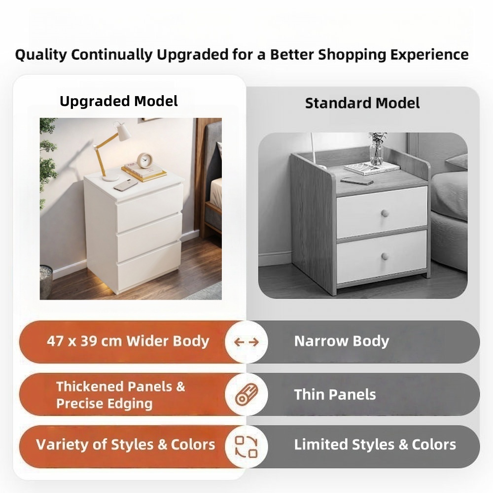 This modern minimalist bedside table features an ultra-simple design in warm white, presenting a clean and crisp visual effect. The cabinet has three spacious drawers, providing rich layered storage space to meet various storage needs. The flat top surface can be used for placing lamps, alarm clocks, phones, and other everyday items. This bedside table adopts a handle-free design, with recessed finger pulls on the front edges of the drawers, making them convenient to use while maintaining a sleek appearance. The pure geometric shape embodies minimalist design aesthetics, while the three-drawer layout provides more storage options, suitable for modern, Nordic, and minimalist bedroom decor.