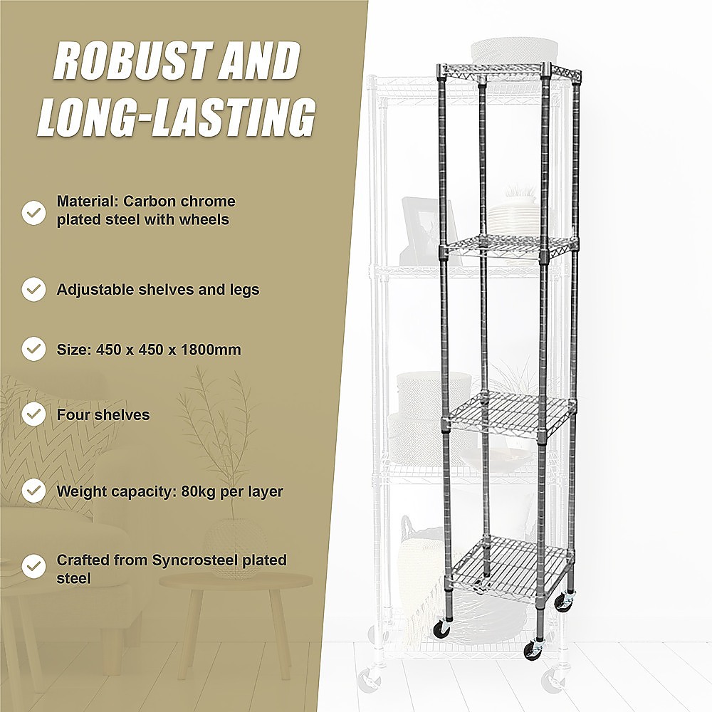 When it comes to strength and dependability, this four-shelf storage unit excels. Crafted from Syncrosteel plated steel, it is designed to withstand the test of time. The wire shelving adds a sense of lightness and mobility, granting you unmatched versatility to adapt to your ever-changing requirements.