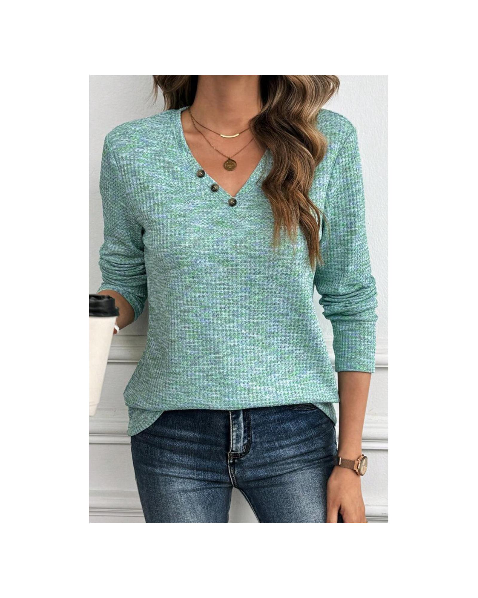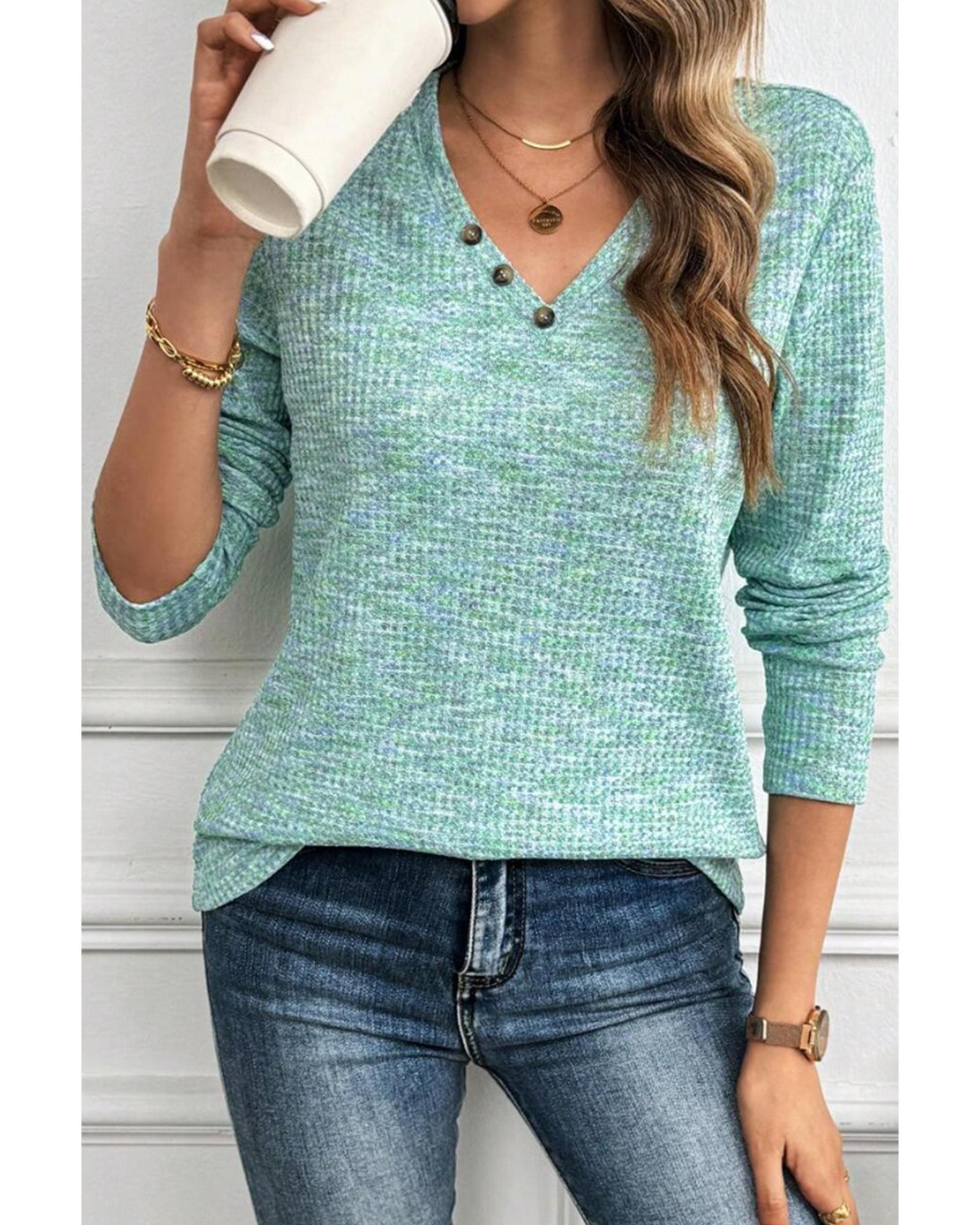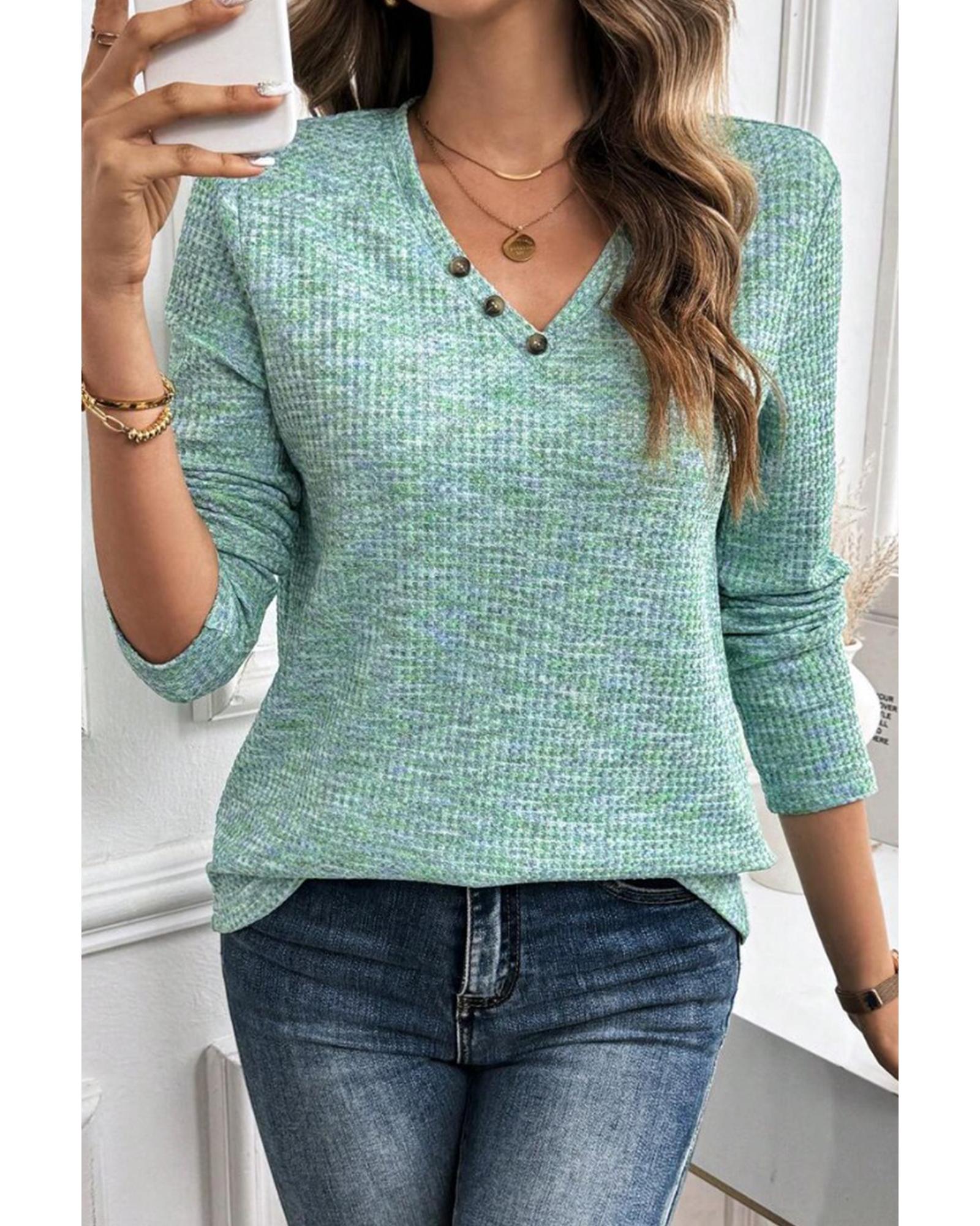 Moonlight Jade Buttoned V Neck Textured Knit Long Sleeve Top – XL
