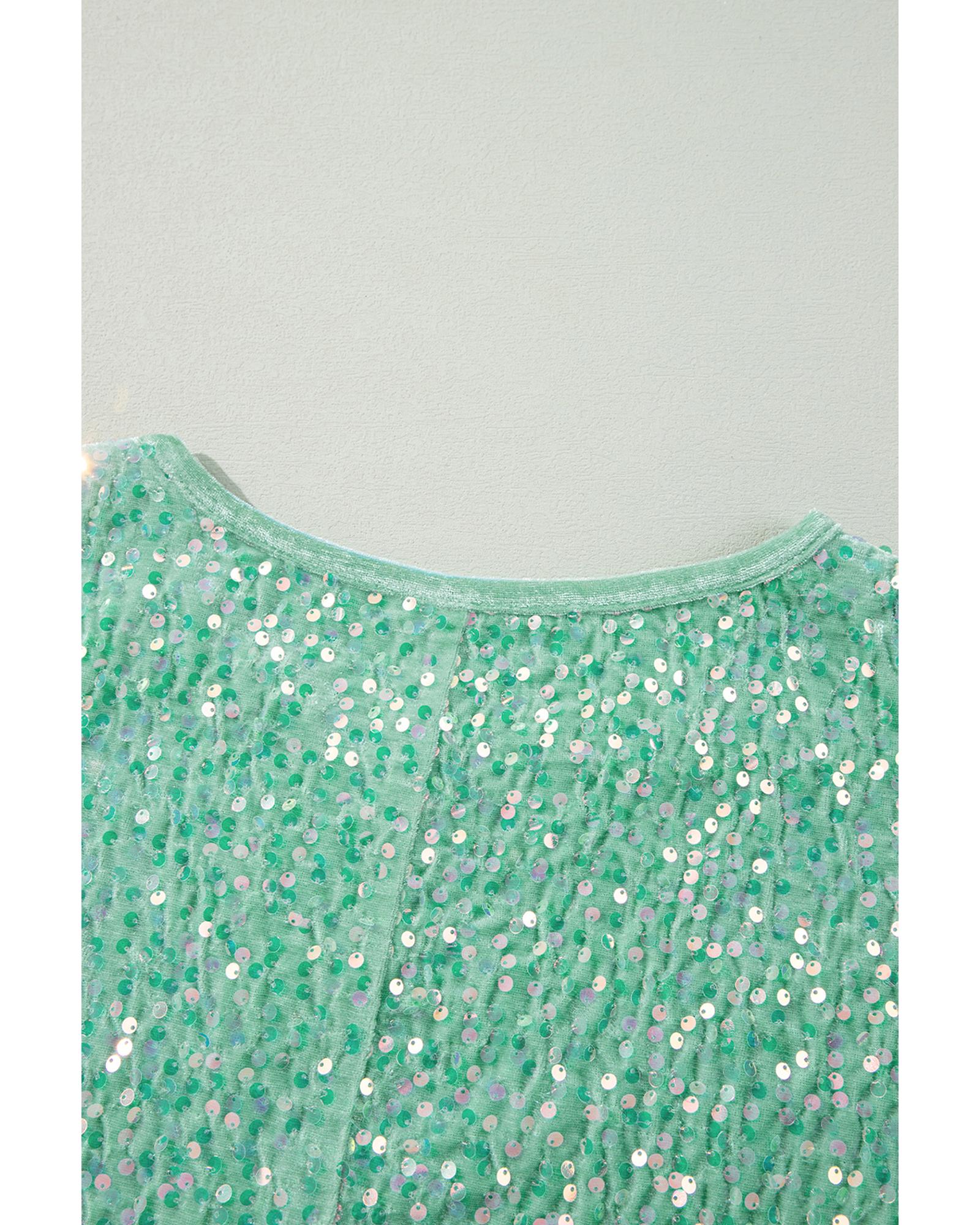 Moonlight Jade Sequin Batwing Sleeve V Neck Velvet Blouse – S