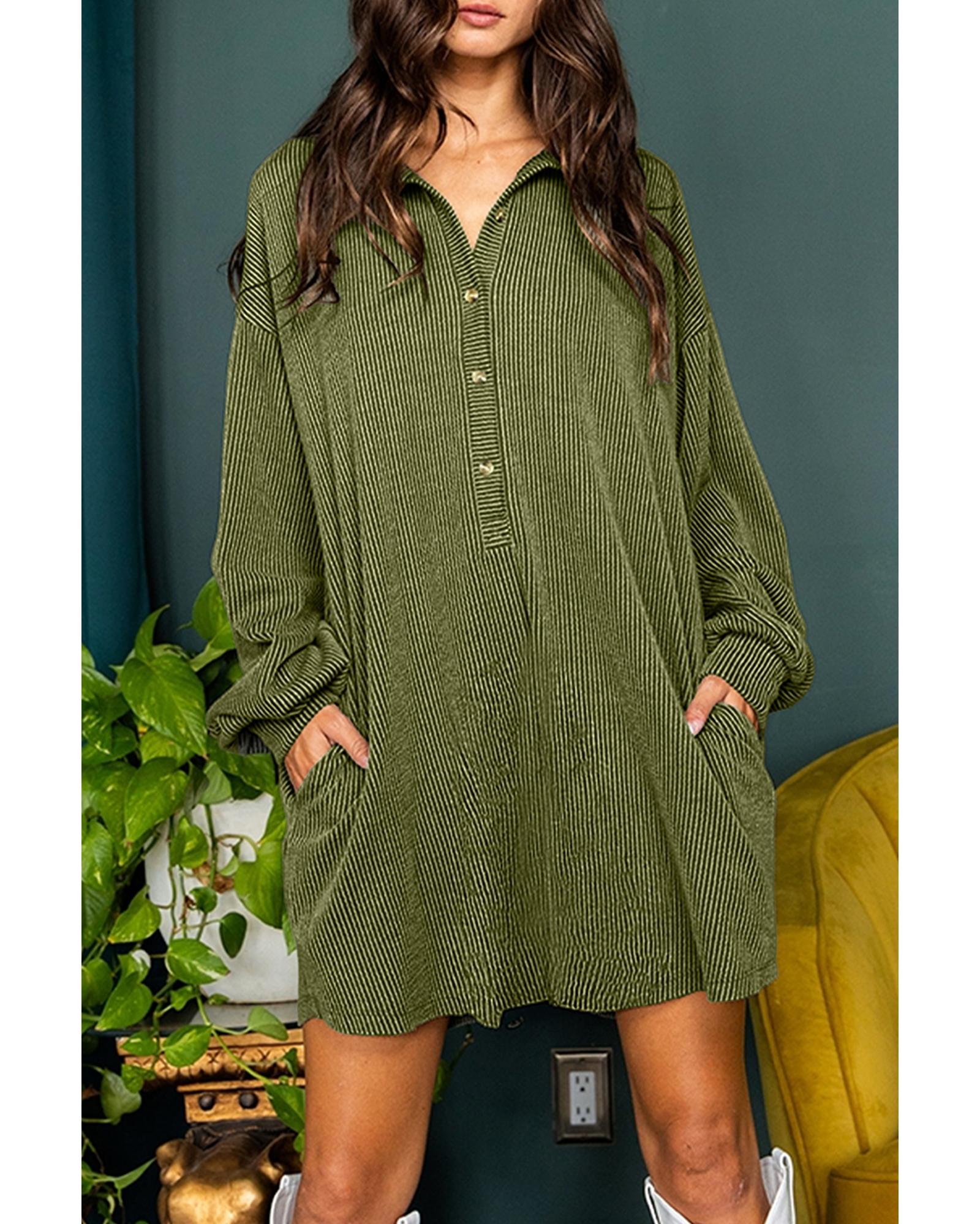 Moss Green Corded Buttons Placket Drop Shoulder Collared Shift Dress – L