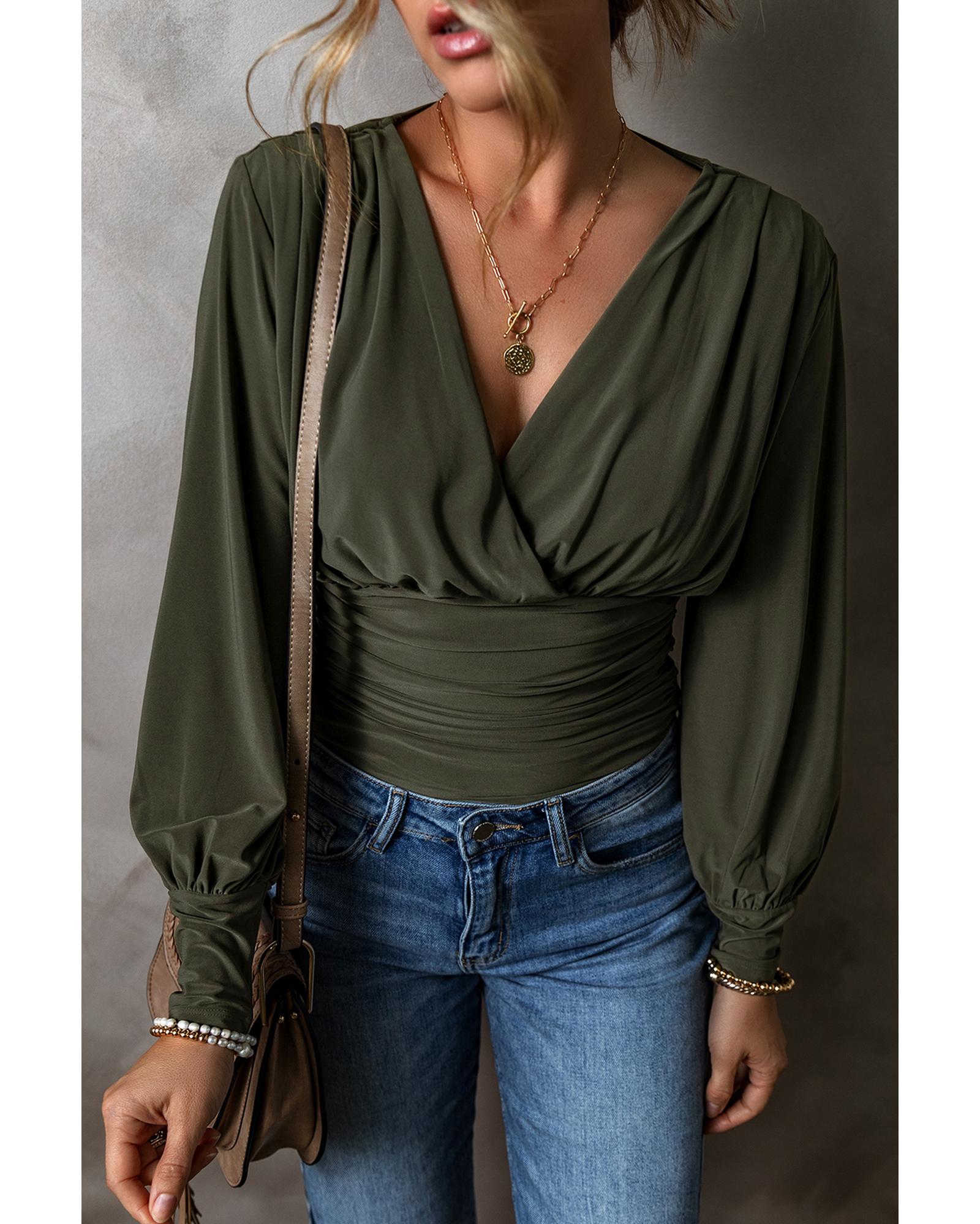 Moss Green Ruched Wrap V Neck Long Sleeve Bodysuit – L