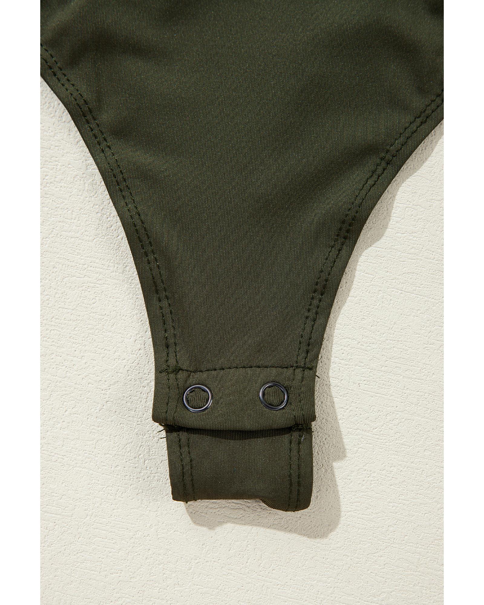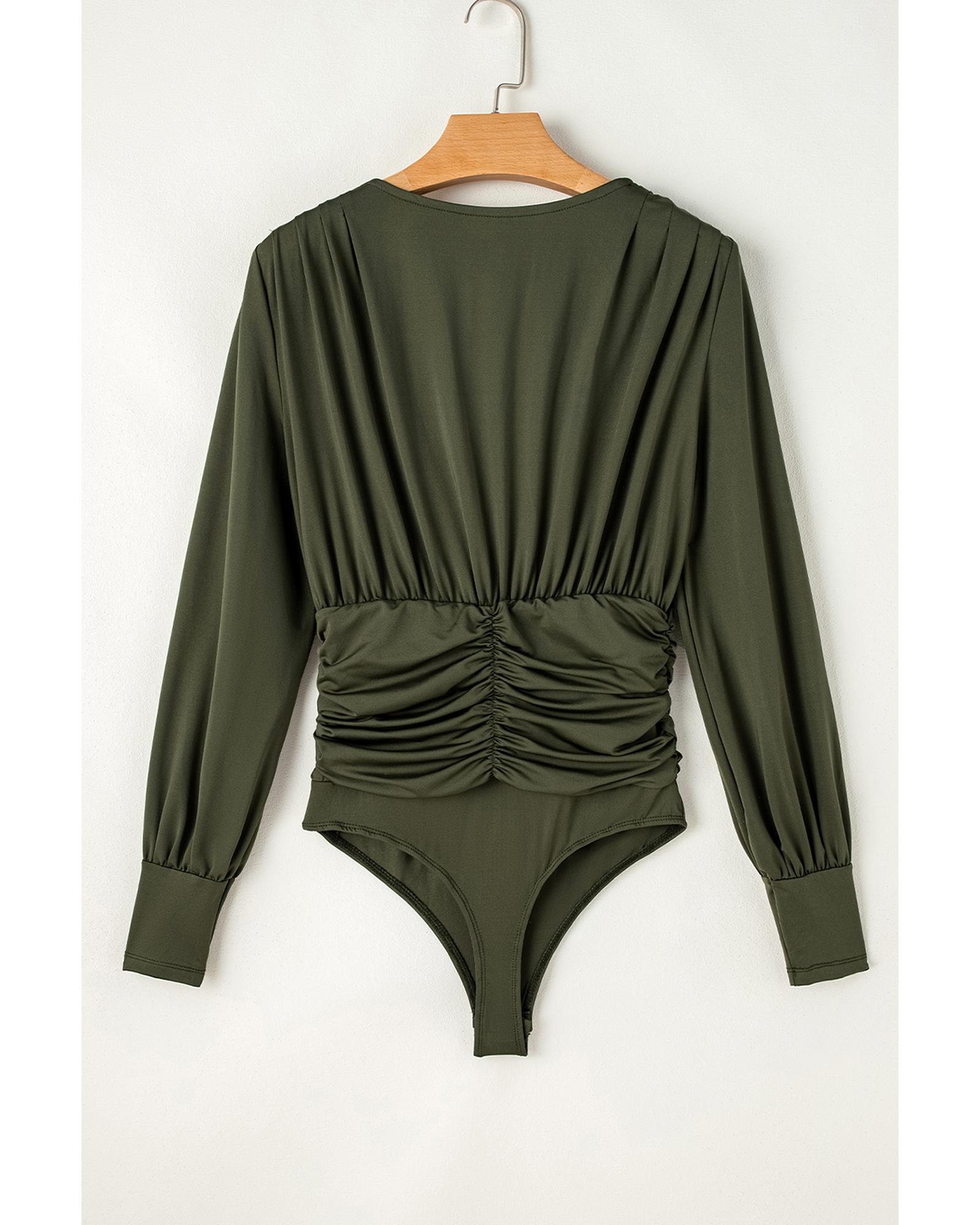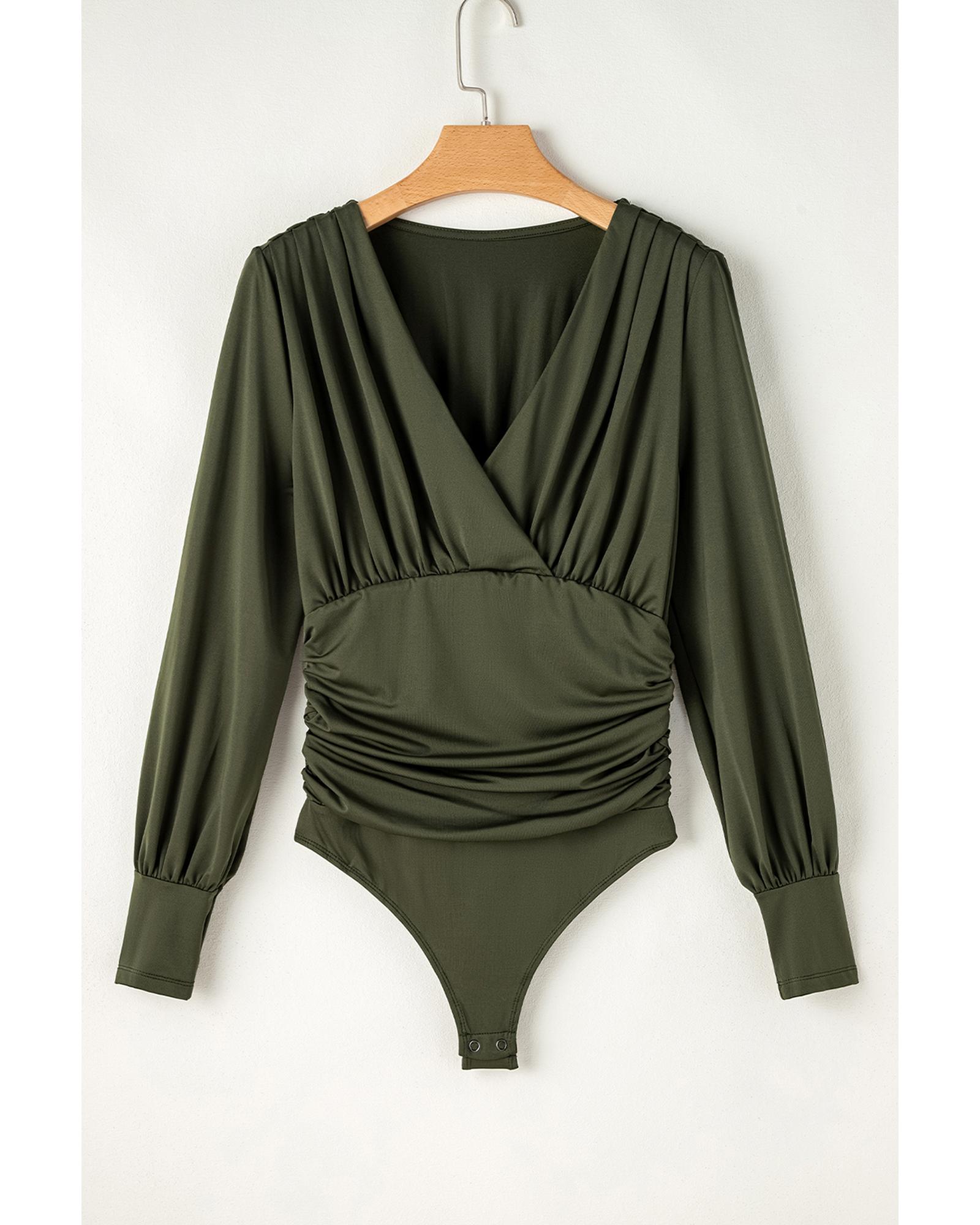 Moss Green Ruched Wrap V Neck Long Sleeve Bodysuit – S