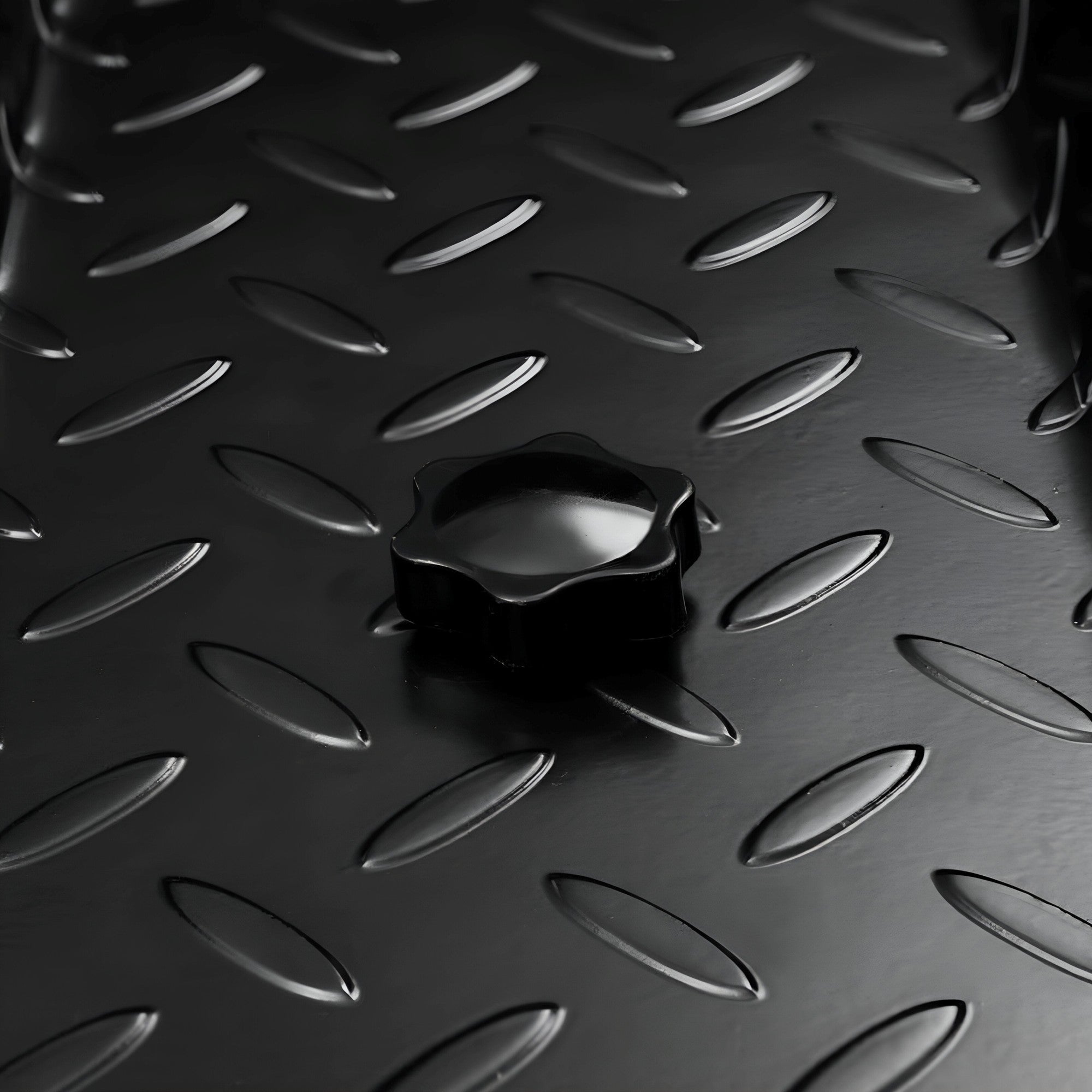 - An adjustable wheel chock prevents the motorcycle from slipping