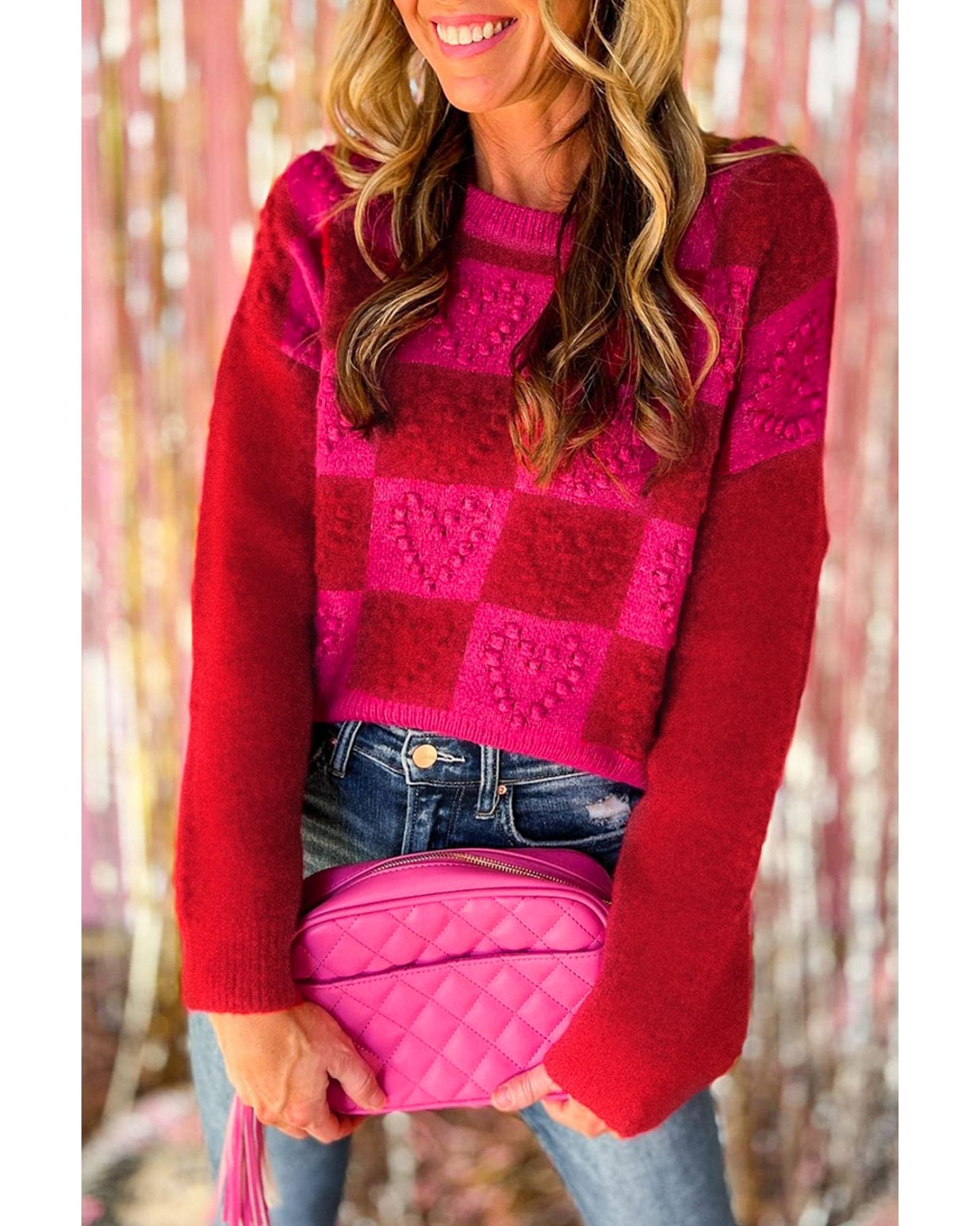Multicolor Checkered Pattern Heart Detail Textured Sweater – L