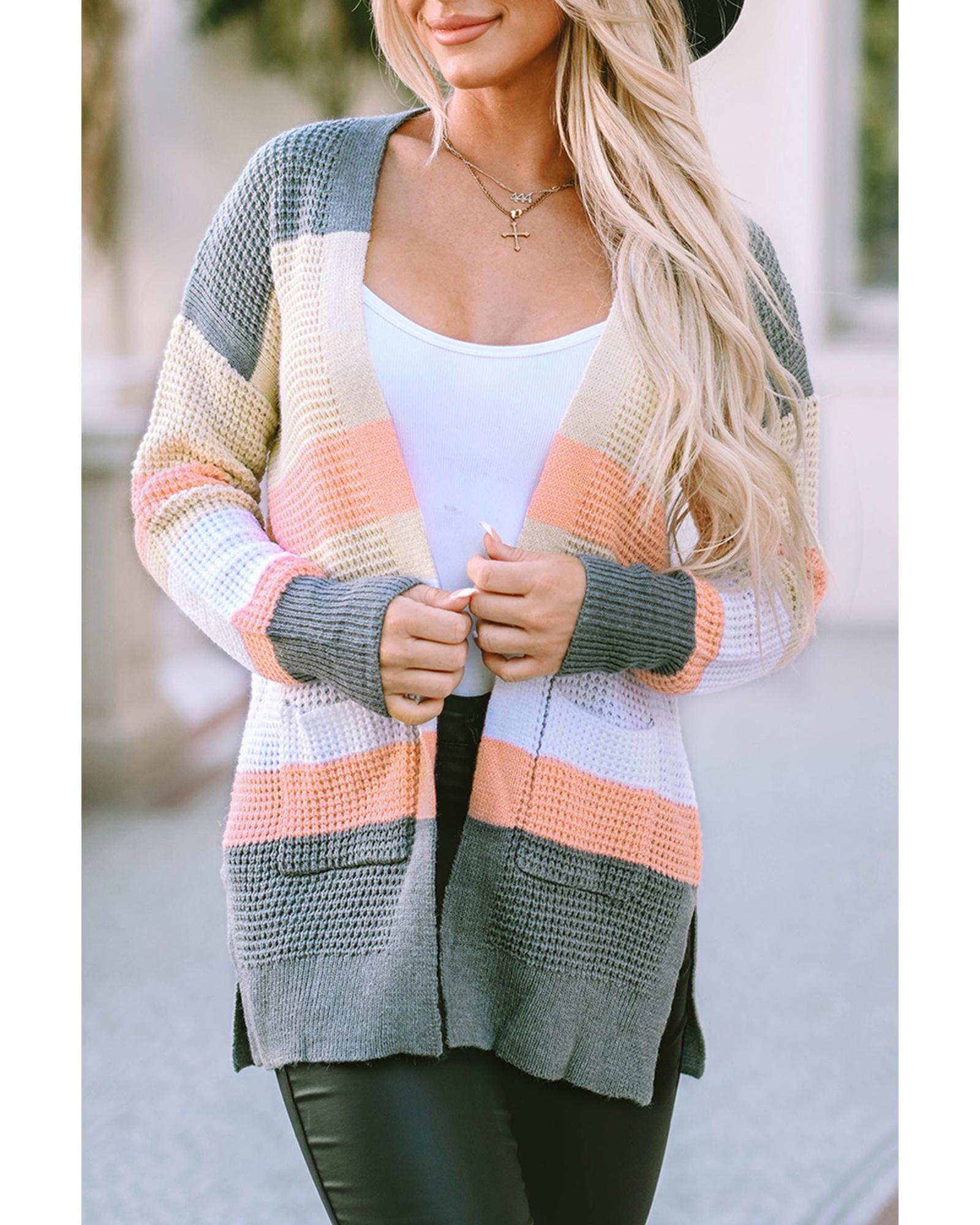 Multicolor Color Block Striped Pocketed Open Cardigan – M