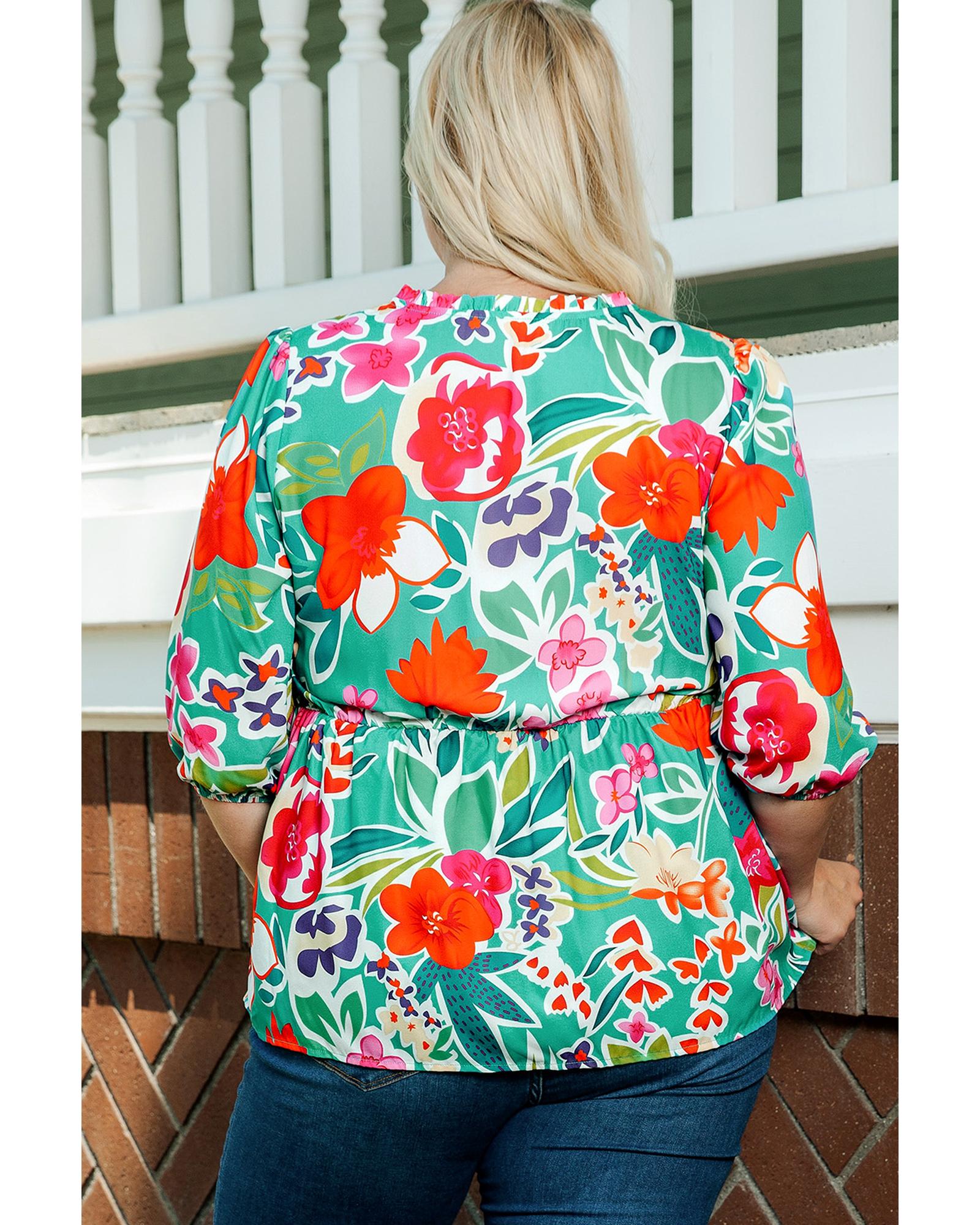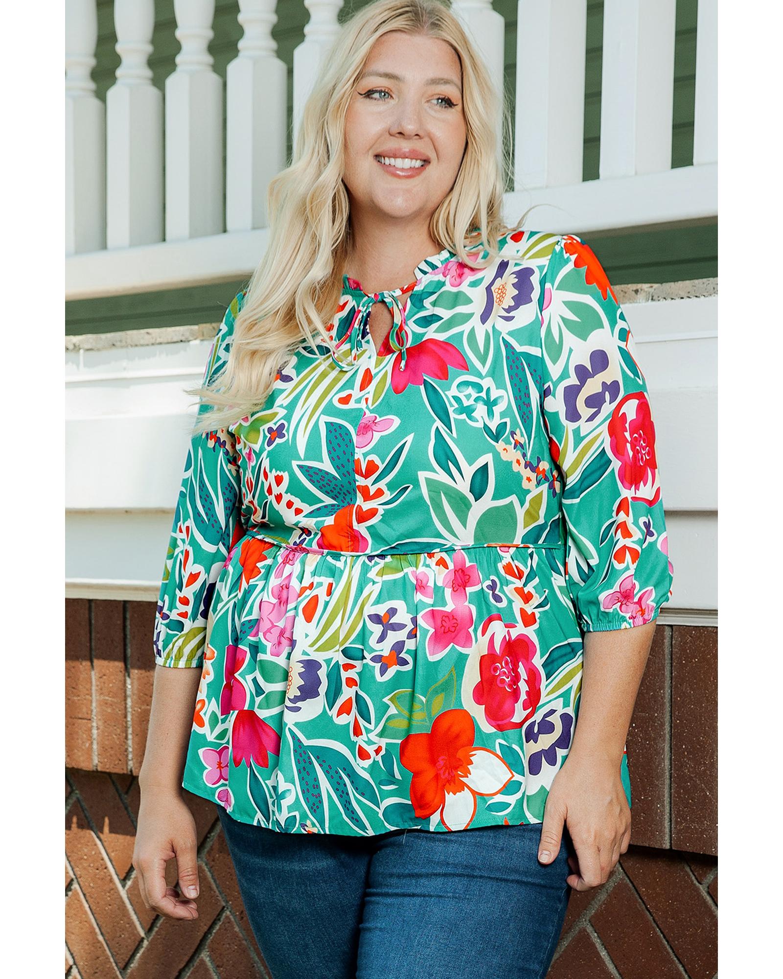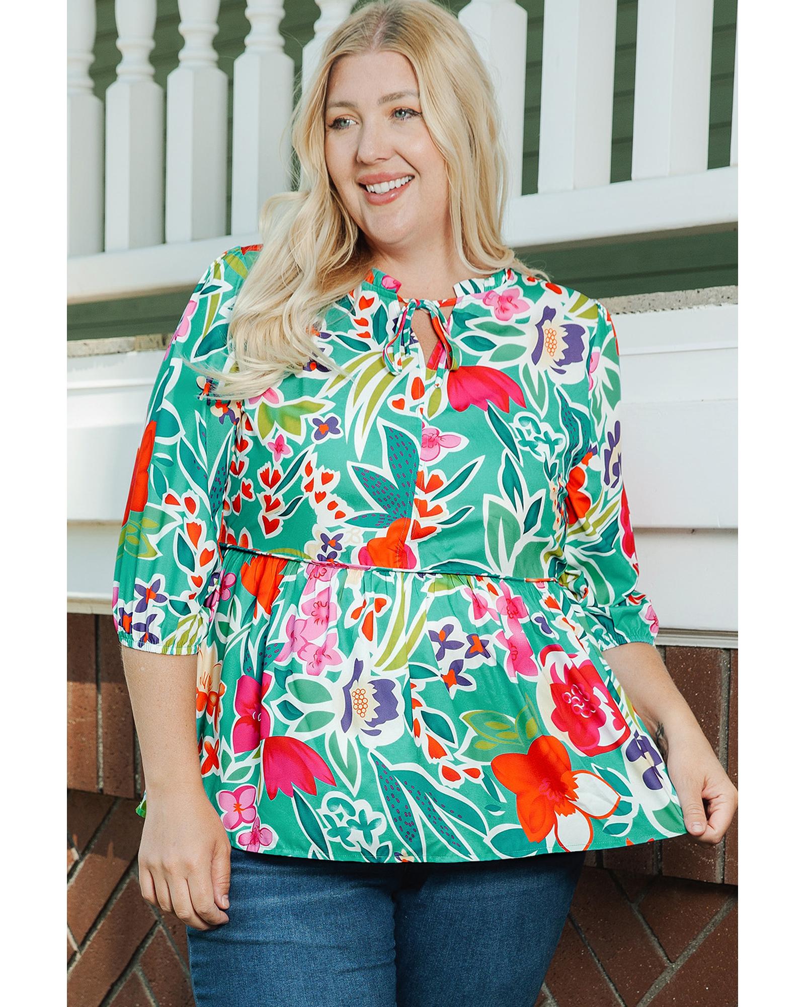 Multicolor Floral Tie Split Neck Plus Size Peplum Blouse – 1X