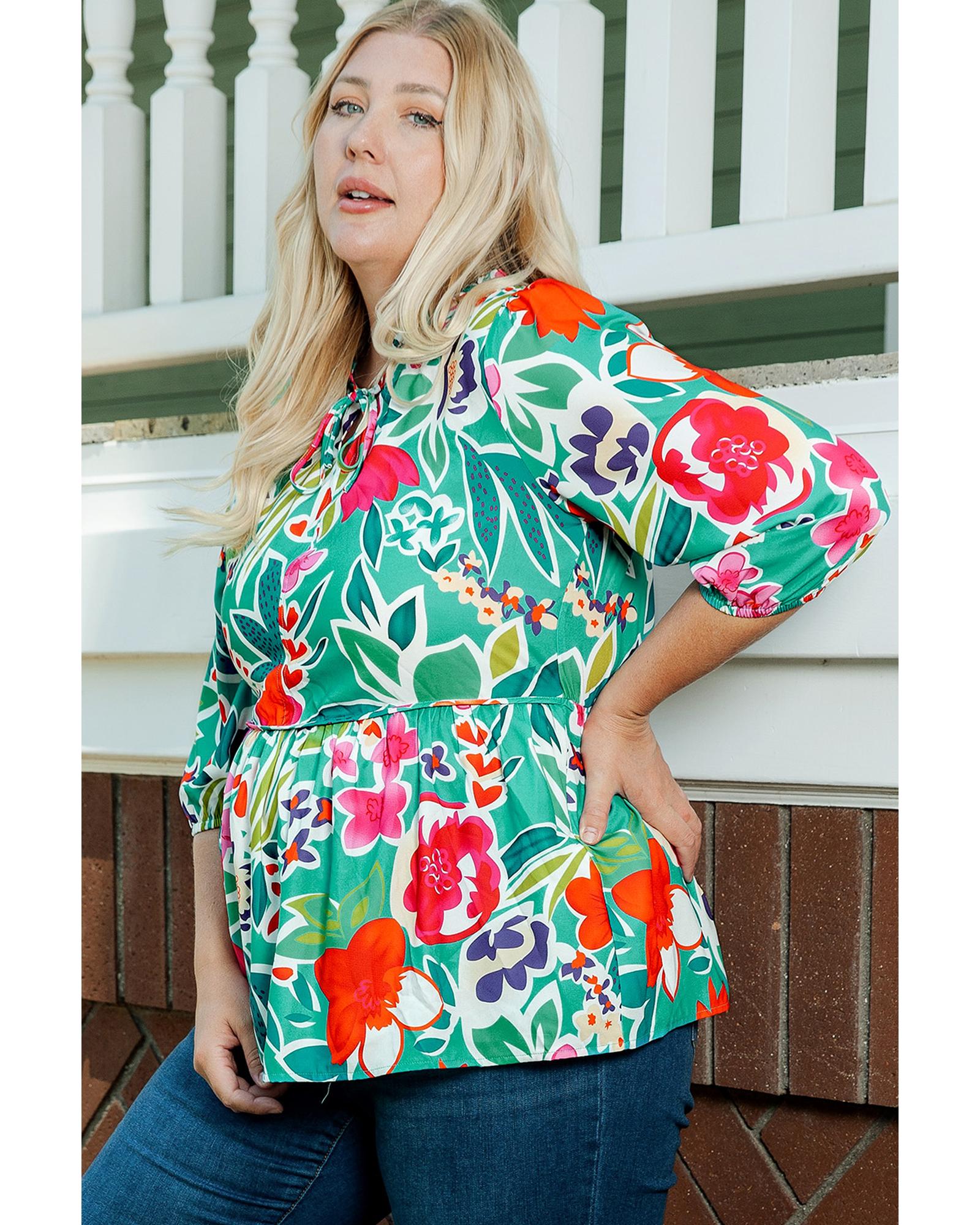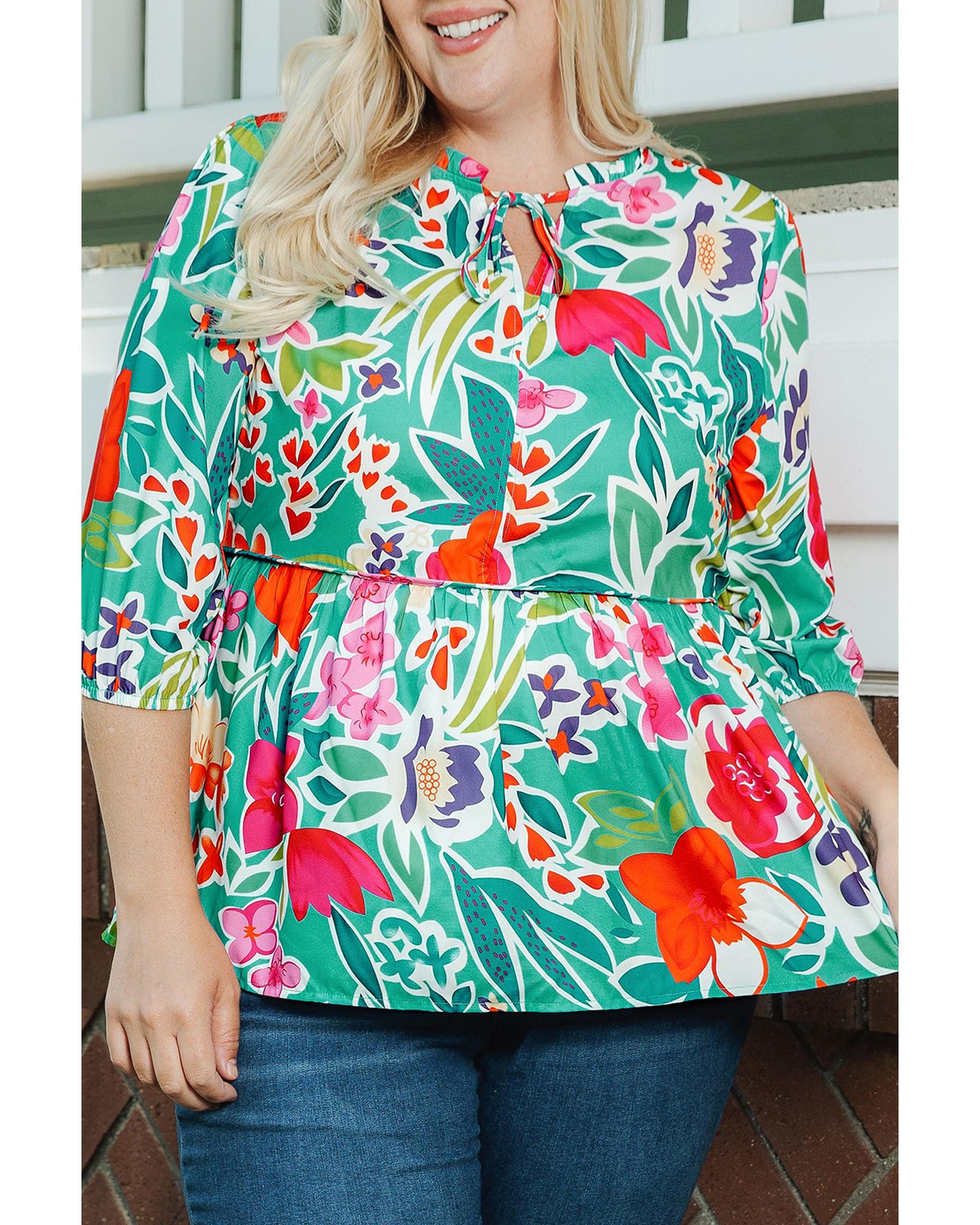Multicolor Floral Tie Split Neck Plus Size Peplum Blouse – 2X