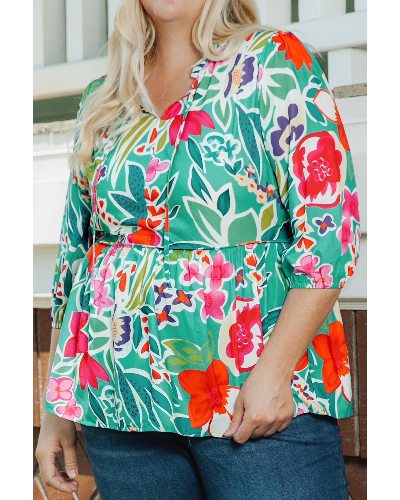 Green Floral Tied V Neck Long Sleeve Plus Size Babydoll Top - 1X