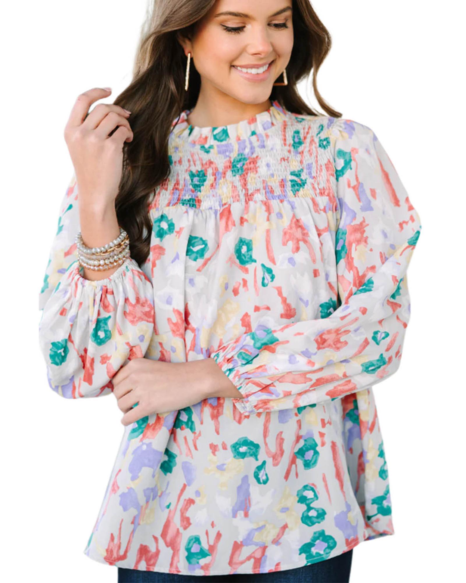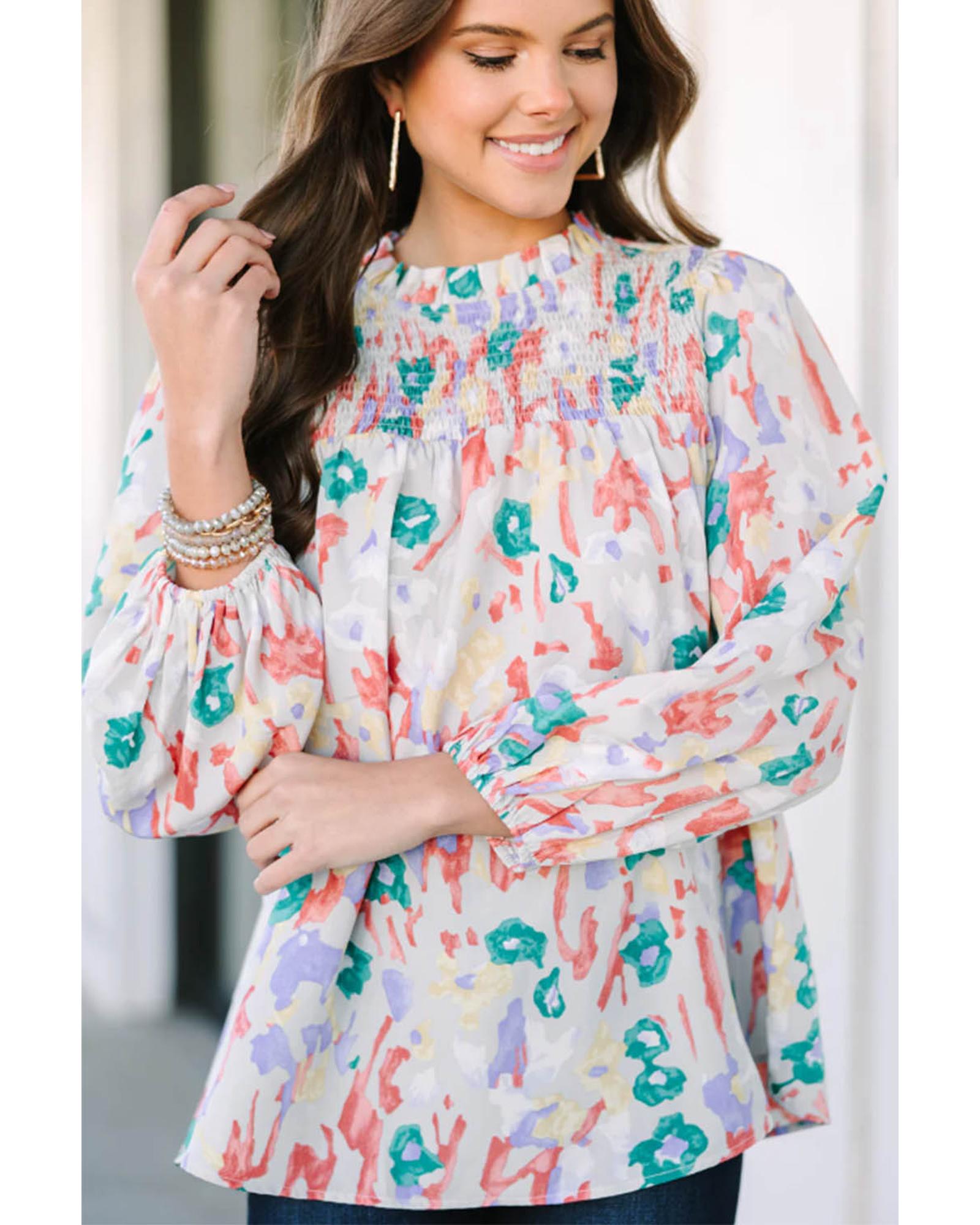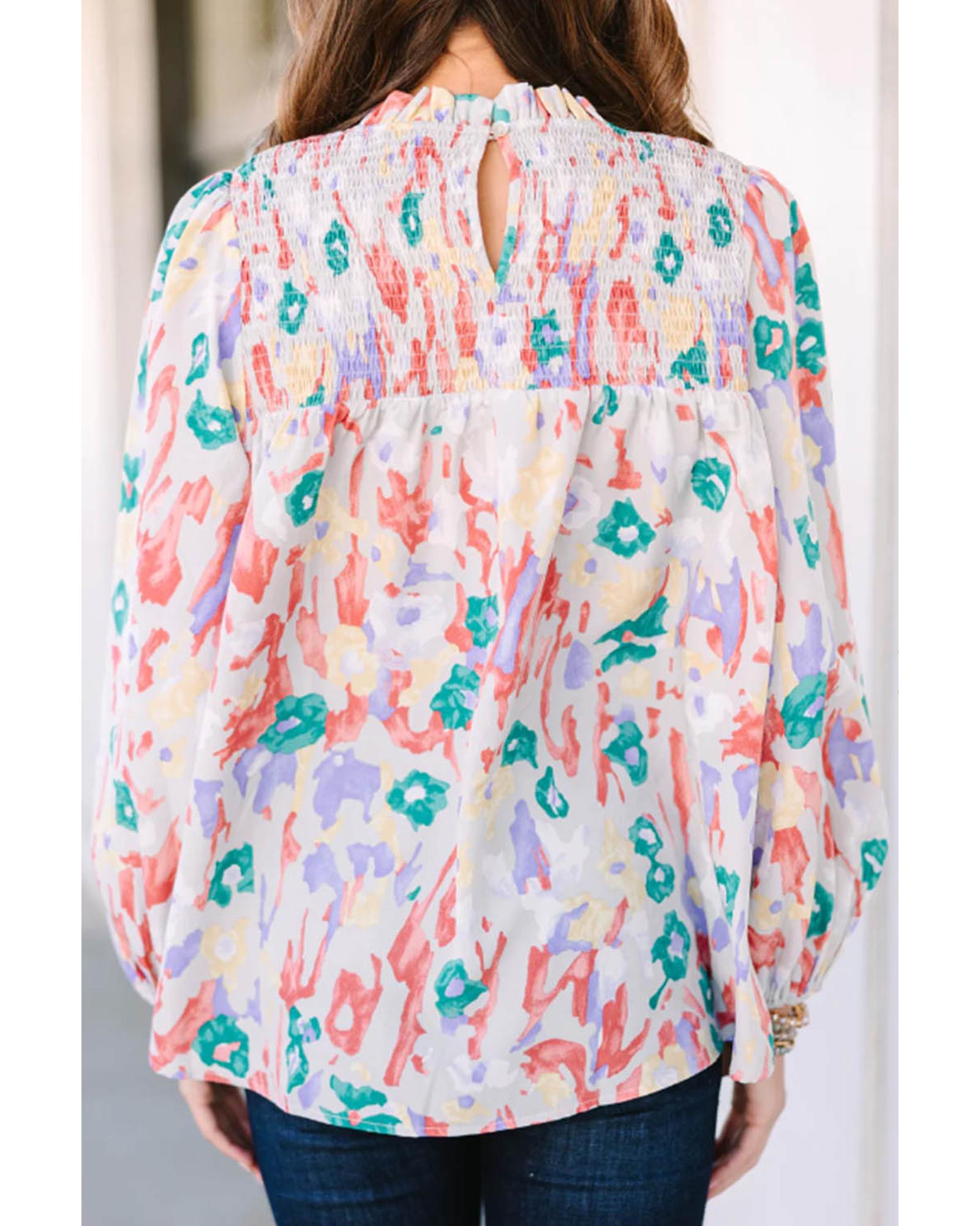 Multicolor Printed Frilled Neck Smocked Loose Blouse – XL