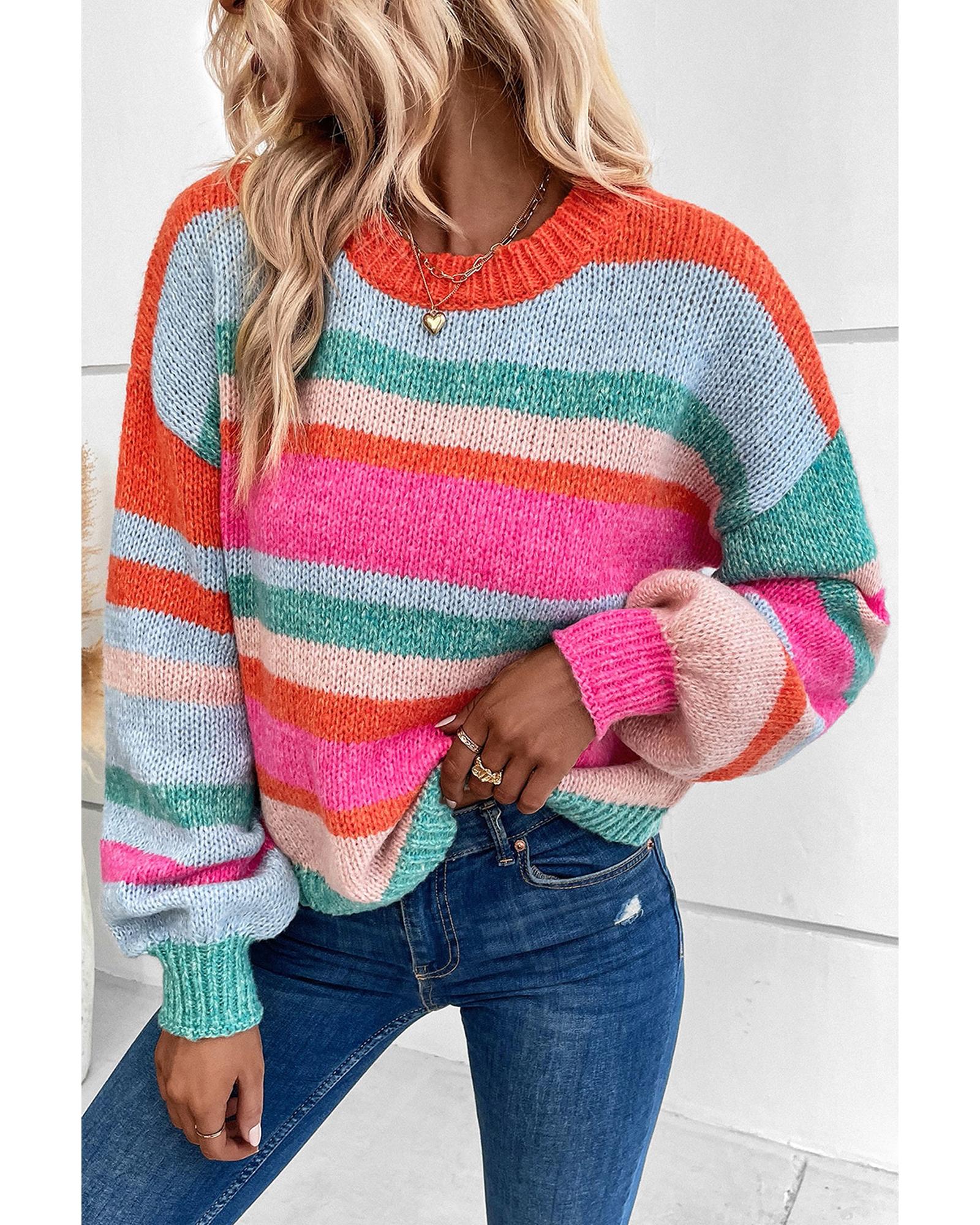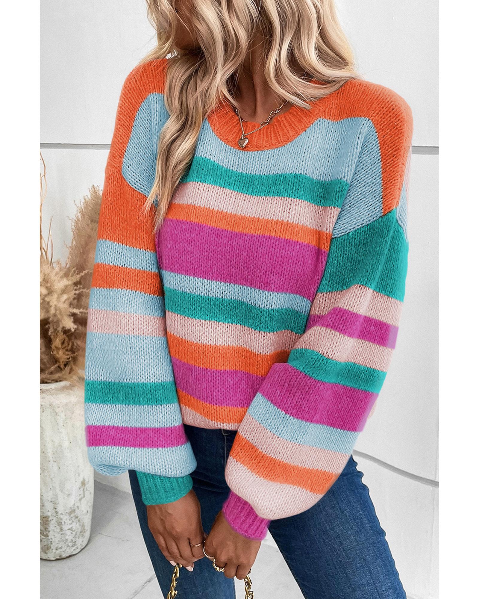 Multicolor Striped Knit Drop Shoulder Puff Sleeve Sweater – L