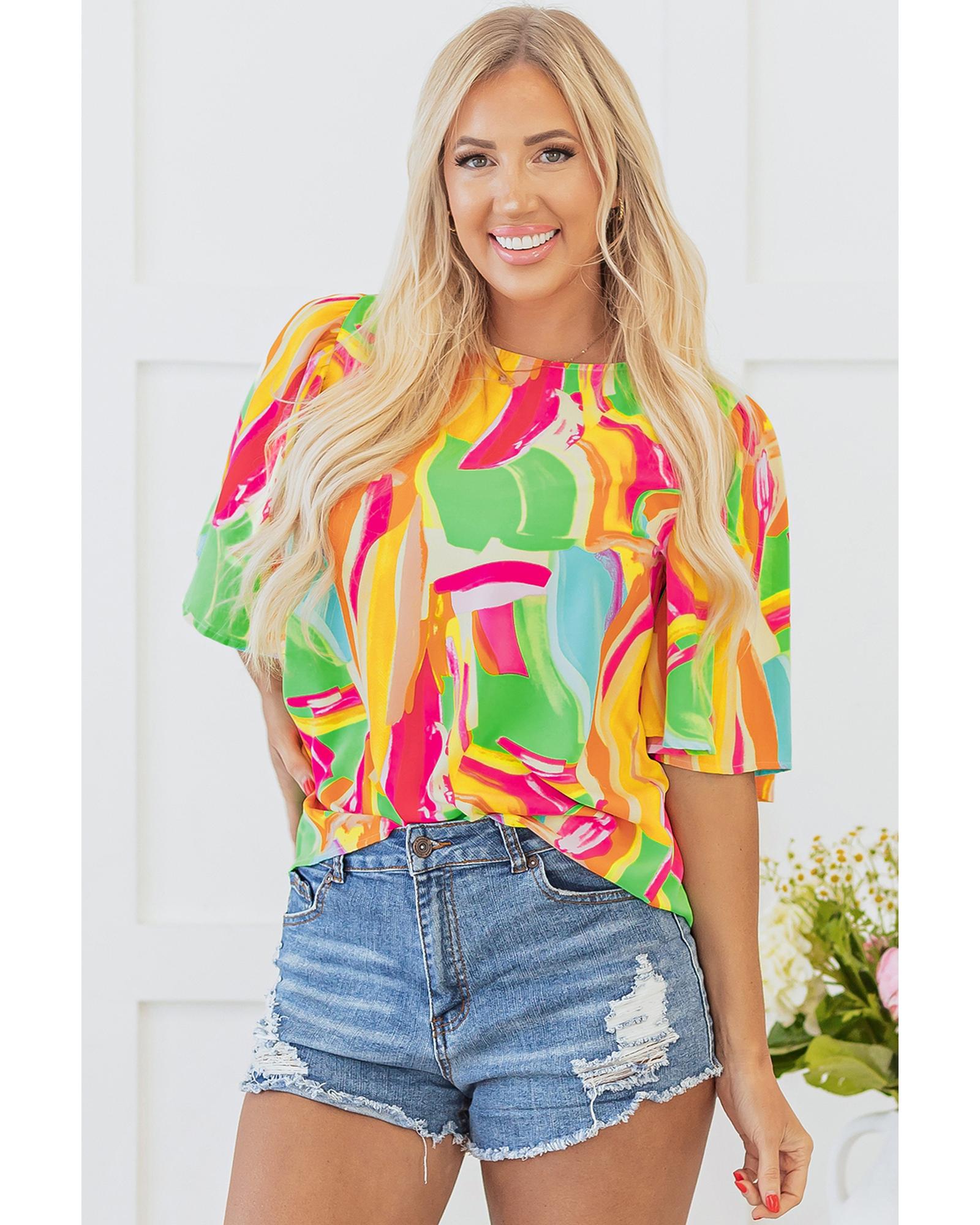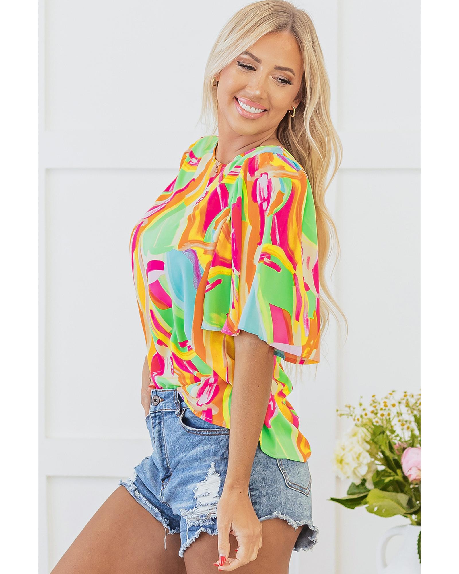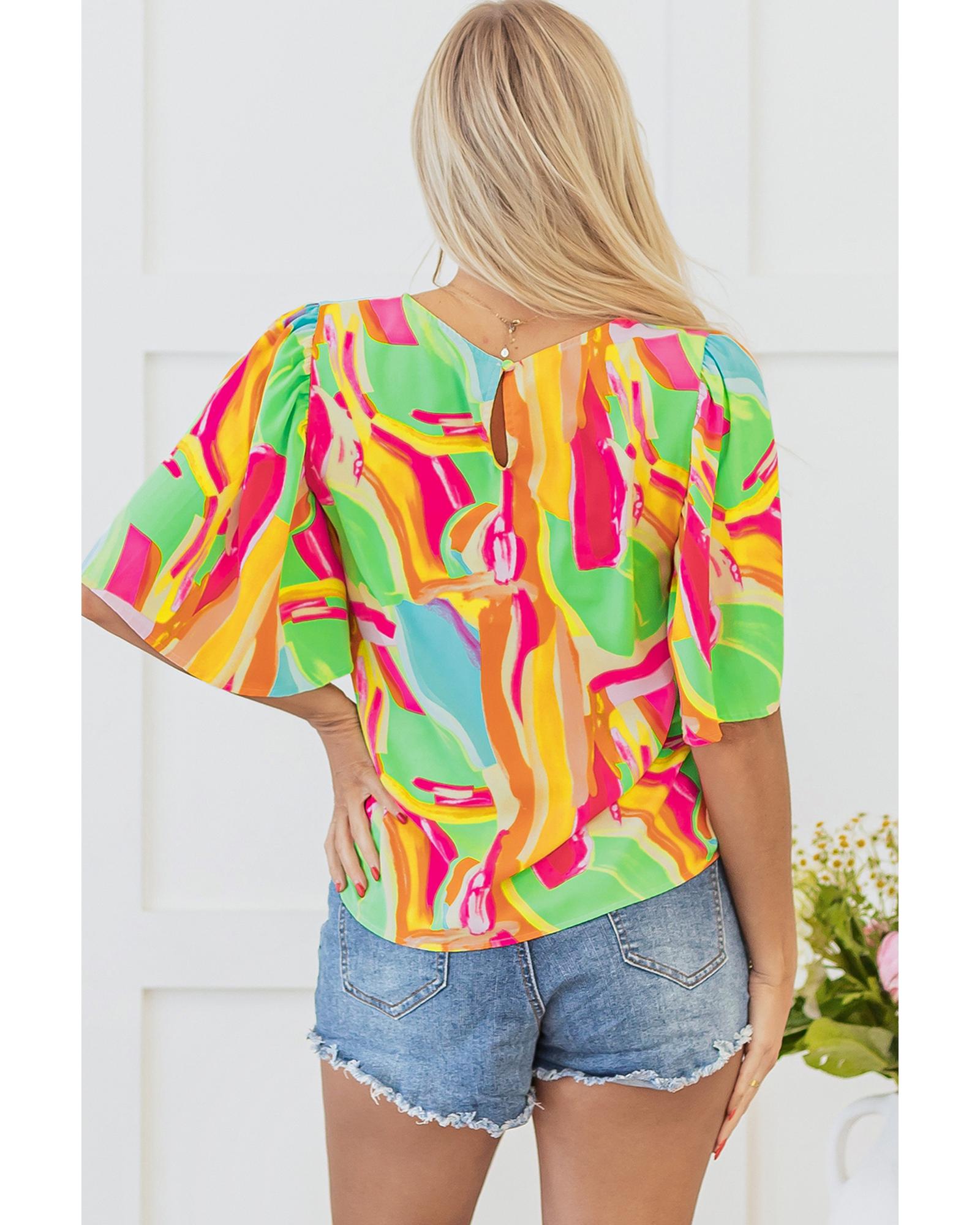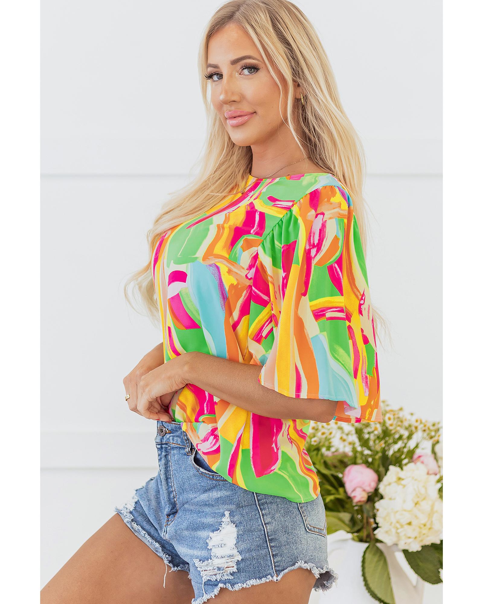 Multicolour Abstract Print Keyhole Back Pleated Half Sleeve Blouse – S
