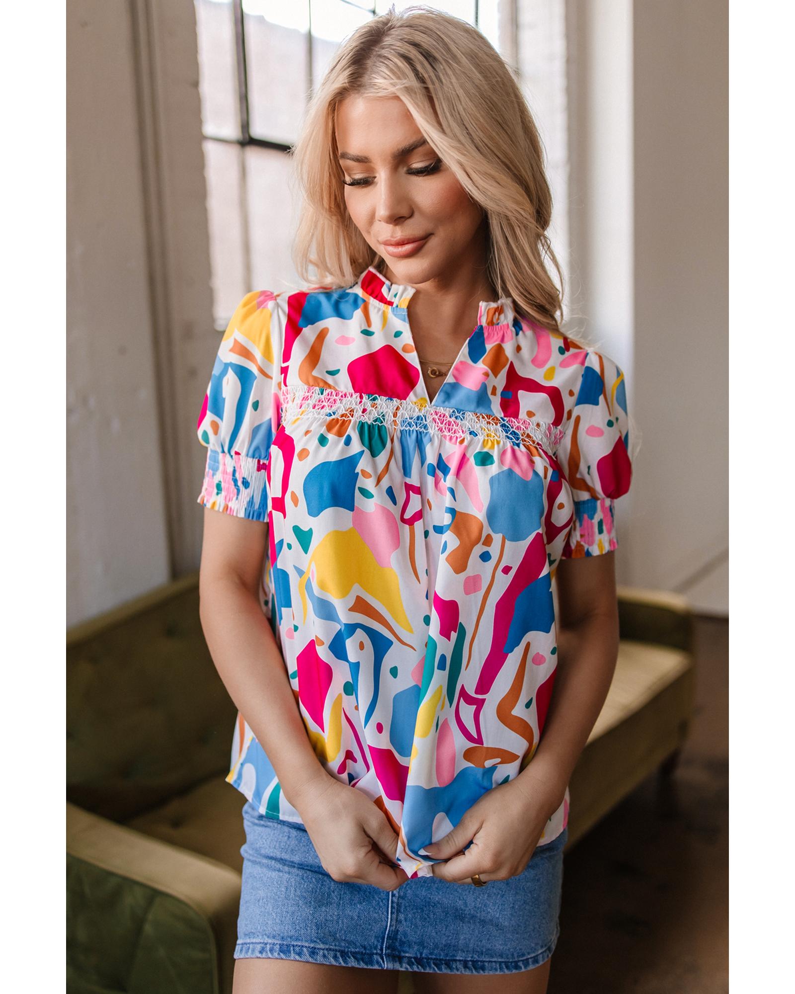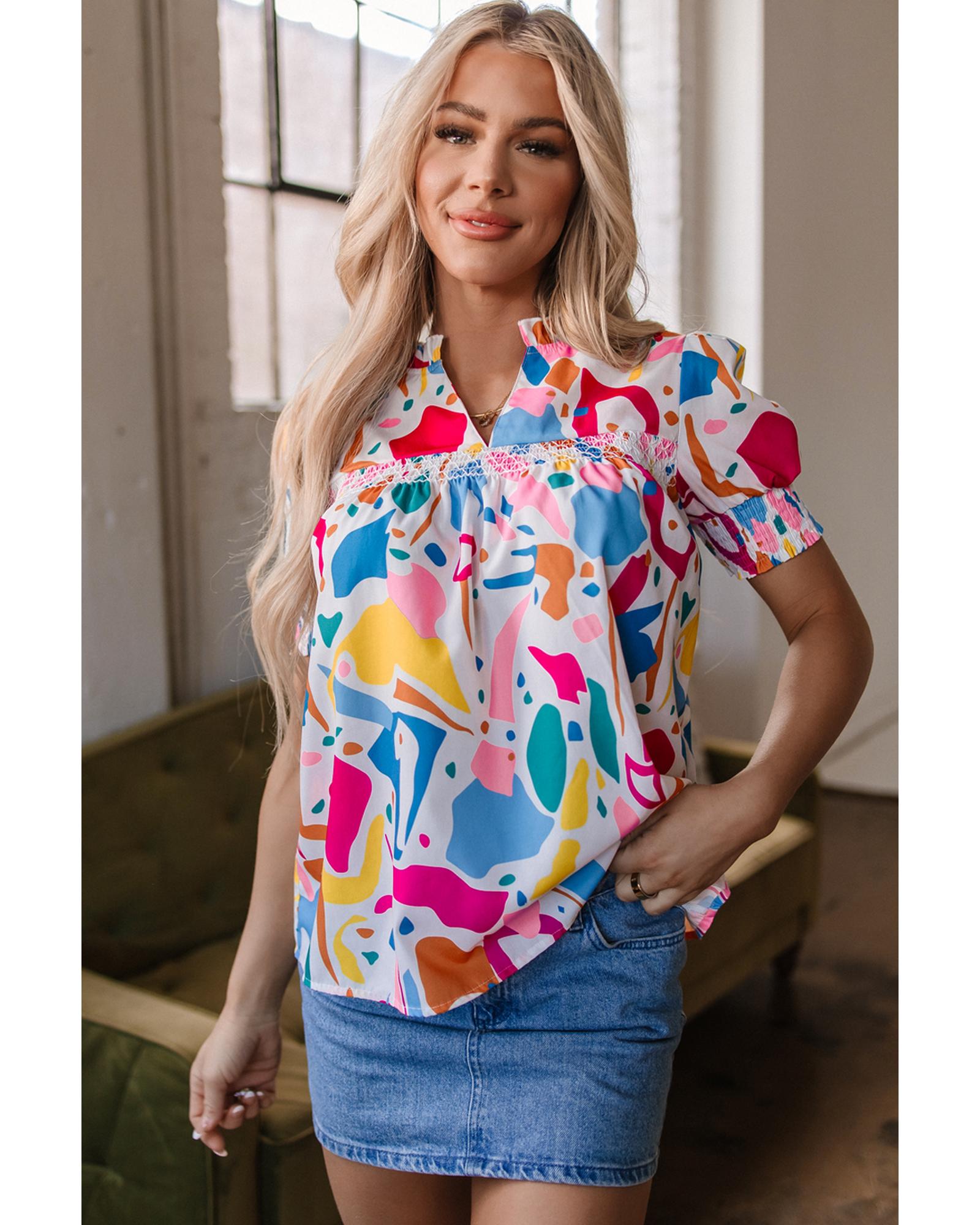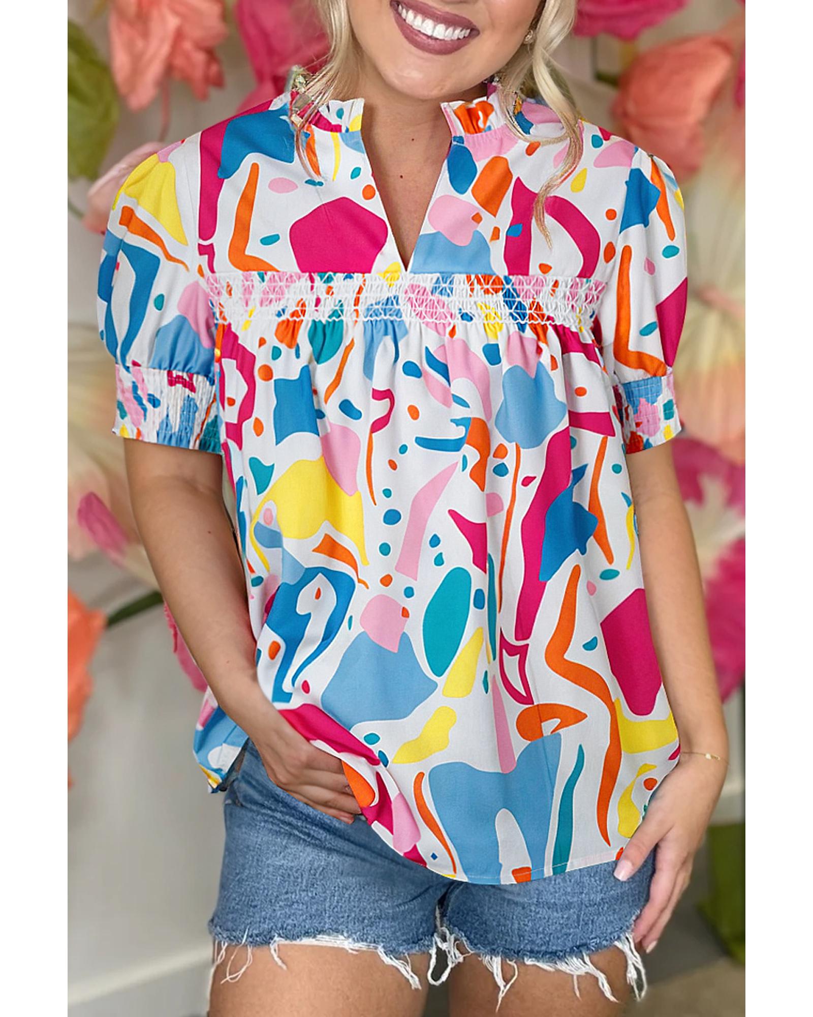 Multicolour Abstract Print Lace Detail Shirred Short Sleeve Split Neck Blouse – M