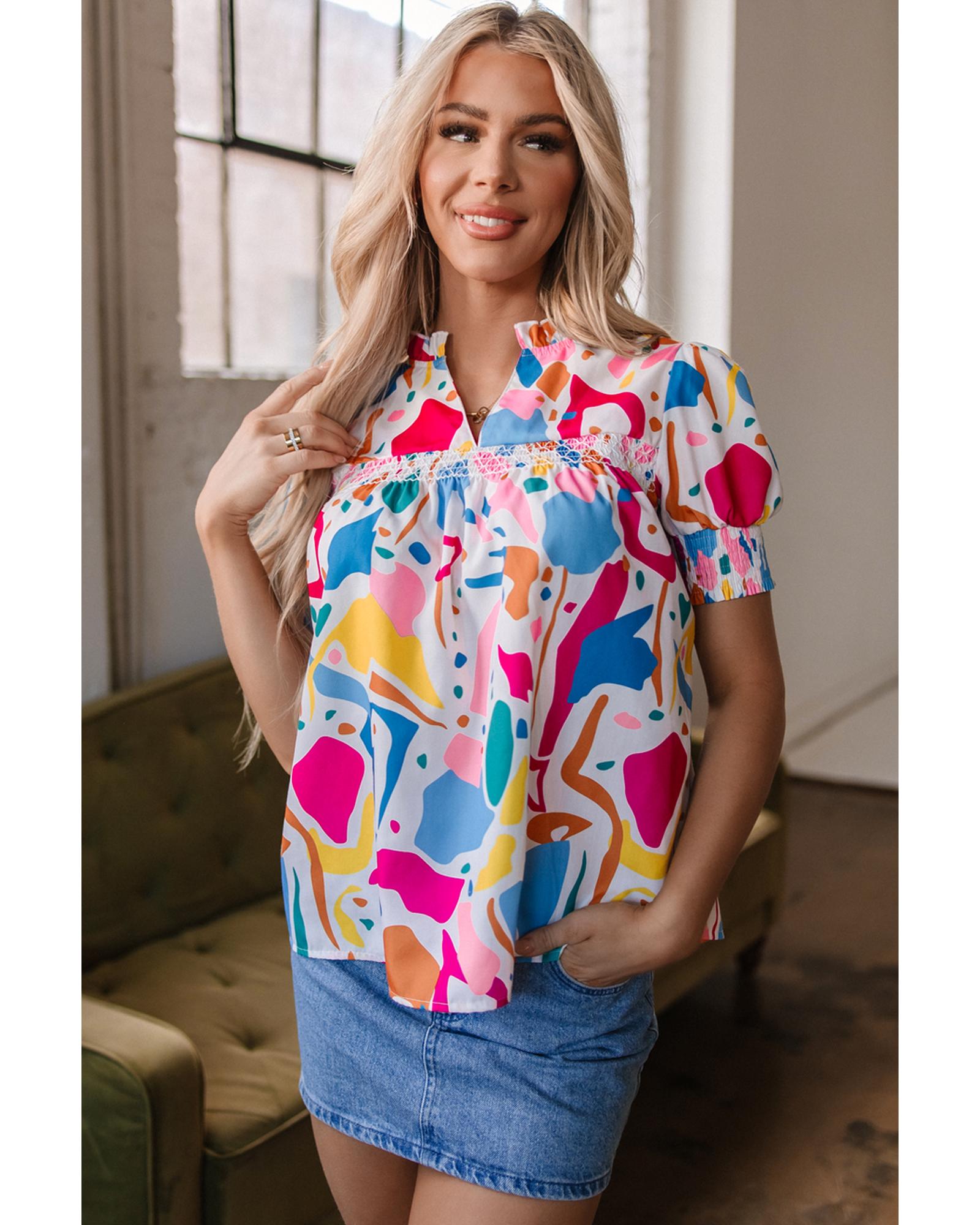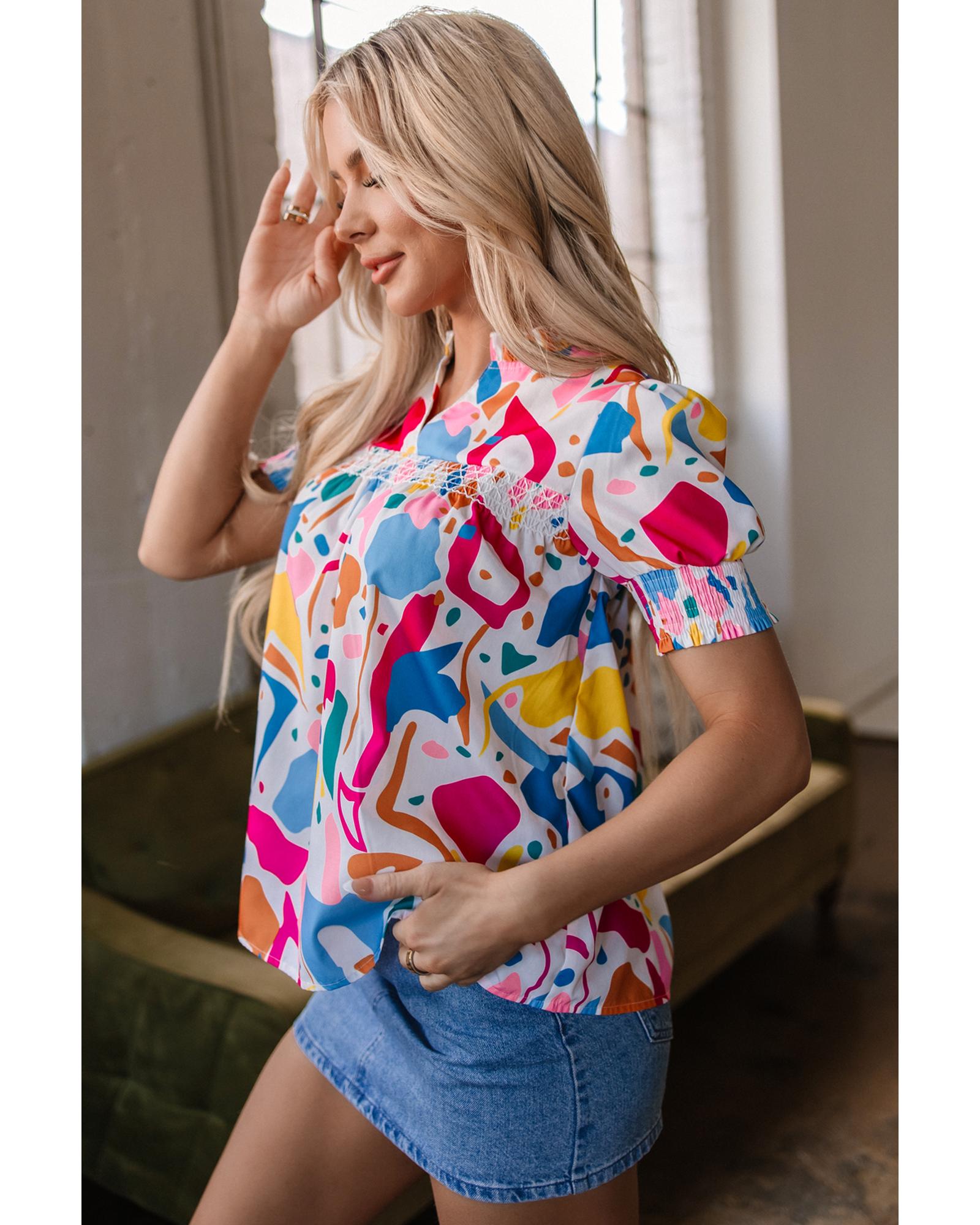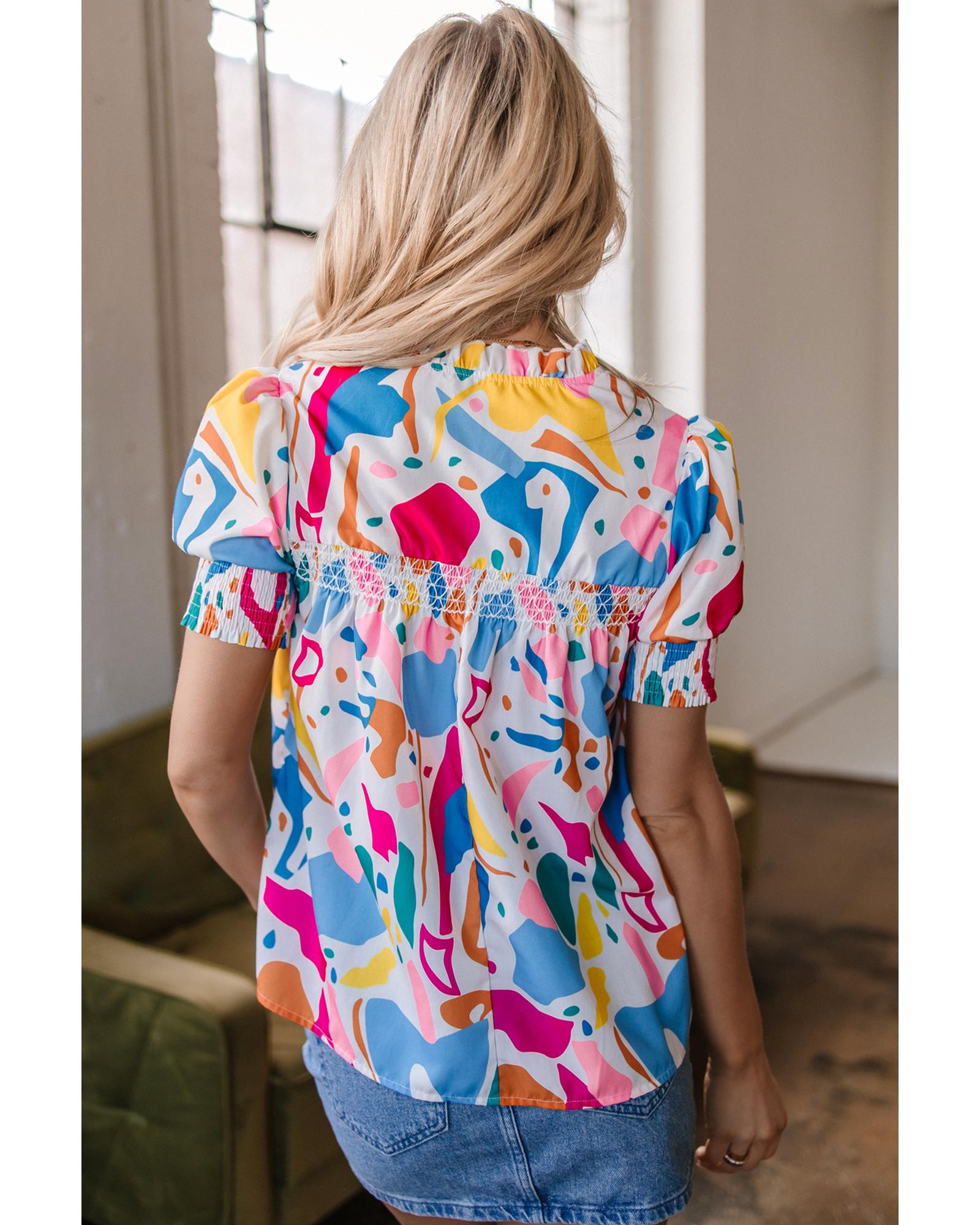 Multicolour Abstract Print Lace Detail Shirred Short Sleeve Split Neck Blouse – M