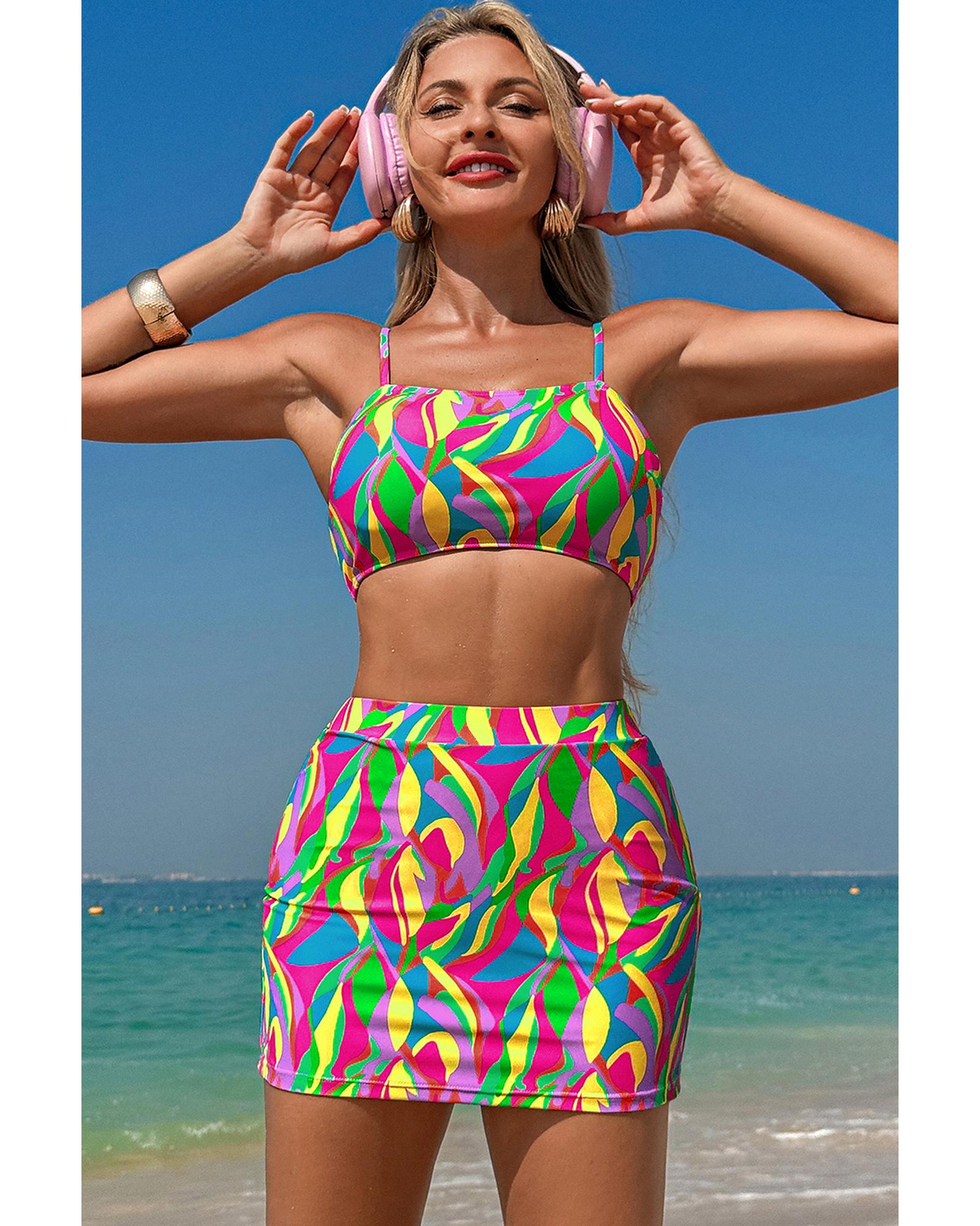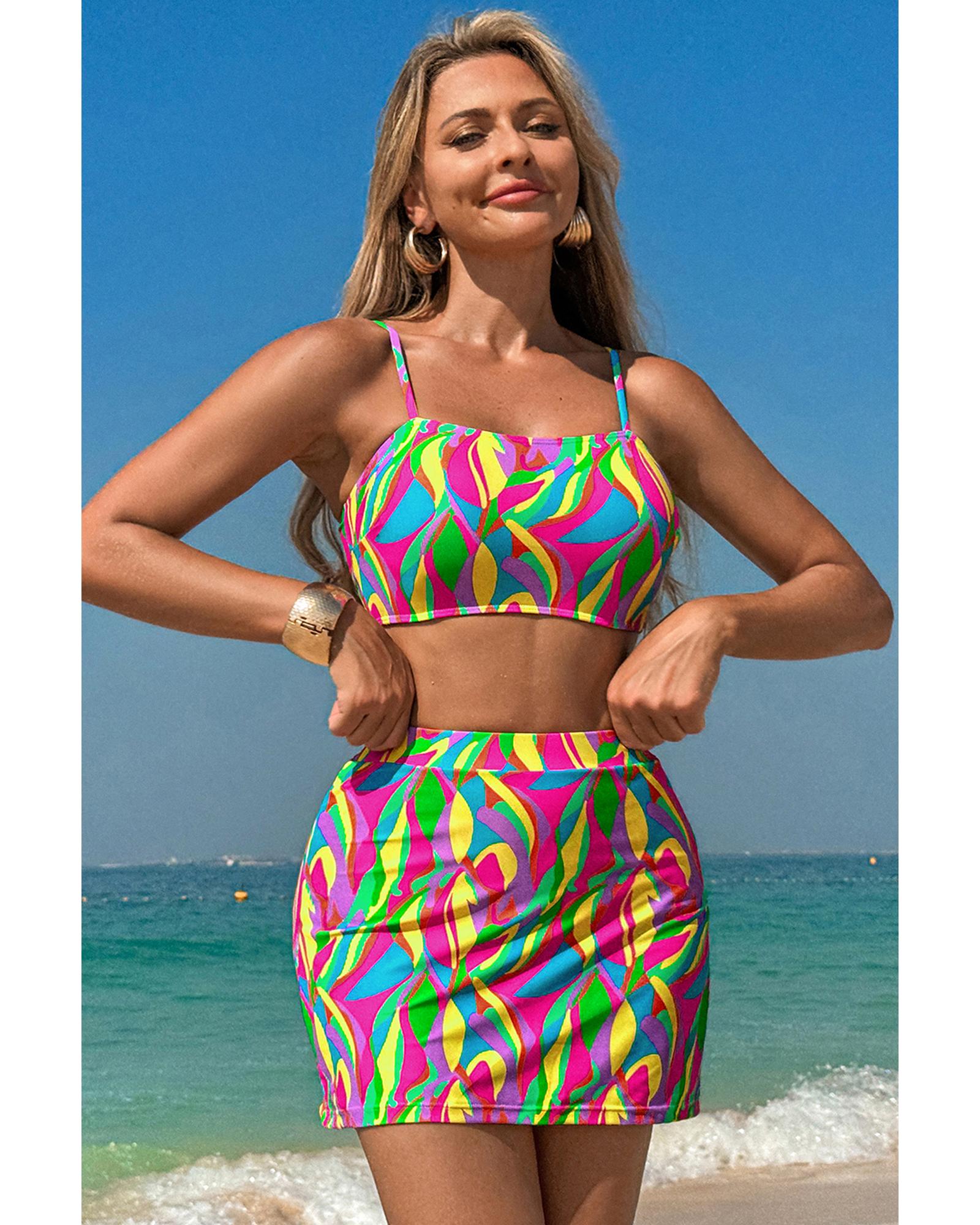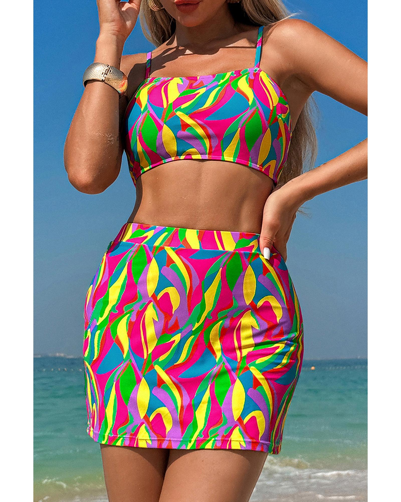 Multicolour Abstract Print Textured Spaghetti Strap High Waist Bikini Set – S