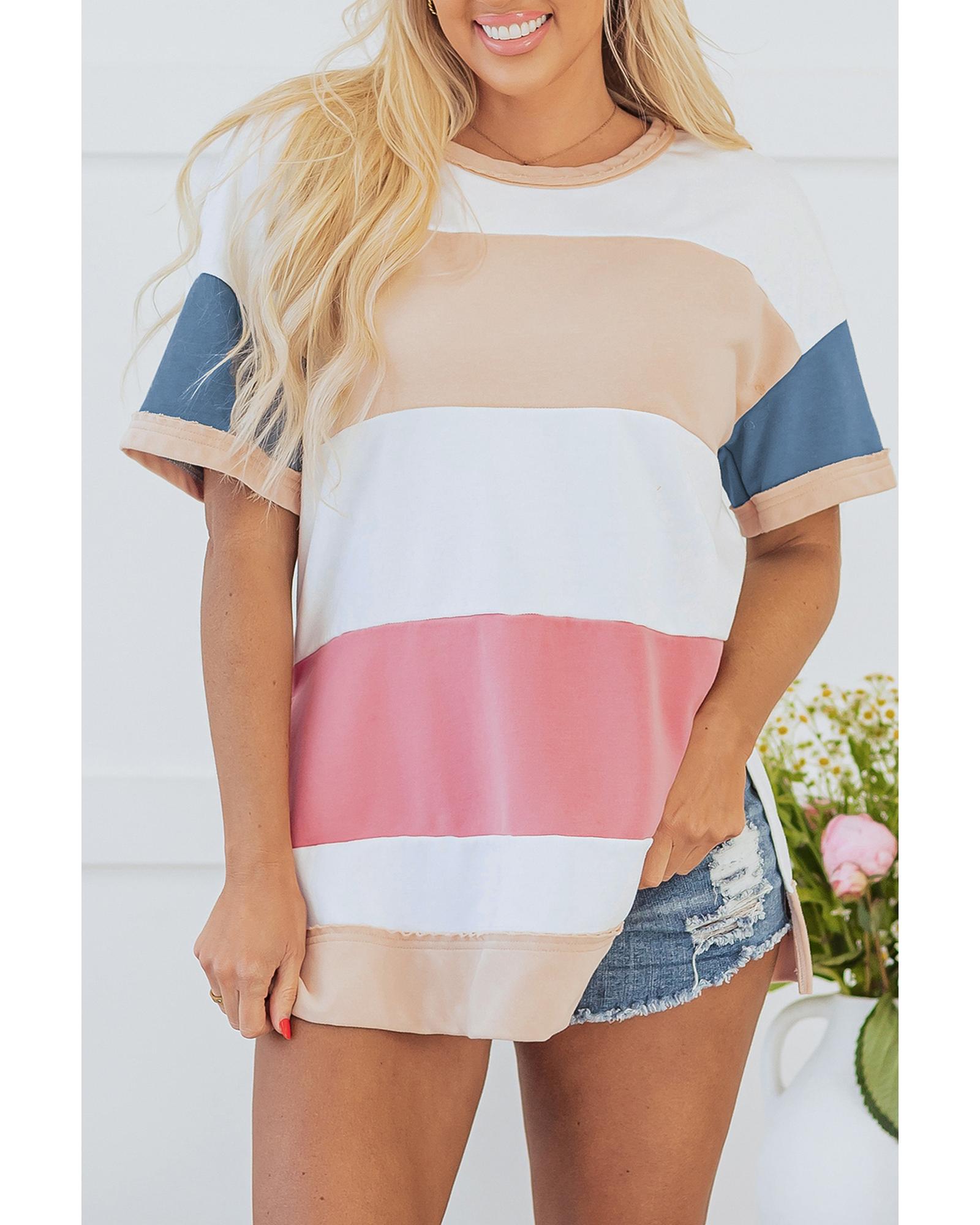 Multicolour Colorblock Patchwork Side Split Tunic T Shirt – M
