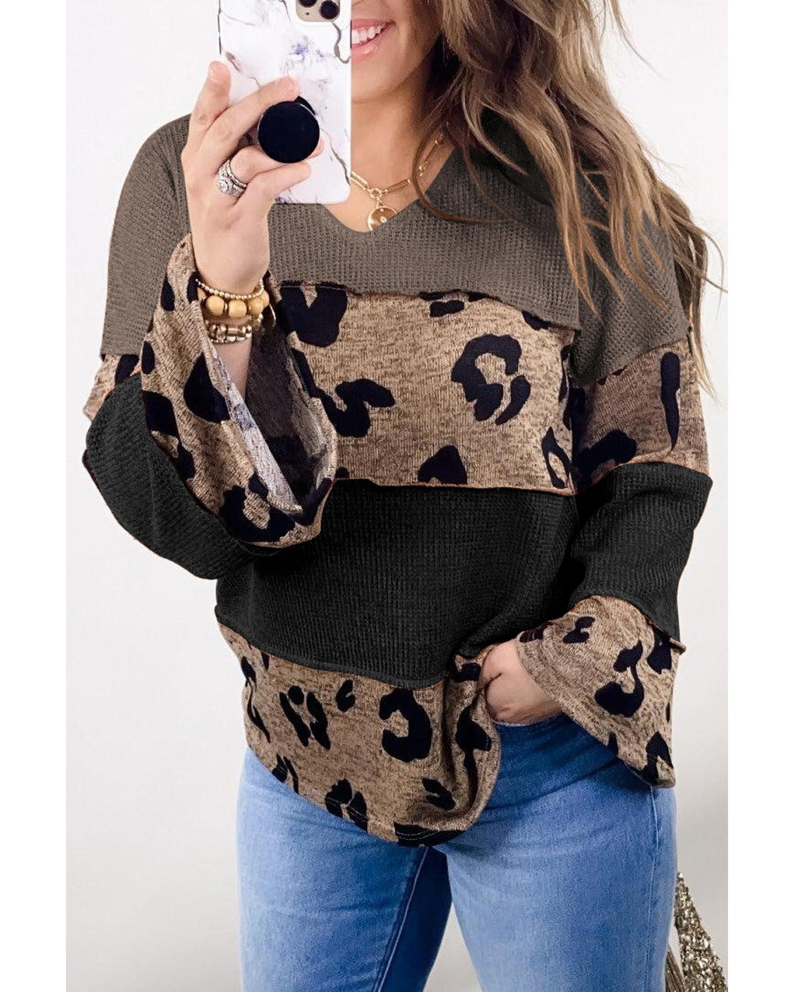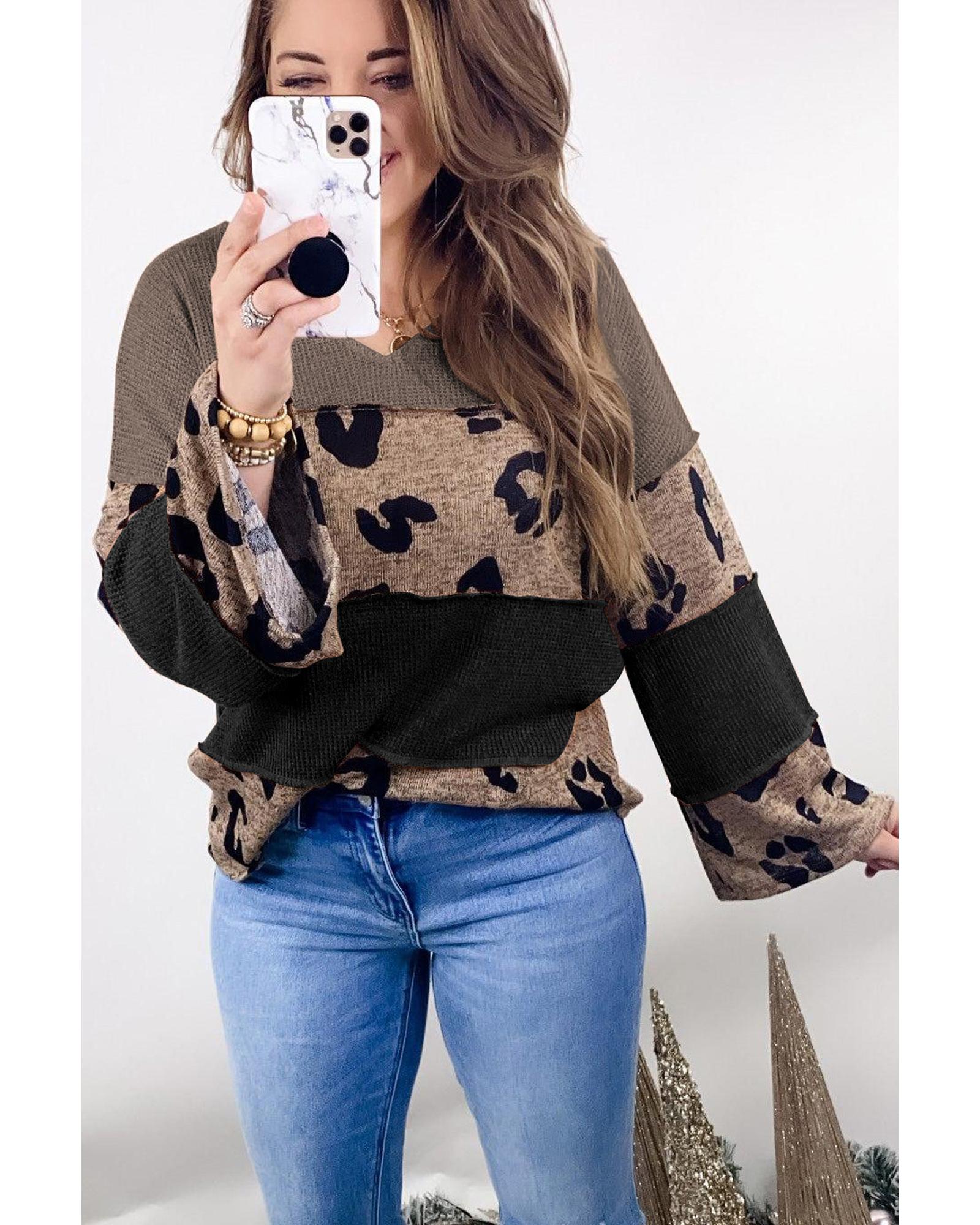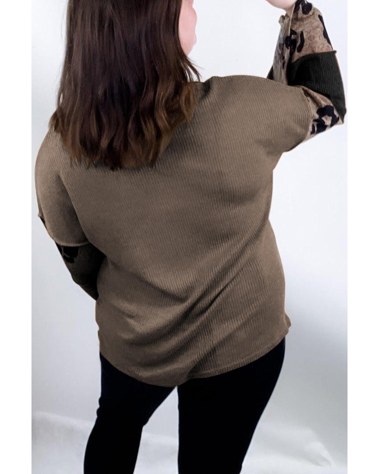 Khaki Leopard Patchwork Knitted Puff Sleeve Sweater - M