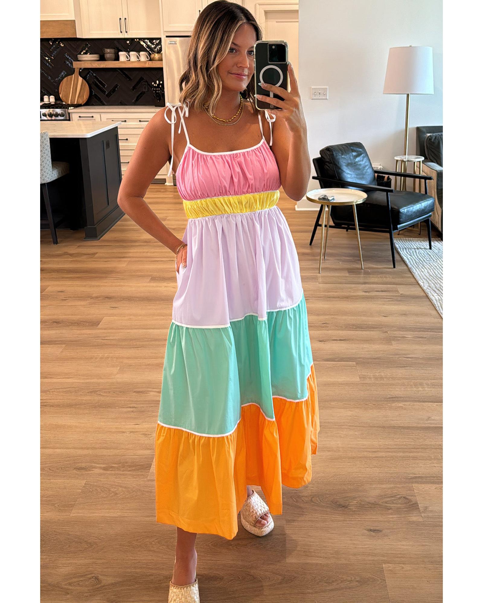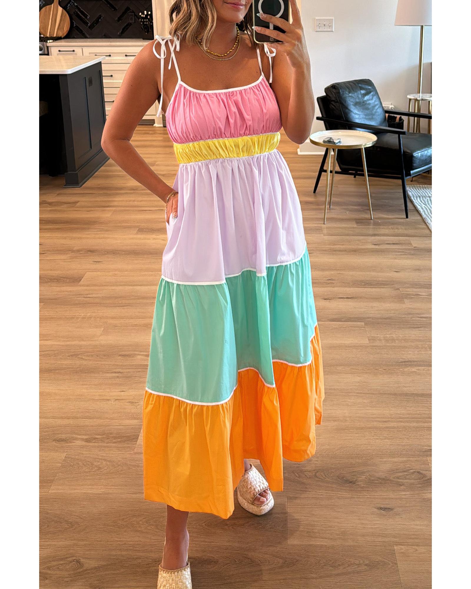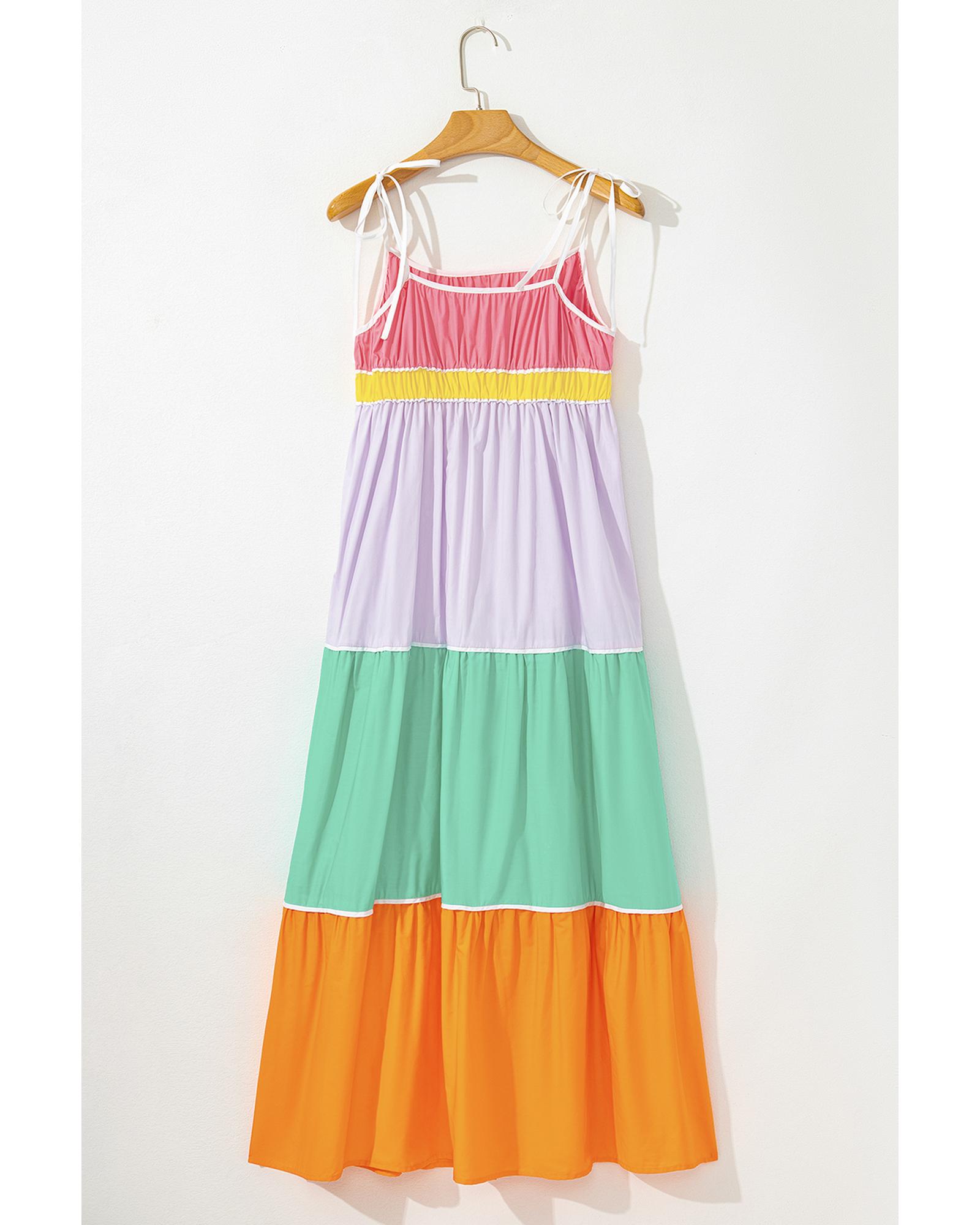 Multicolour Colorblock Self-tie Straps High Waist Flowy Maxi Dress with Pockets – L