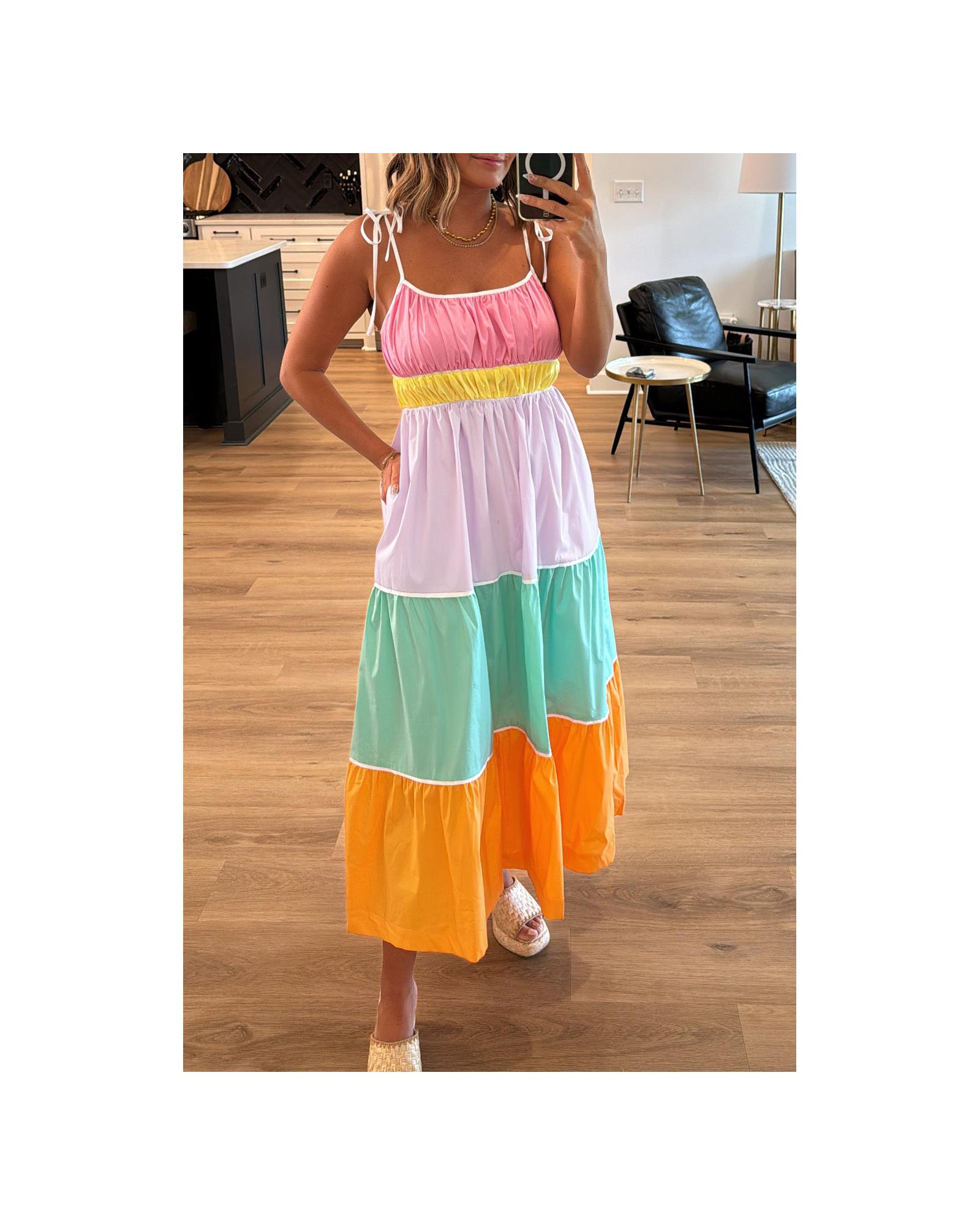 Multicolour Colorblock Self-tie Straps High Waist Flowy Maxi Dress with Pockets – M