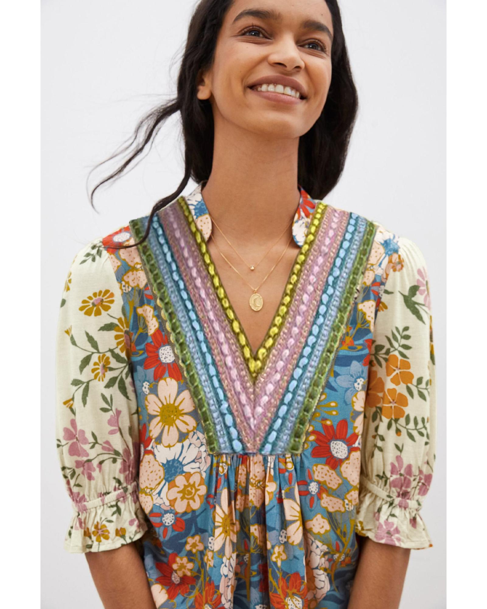 Multicolour Crochet V Neck Half Sleeve Boho Floral Blouse – M
