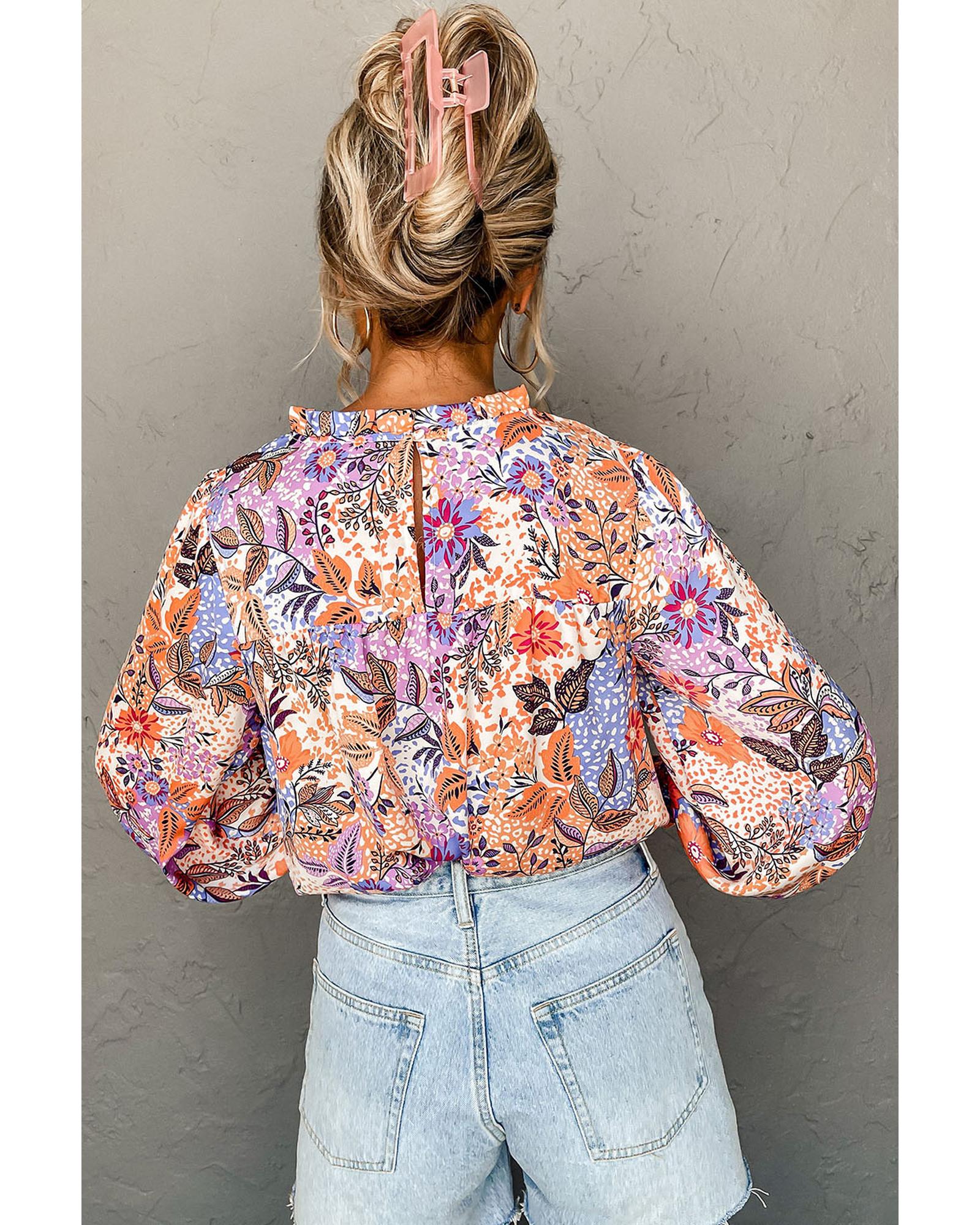 Sophisticated multicolour floral blouse Round neck and long bishop sleeves with ruffle trims Keyhole at the back with button closure for easy wearing Versatile piece to pair with jeans skirts or shorts Stunning floral design for a fashionable look - Material: 100% Viscose