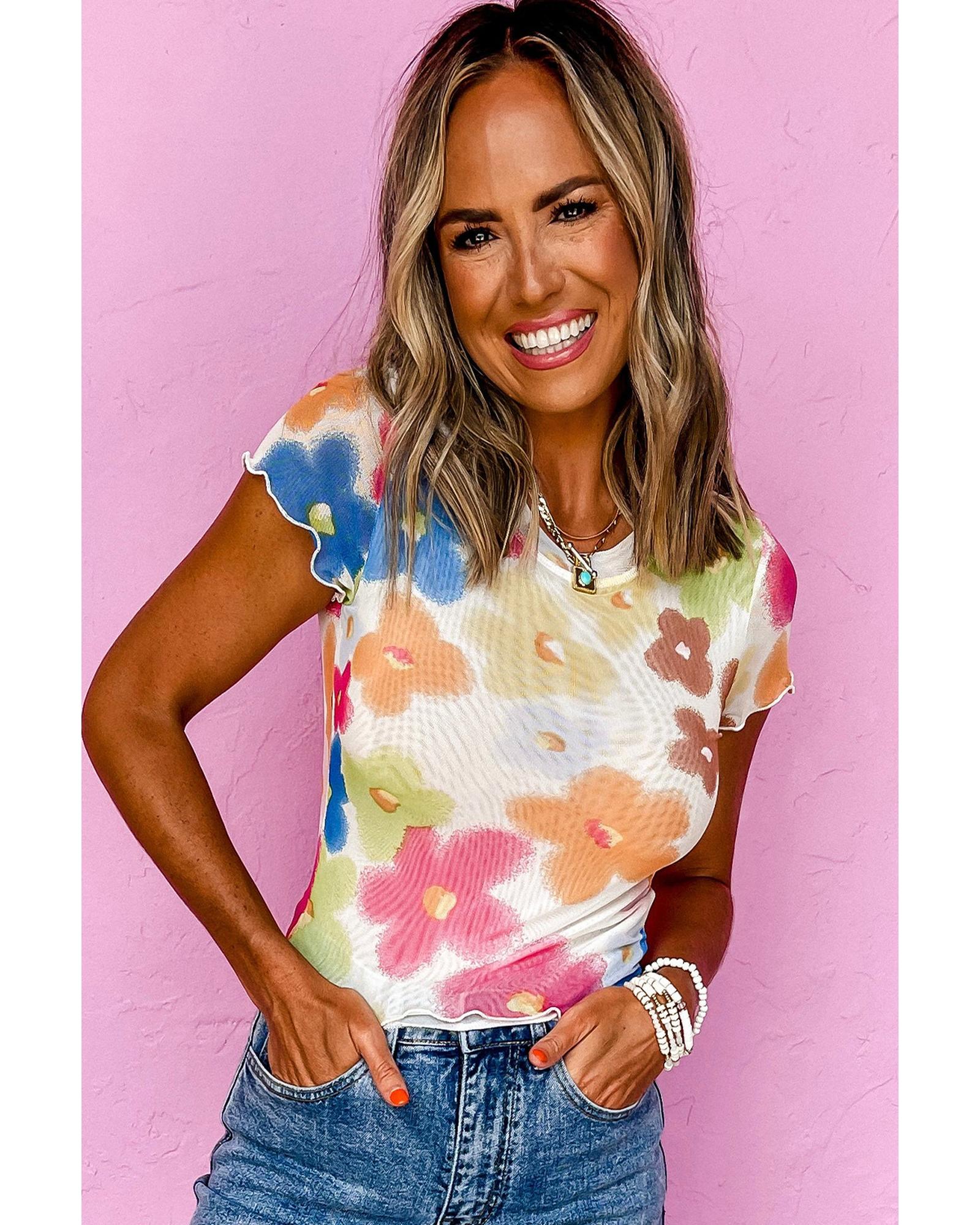 Multicolour Floral Mesh Lettuce Trim Cropped T Shirt – M