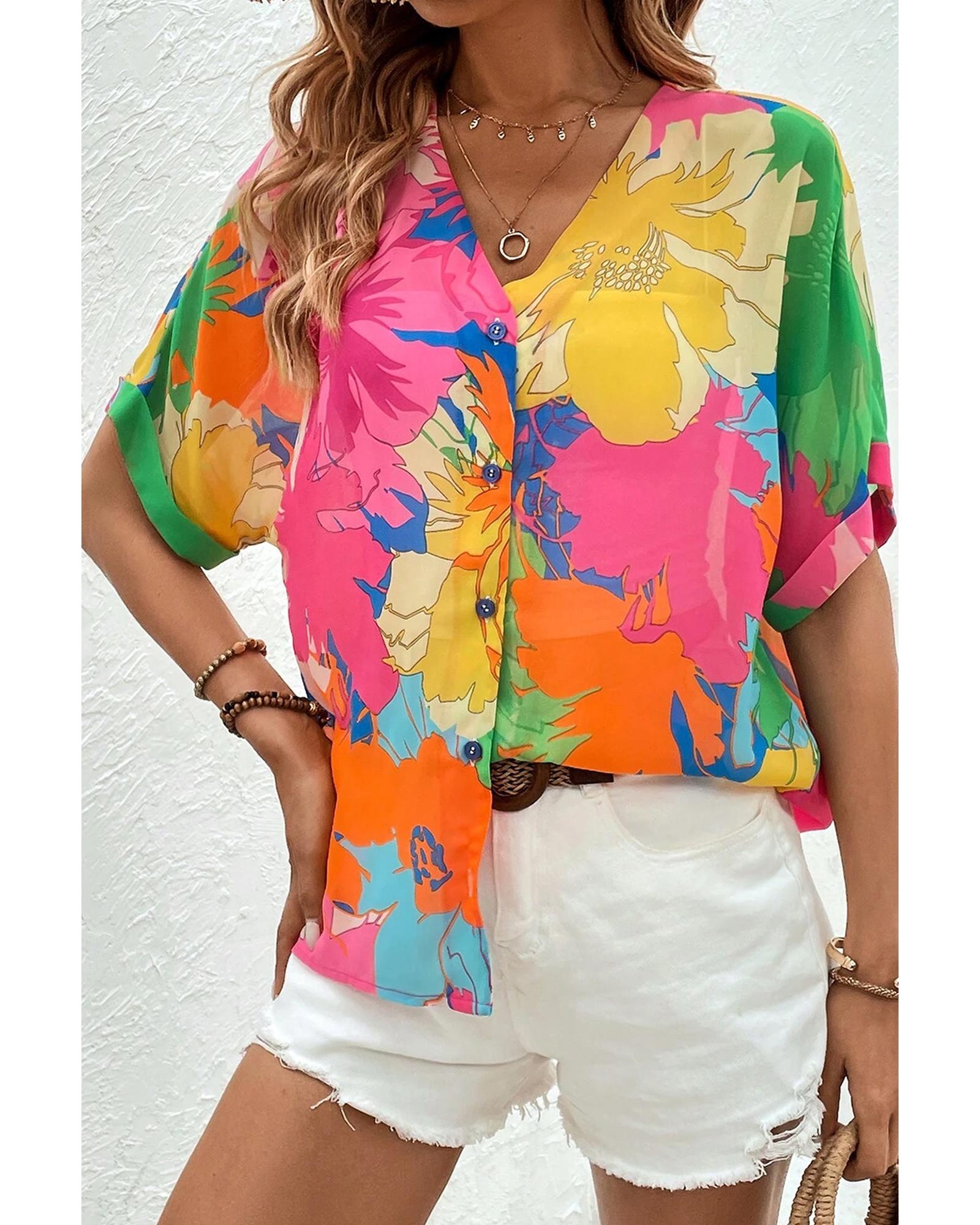 Multicolour Floral Print Folded Short Sleeve Shirt – M