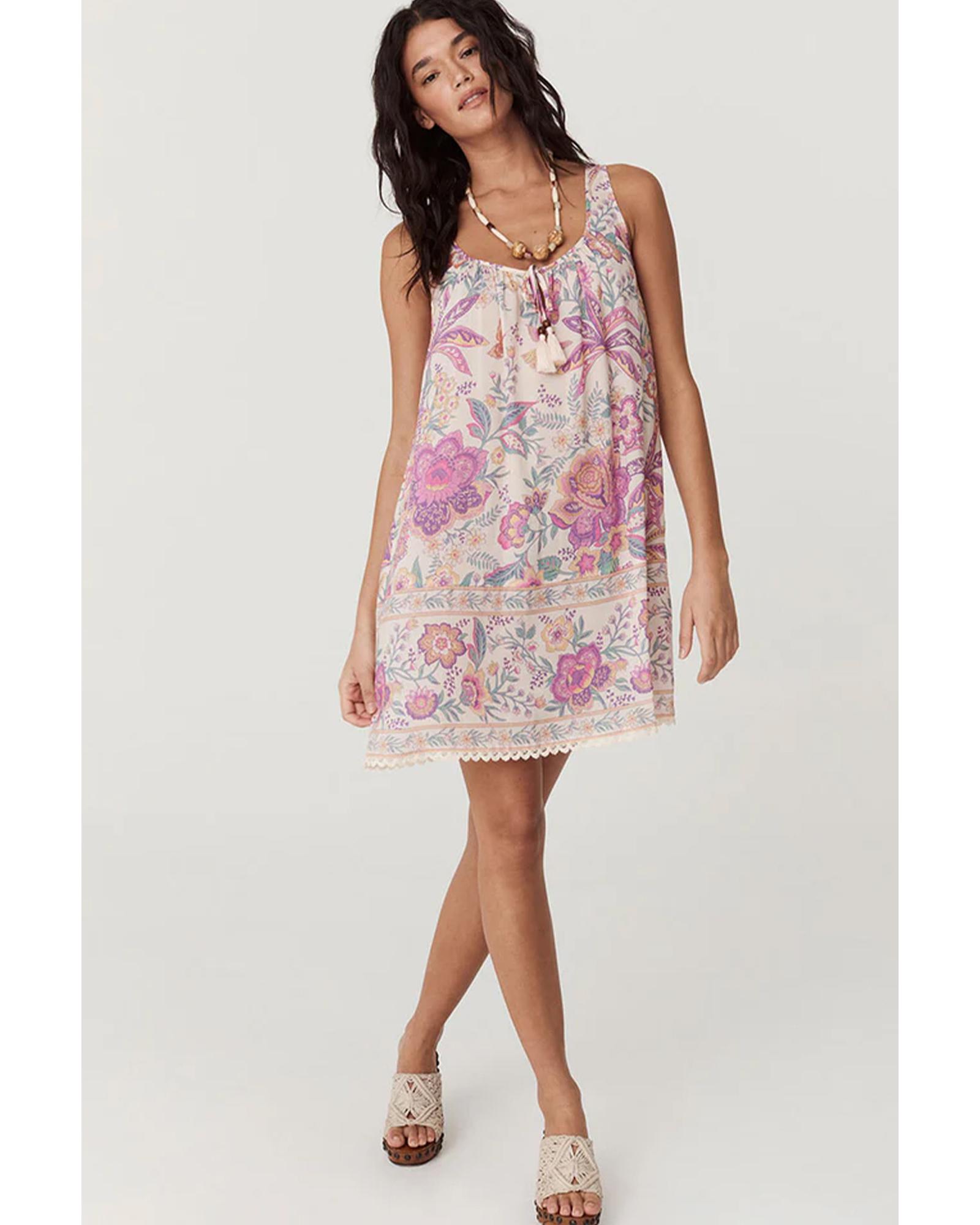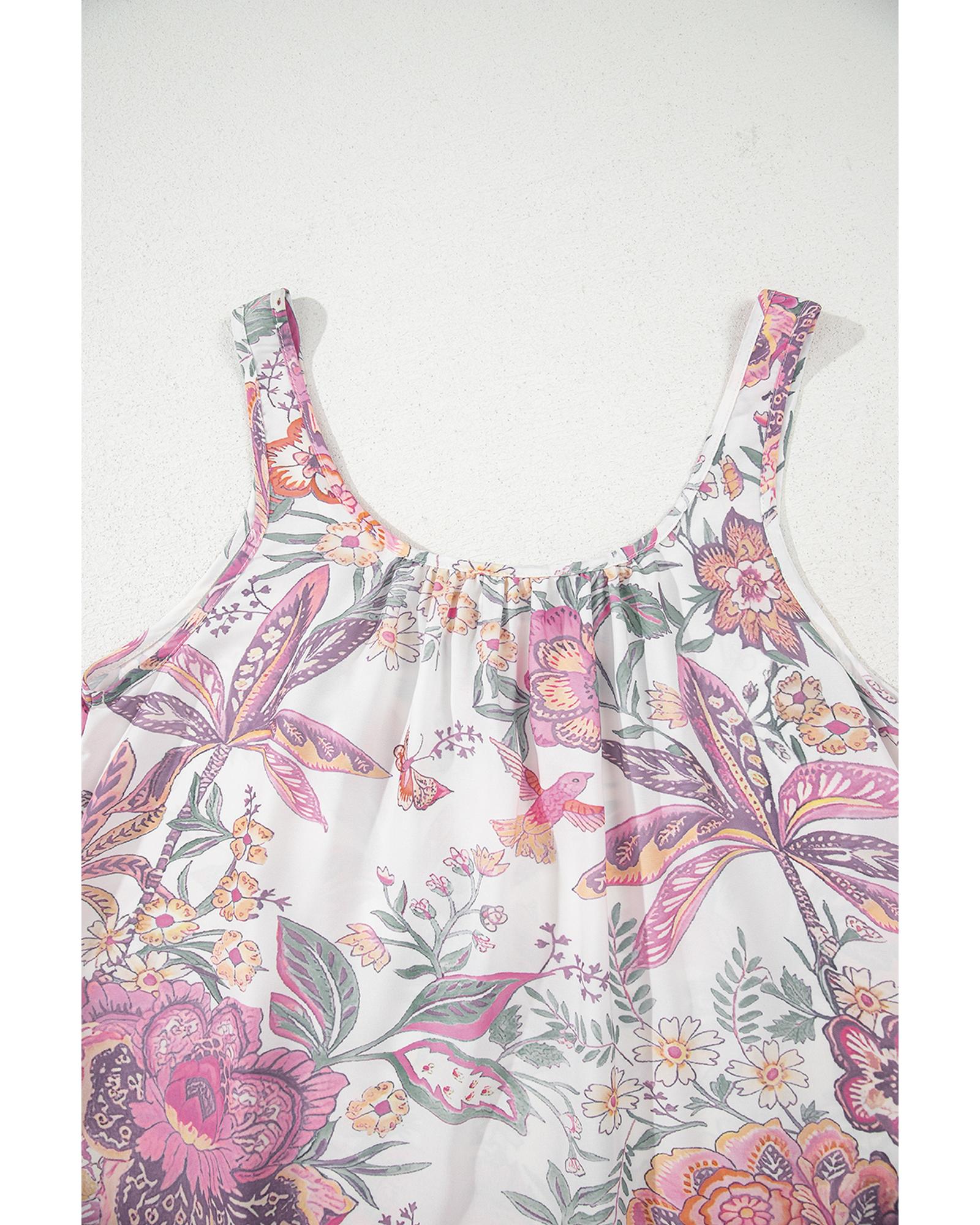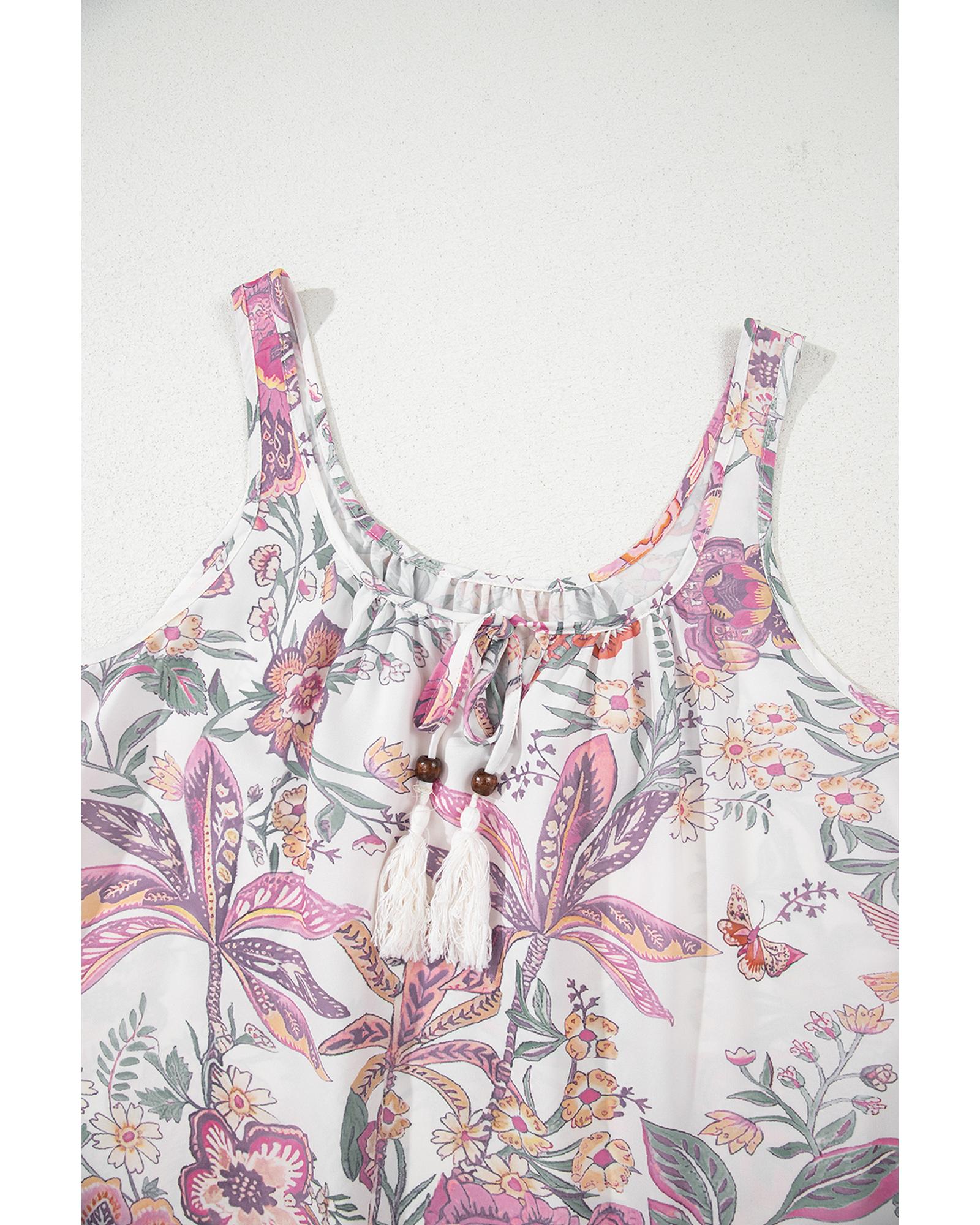 Multicolour Floral Print Fringed Tie U Neck Sleeveless Mini Dress – S