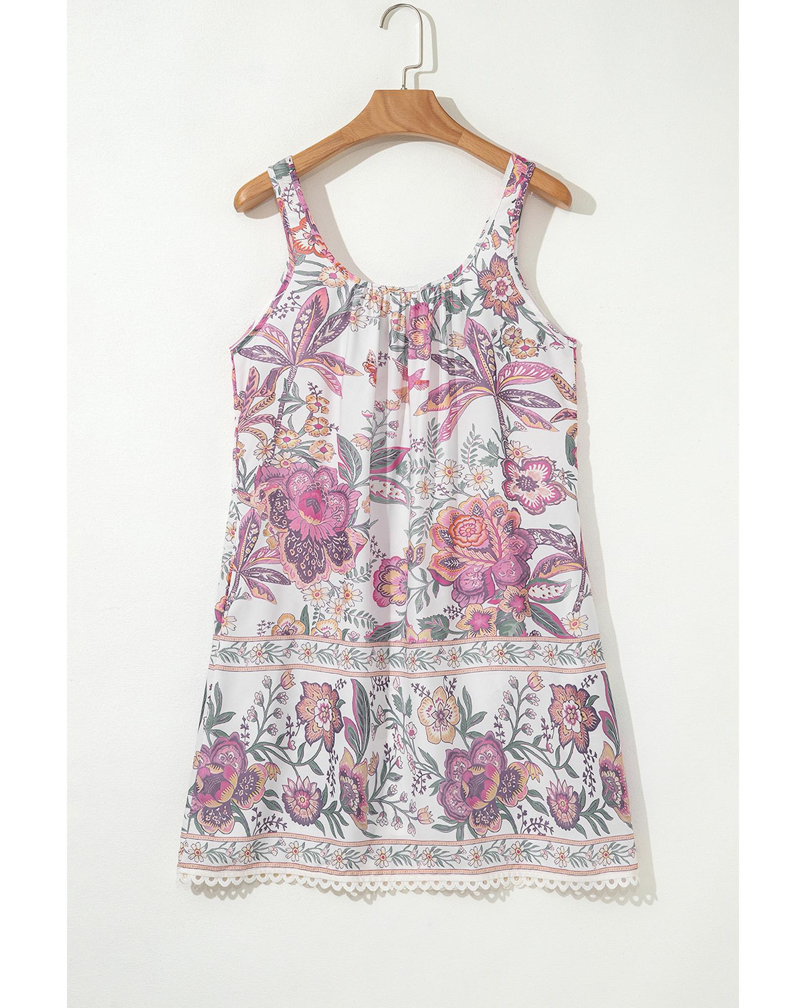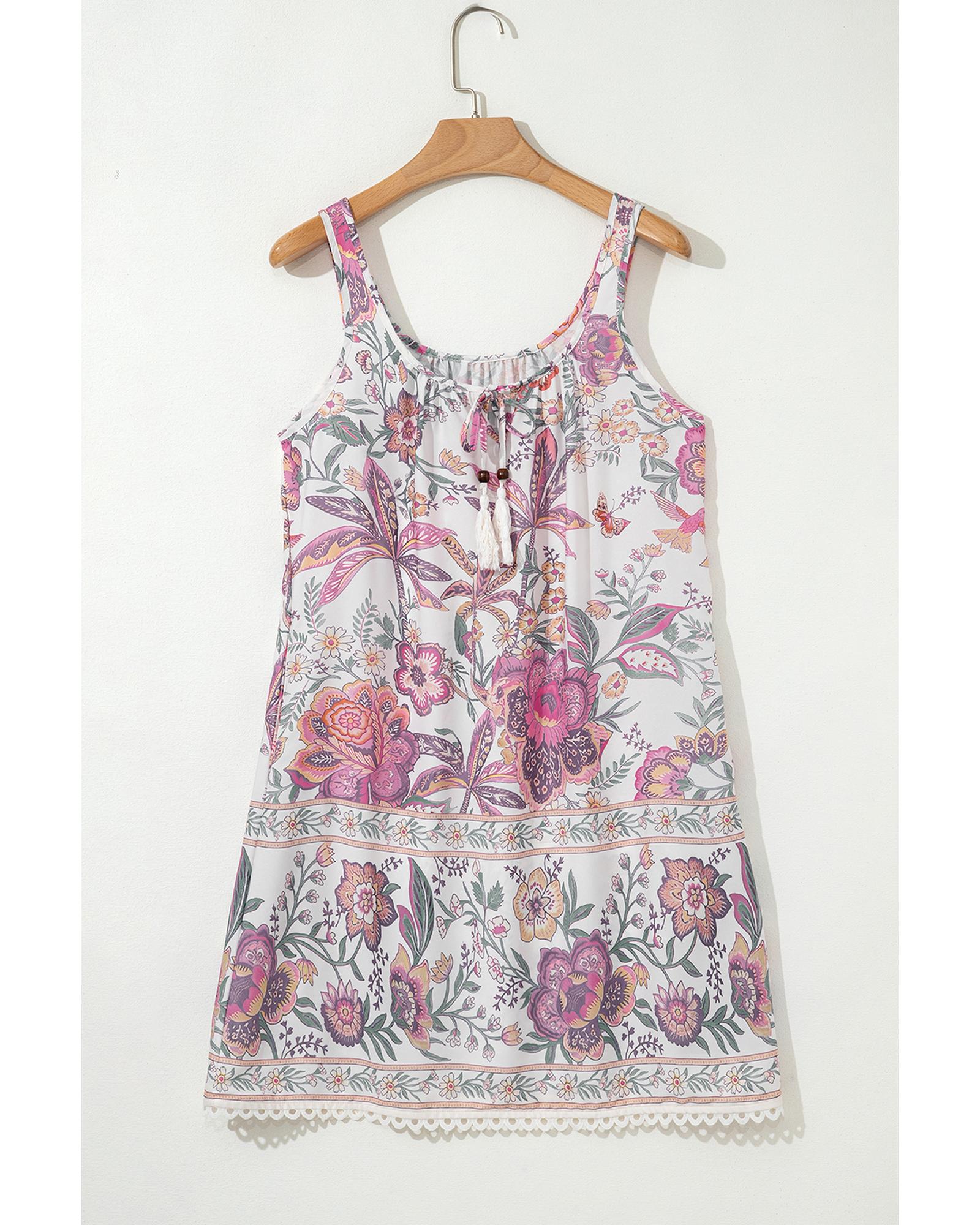 Multicolour Floral Print Fringed Tie U Neck Sleeveless Mini Dress – XL