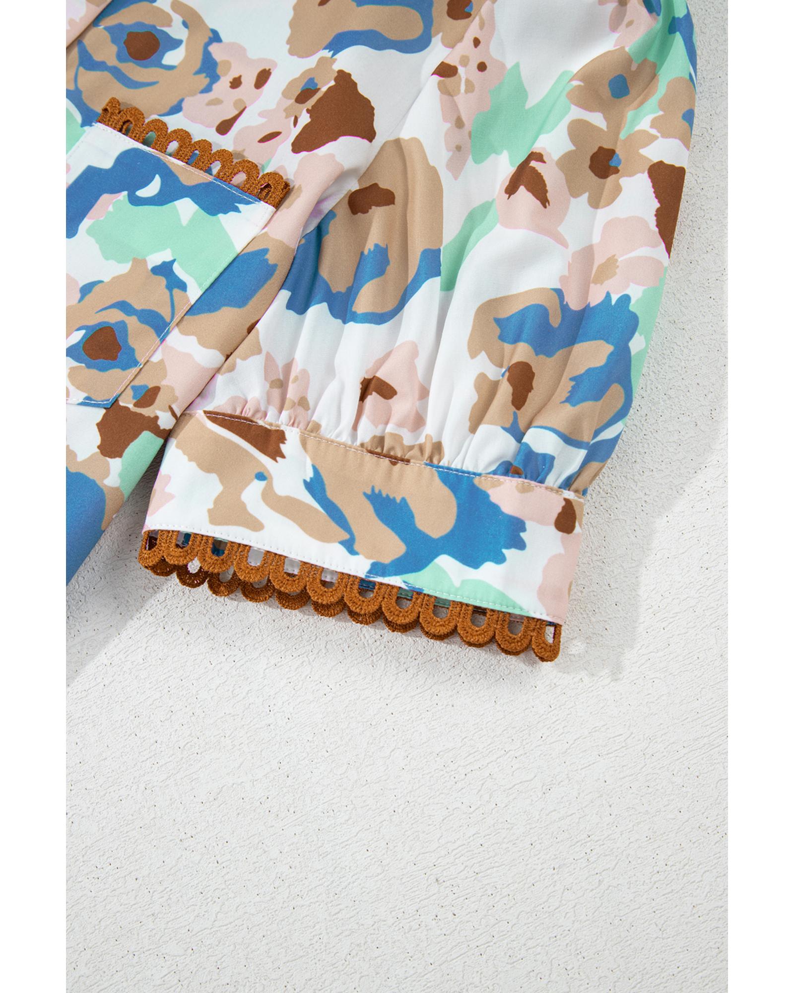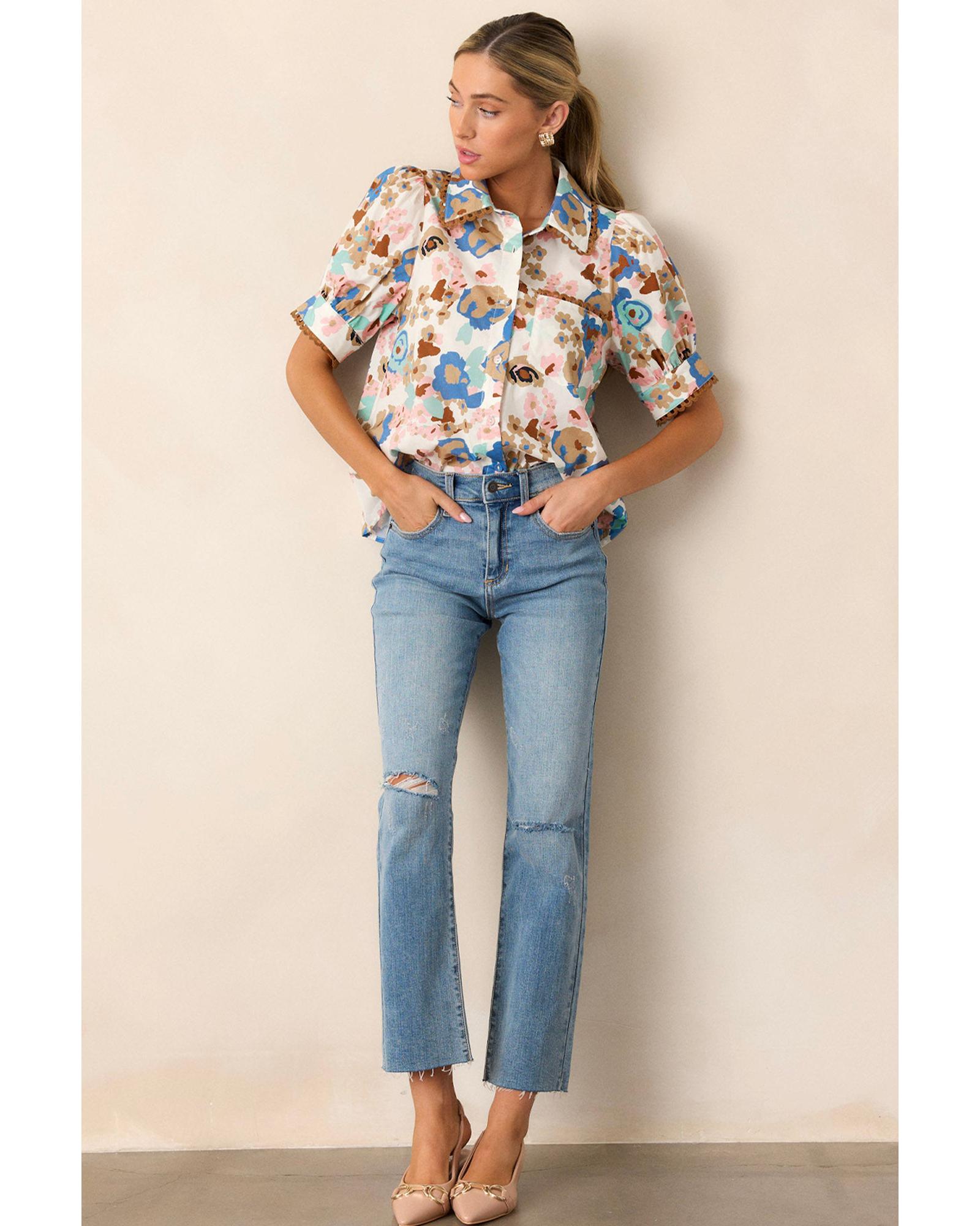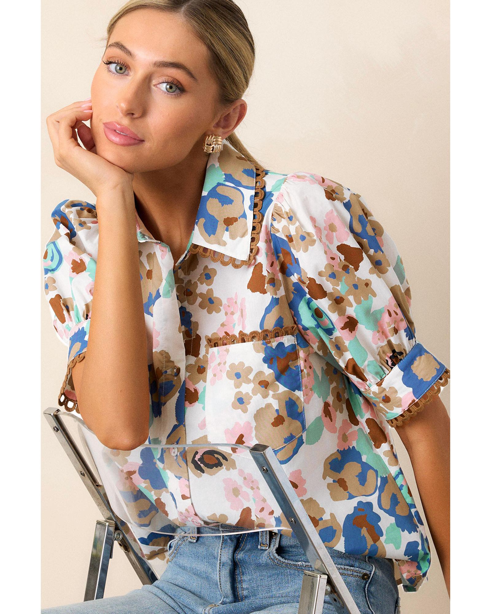 Multicolour Floral Print Ricrac Trim Collared Puff Short Sleeve Shirt – M