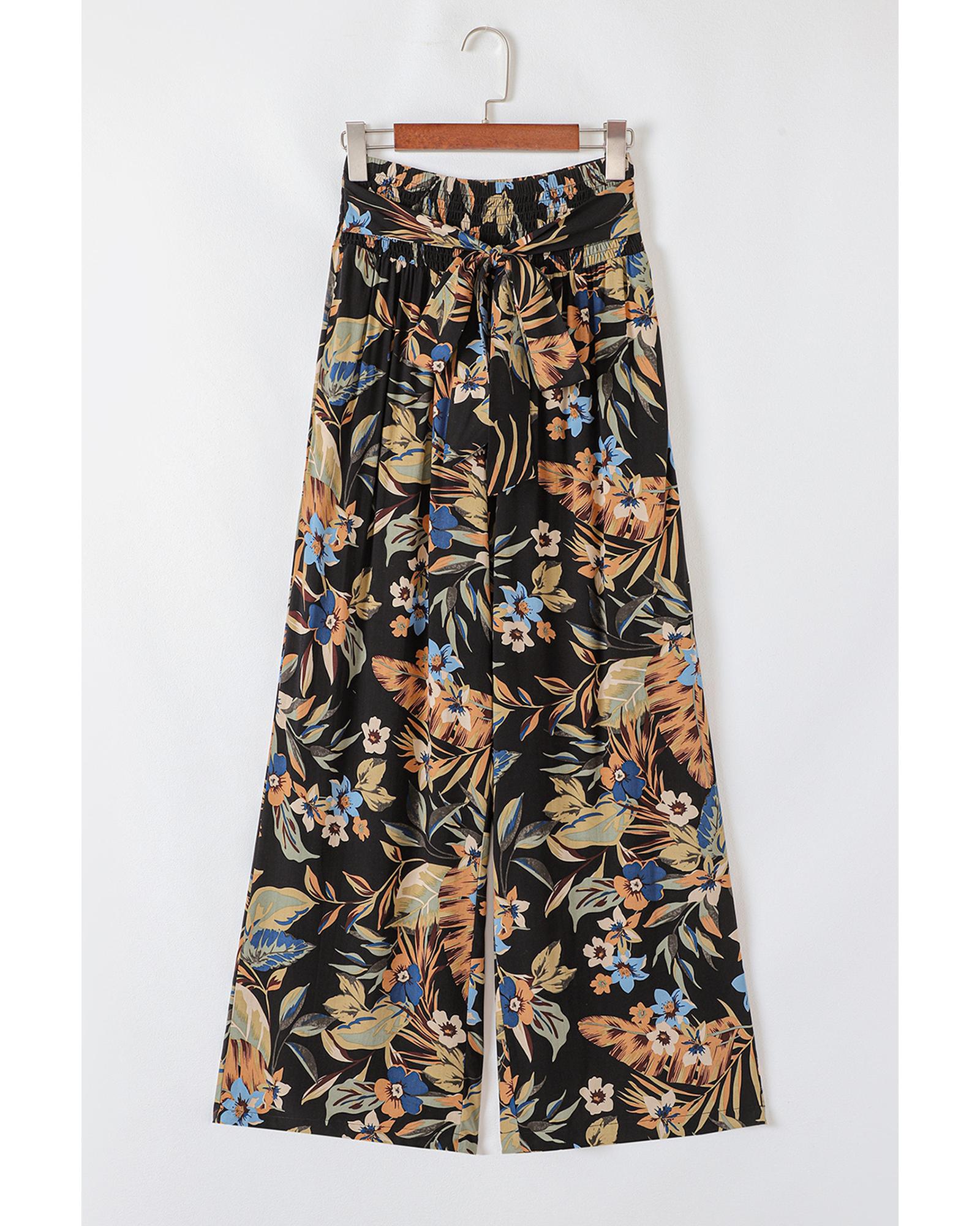 Multicolour Floral Shirred High Waist Wide Leg Pants with Tie – L