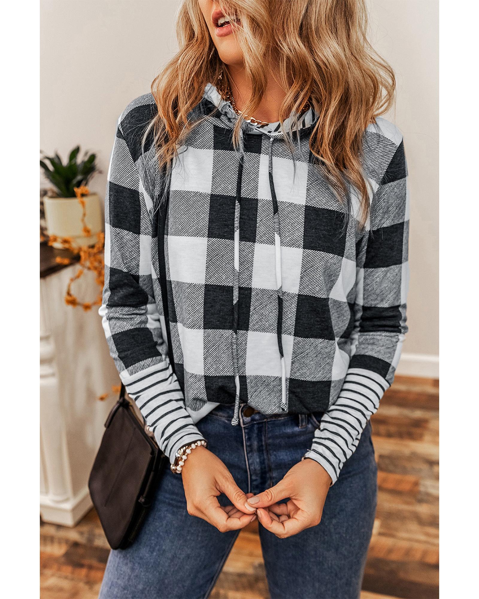 Combines style and comfort Plaid and striped print for a classic look Pullover design with drawstring and hood back Casual and popular among different ages Pairs well with jeans skirts and pants Available in multiple sizes High elasticity for a comfortable fit - Material: Soft comfortable fabric blend. Likely a cotton blend with added polyester for stretch and durability. The cuffs show a different striped fabric potentially a cotton rib knit.
