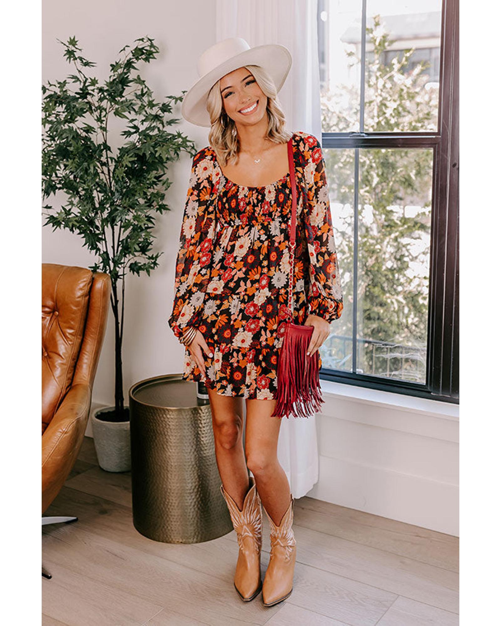Multicolour Smocked High Waist Long Sleeve Floral Dress – L