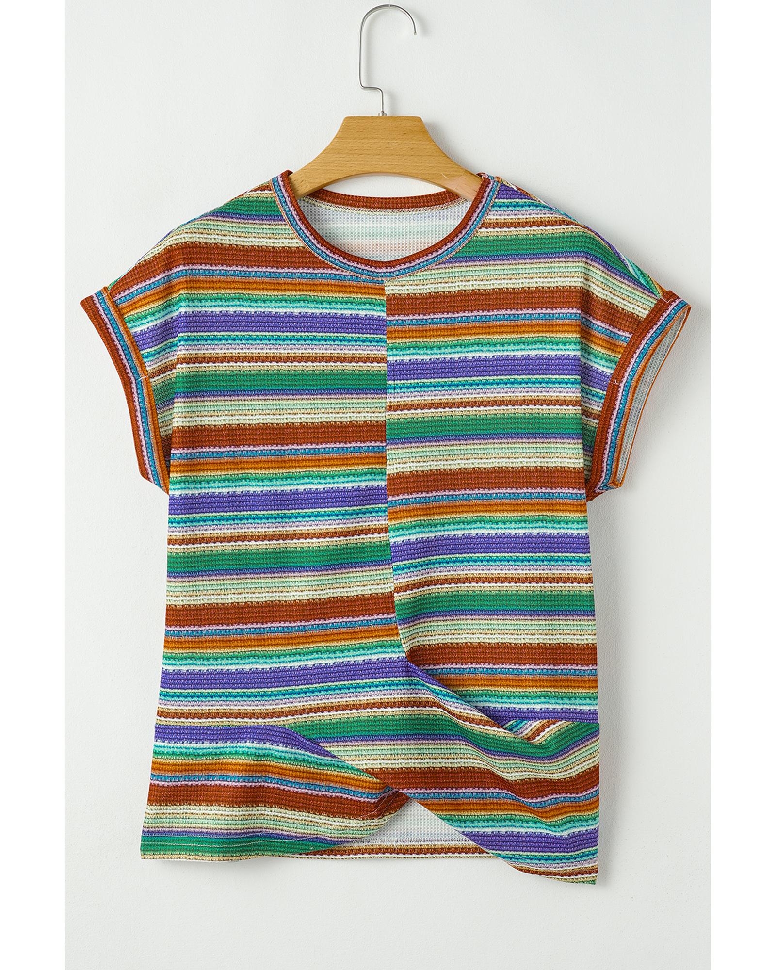 Multicolour Striped Pattern Twist Hem Short Sleeve Top - S