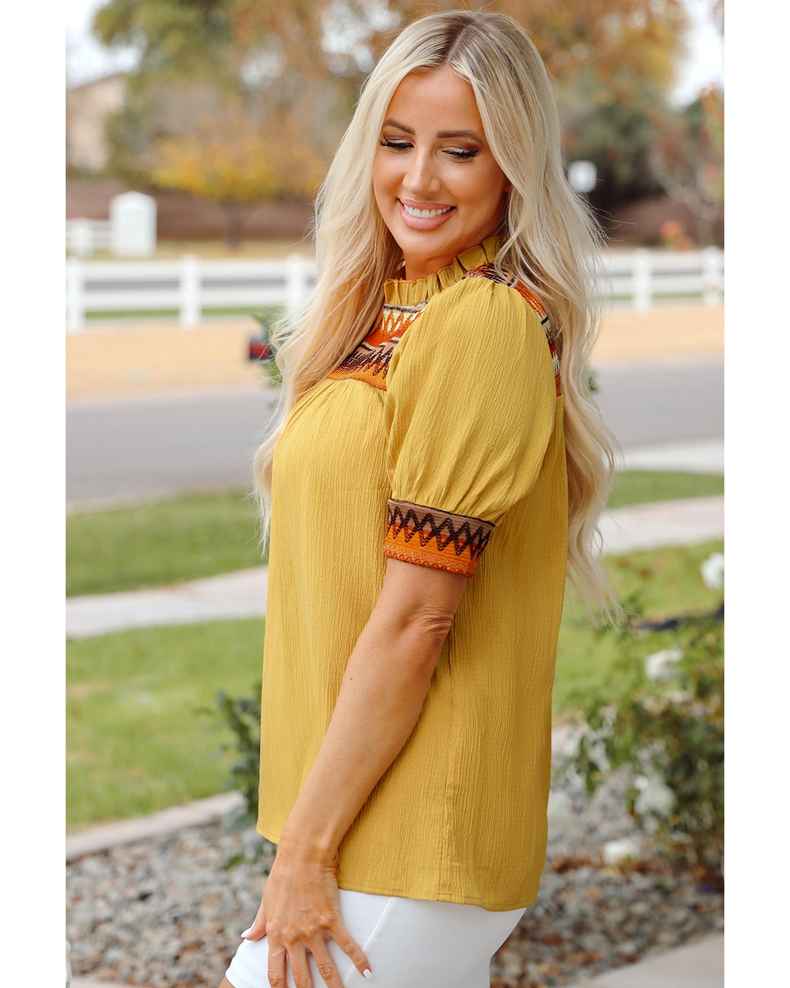 Mustard Geometric Short Puff Sleeve Frilled Collar Blouse – M