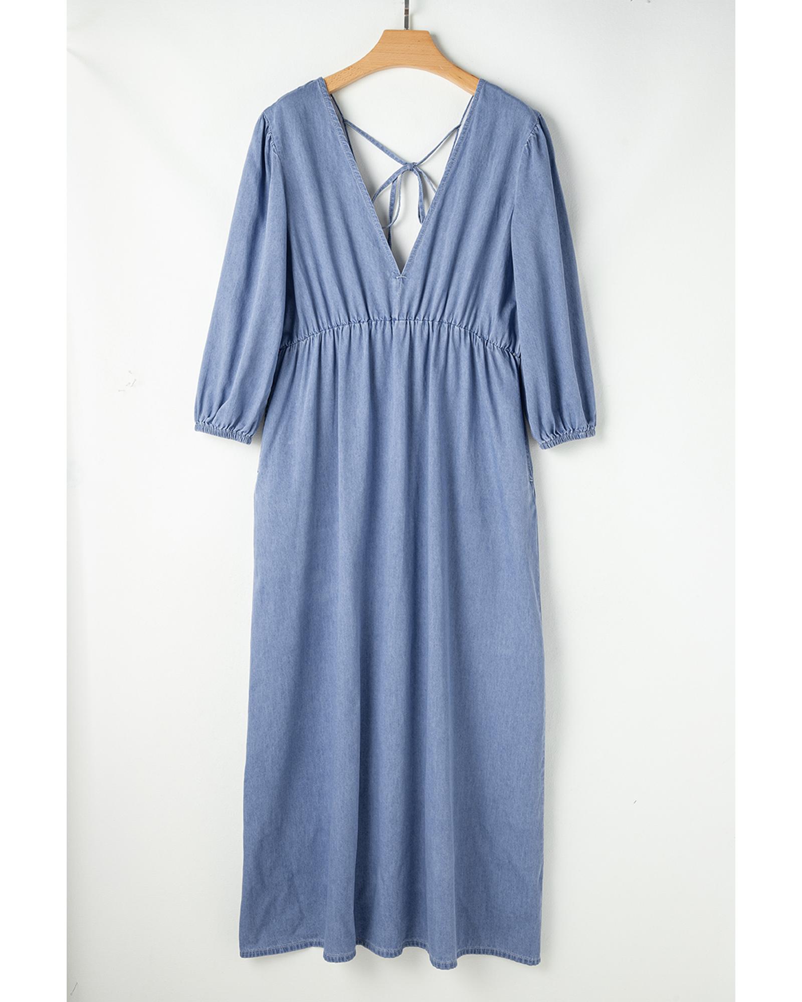 Myosotis Chambray Deep V Neck Bracelet Sleeve Maxi Dress – S