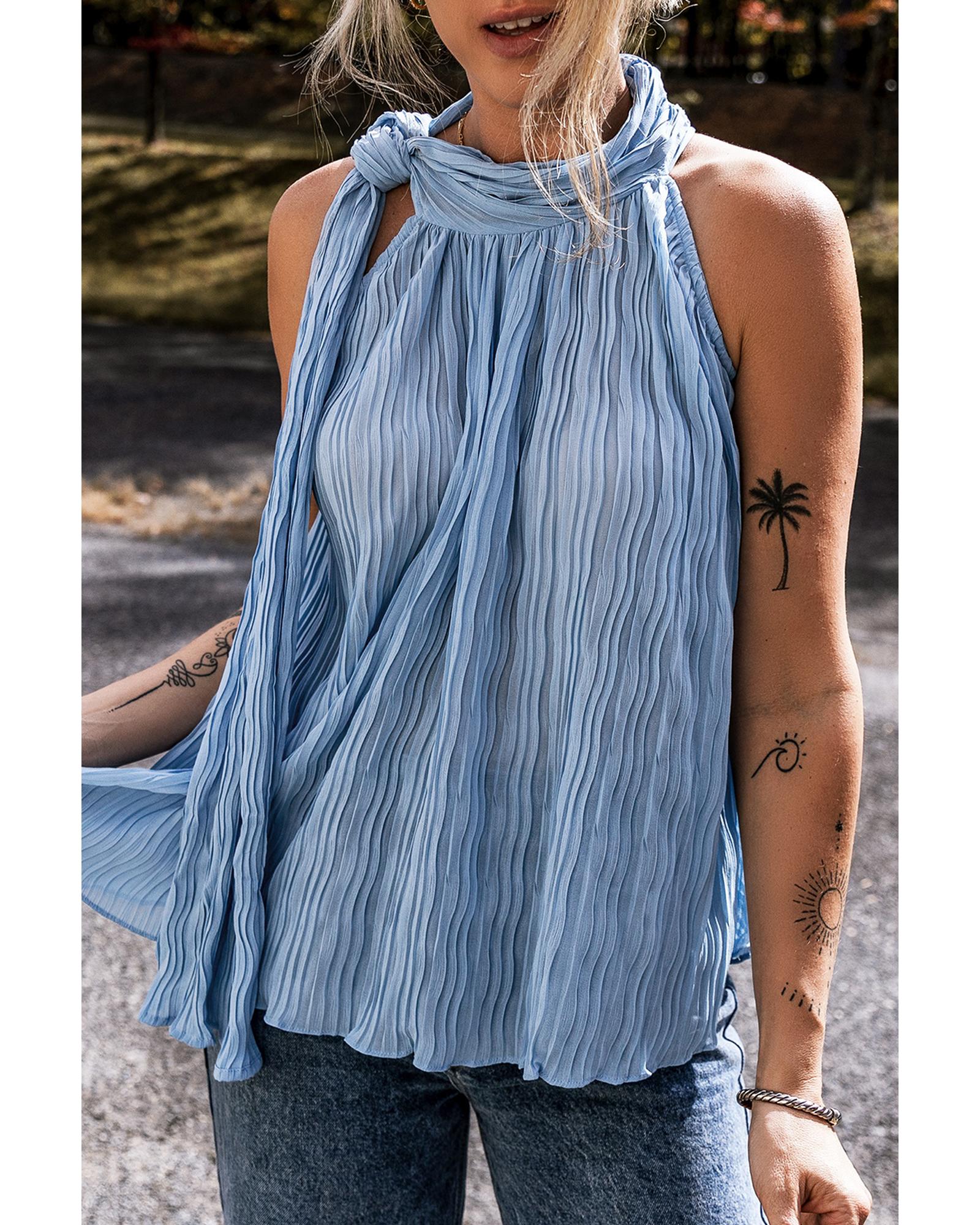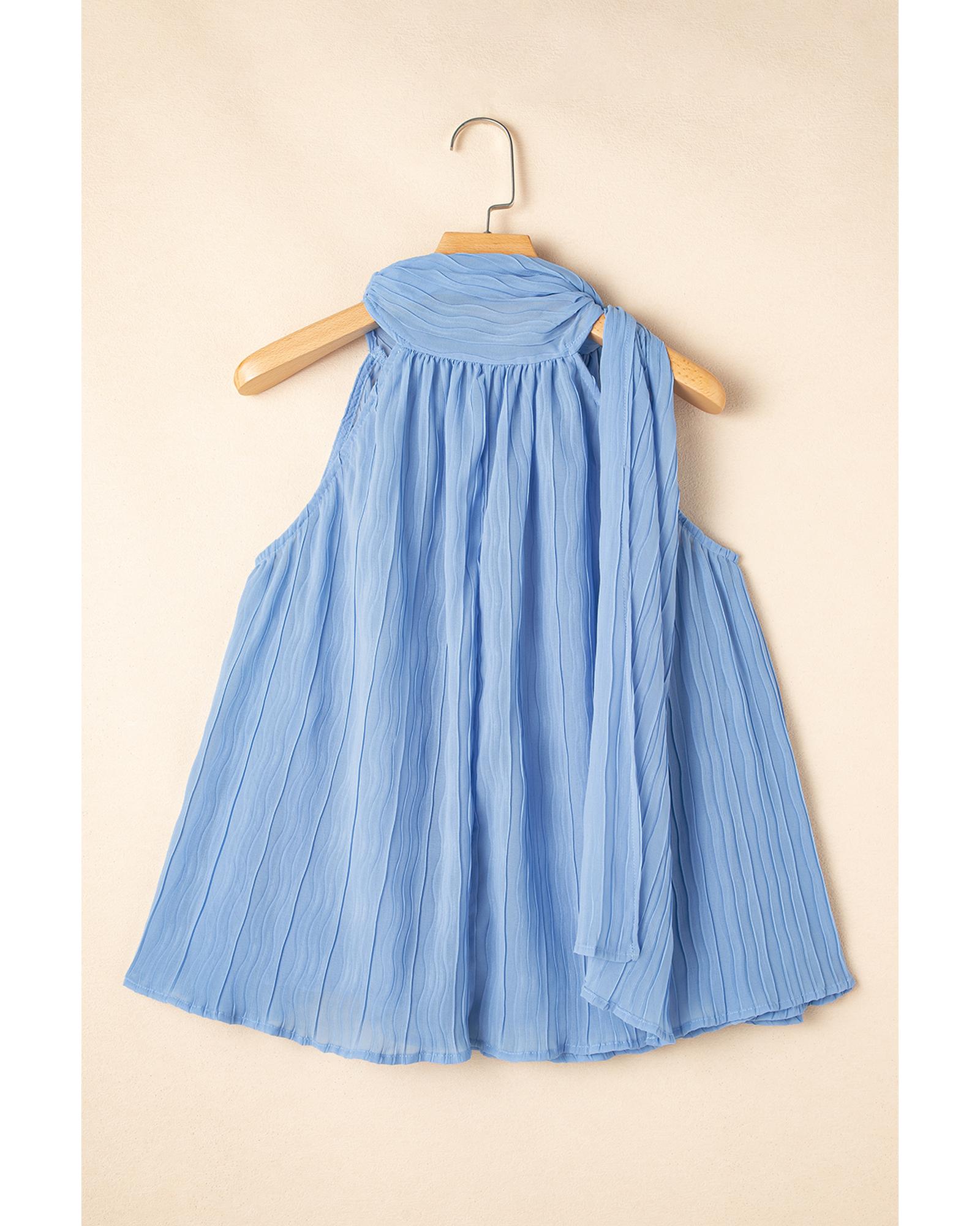 Myosotis Textured Pleated Tied Mock Neck Flowy Tank Top – L