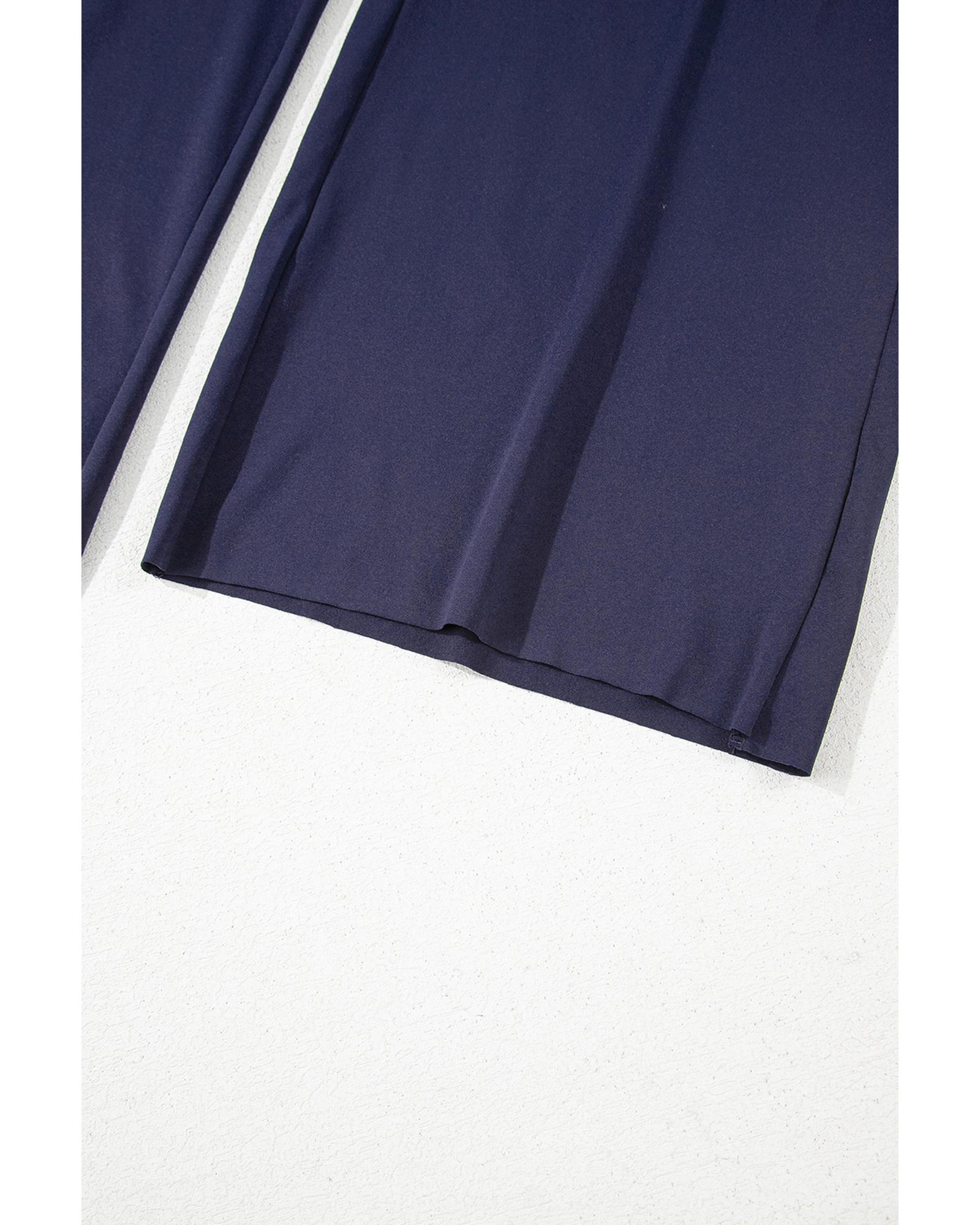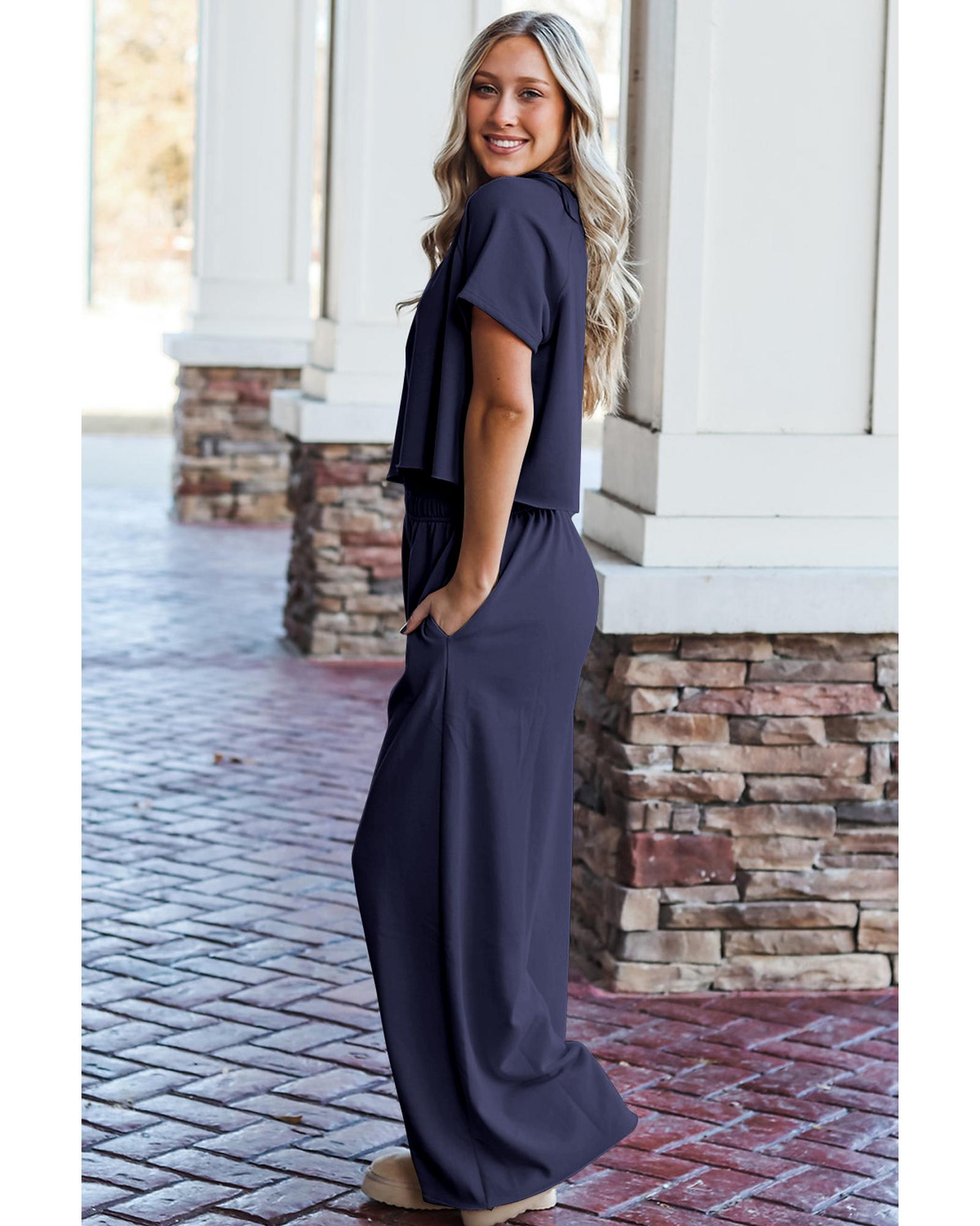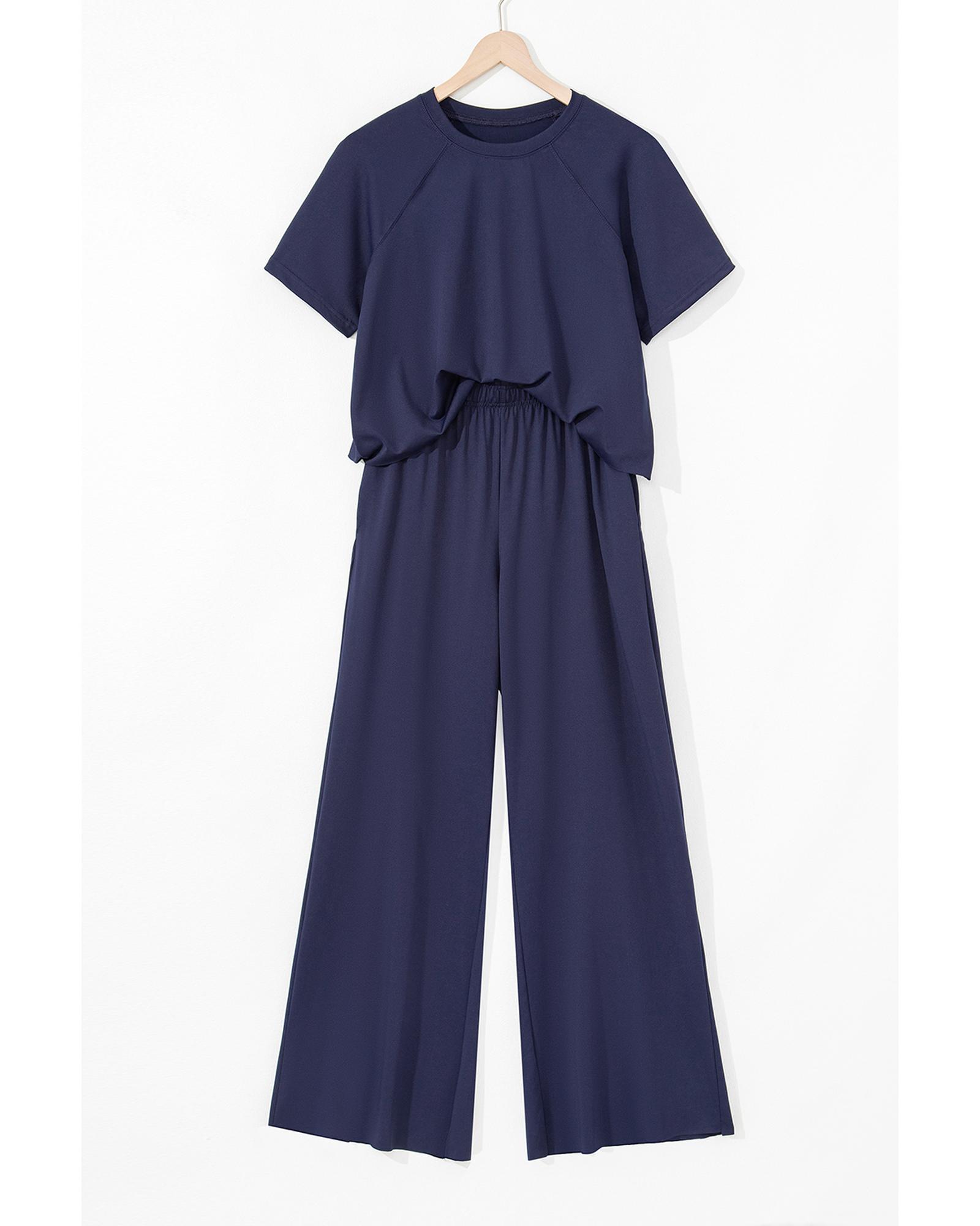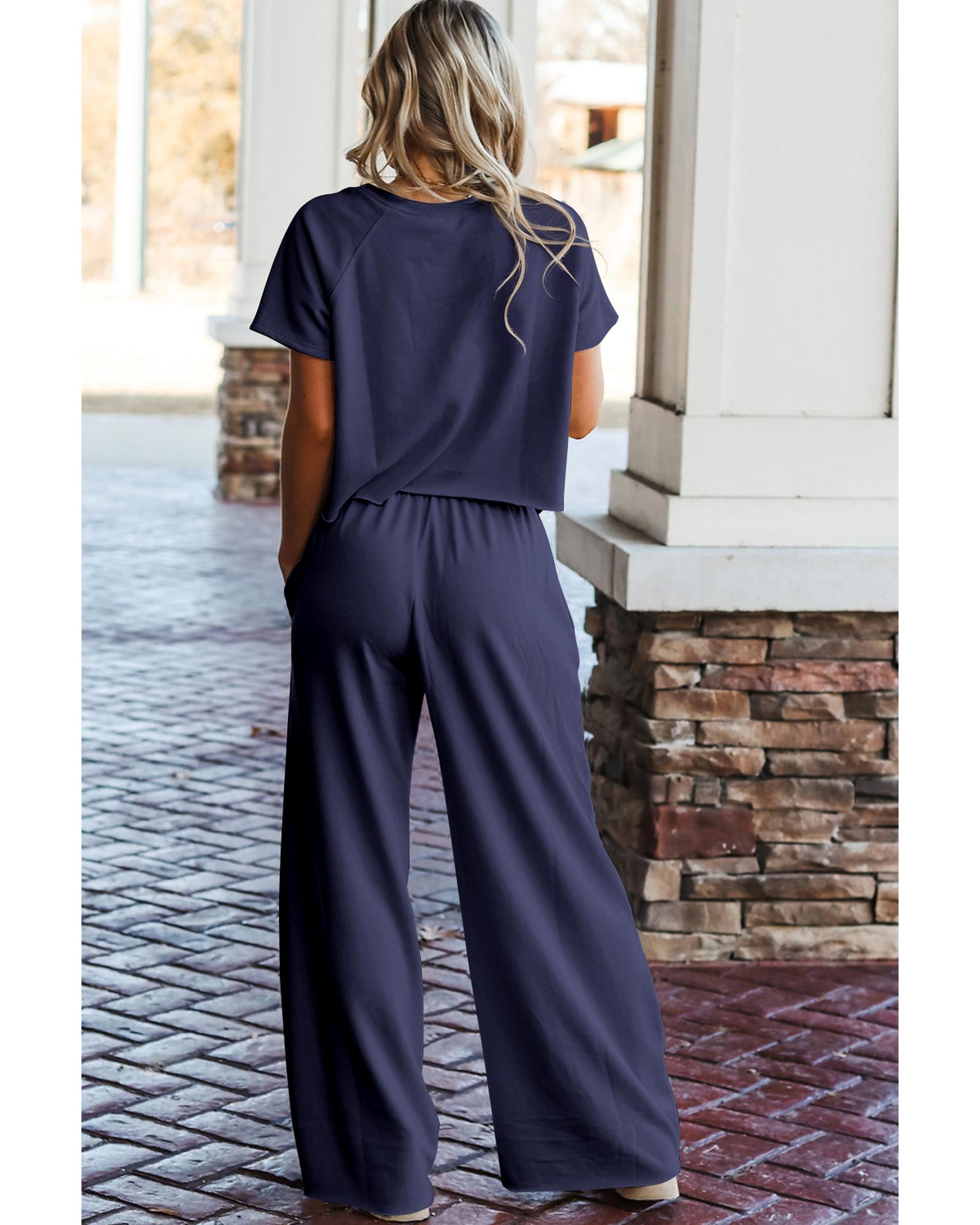 Navy Blue Raw Hem Loose Tee and Wide Leg Pants Set - L