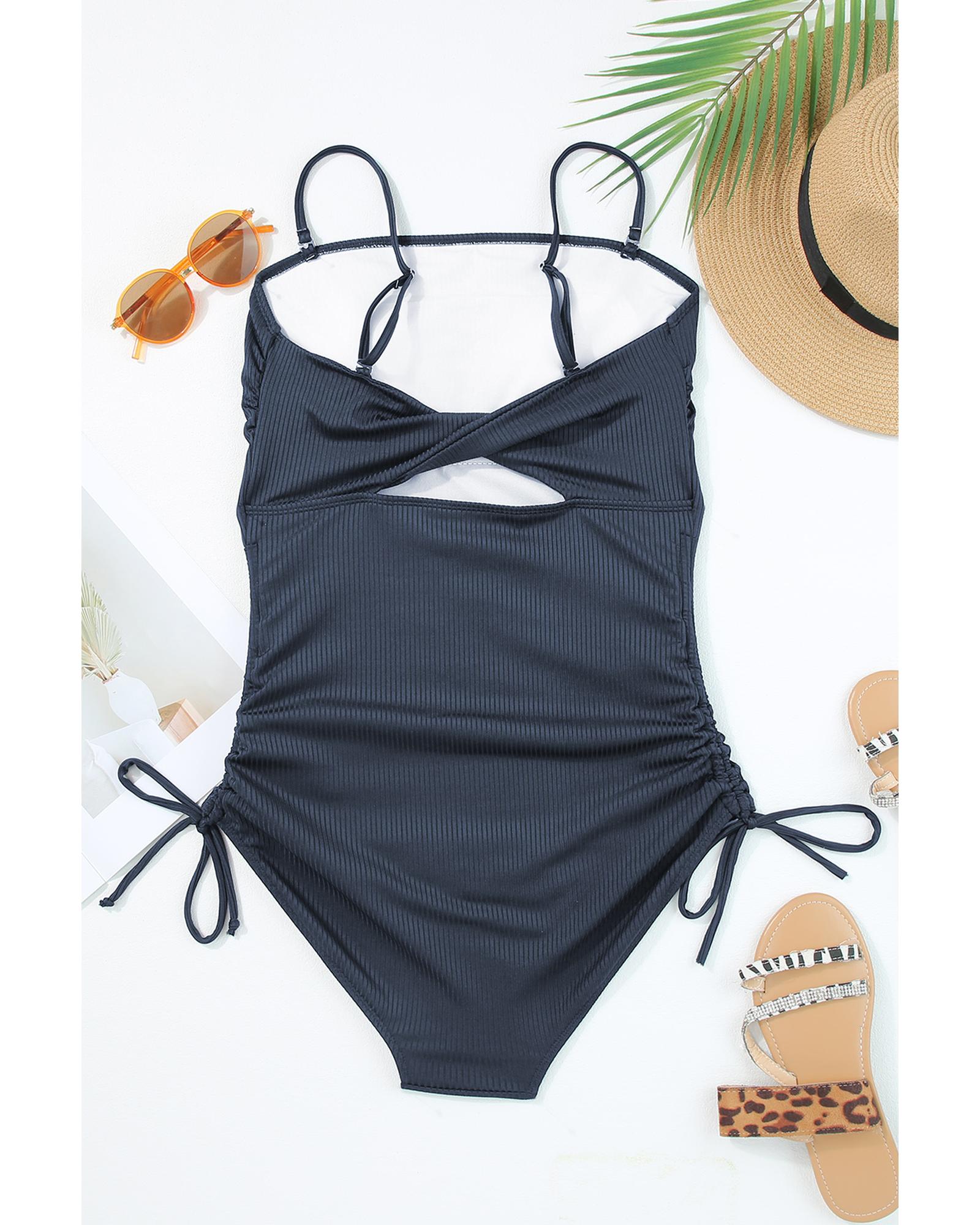 Navy Blue Ribbed Drawstring Sides Cutout One Piece Swimsuit – S