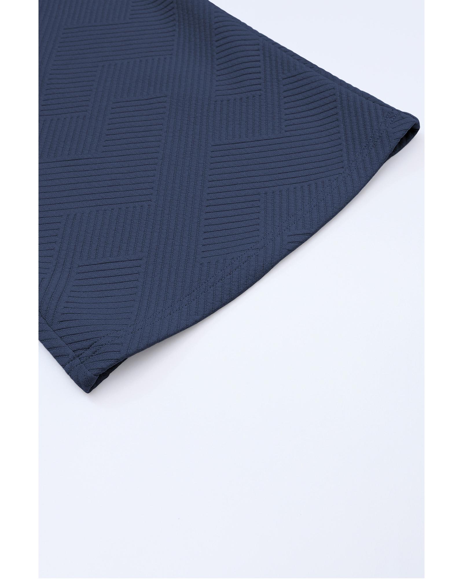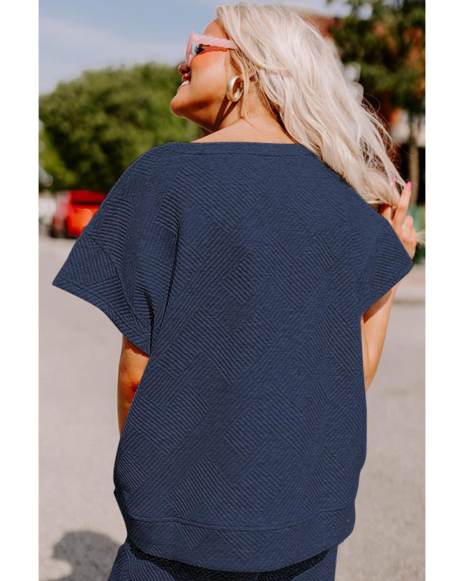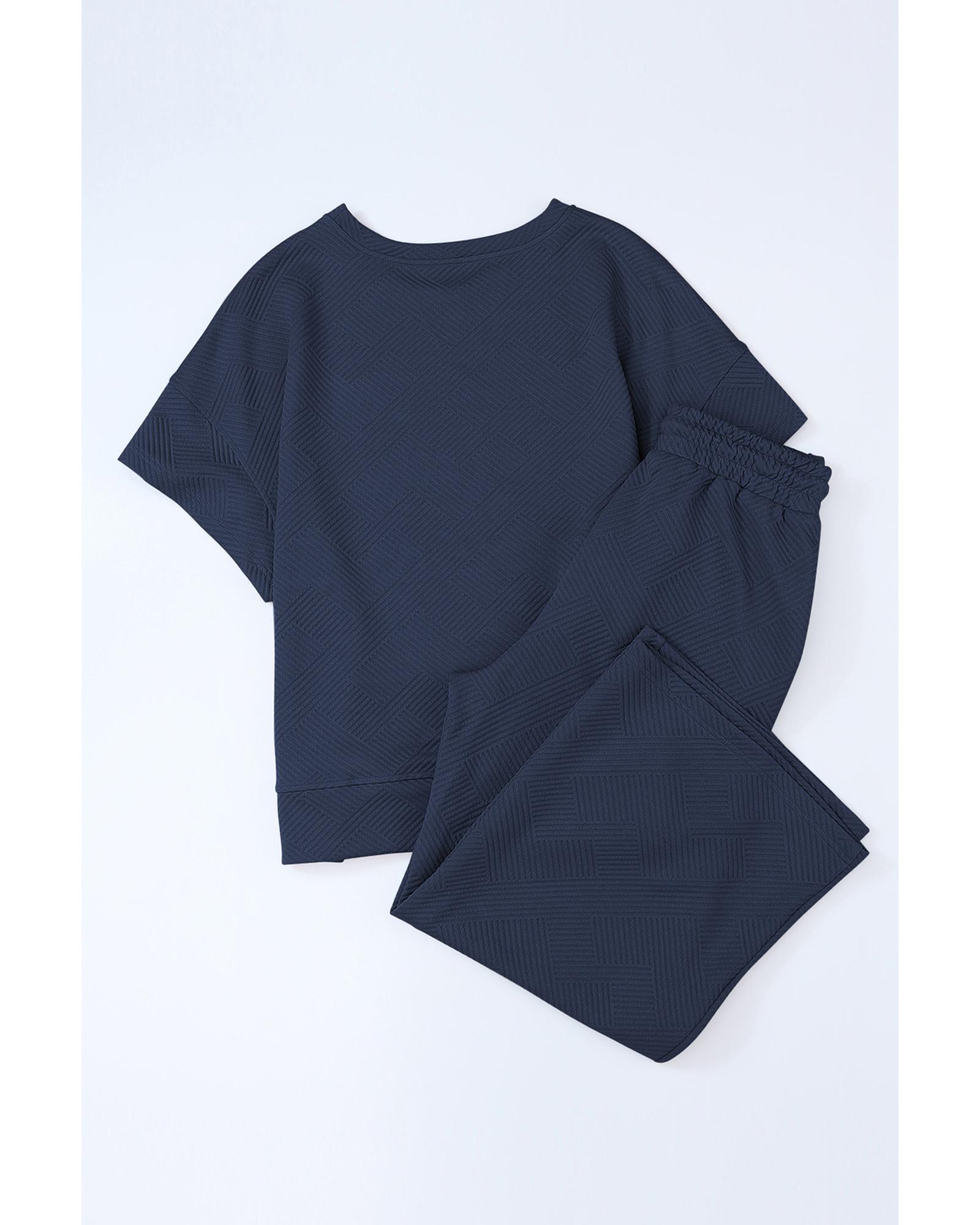 Navy Blue Textured Loose Fit T Shirt and Drawstring Pants Set - S
