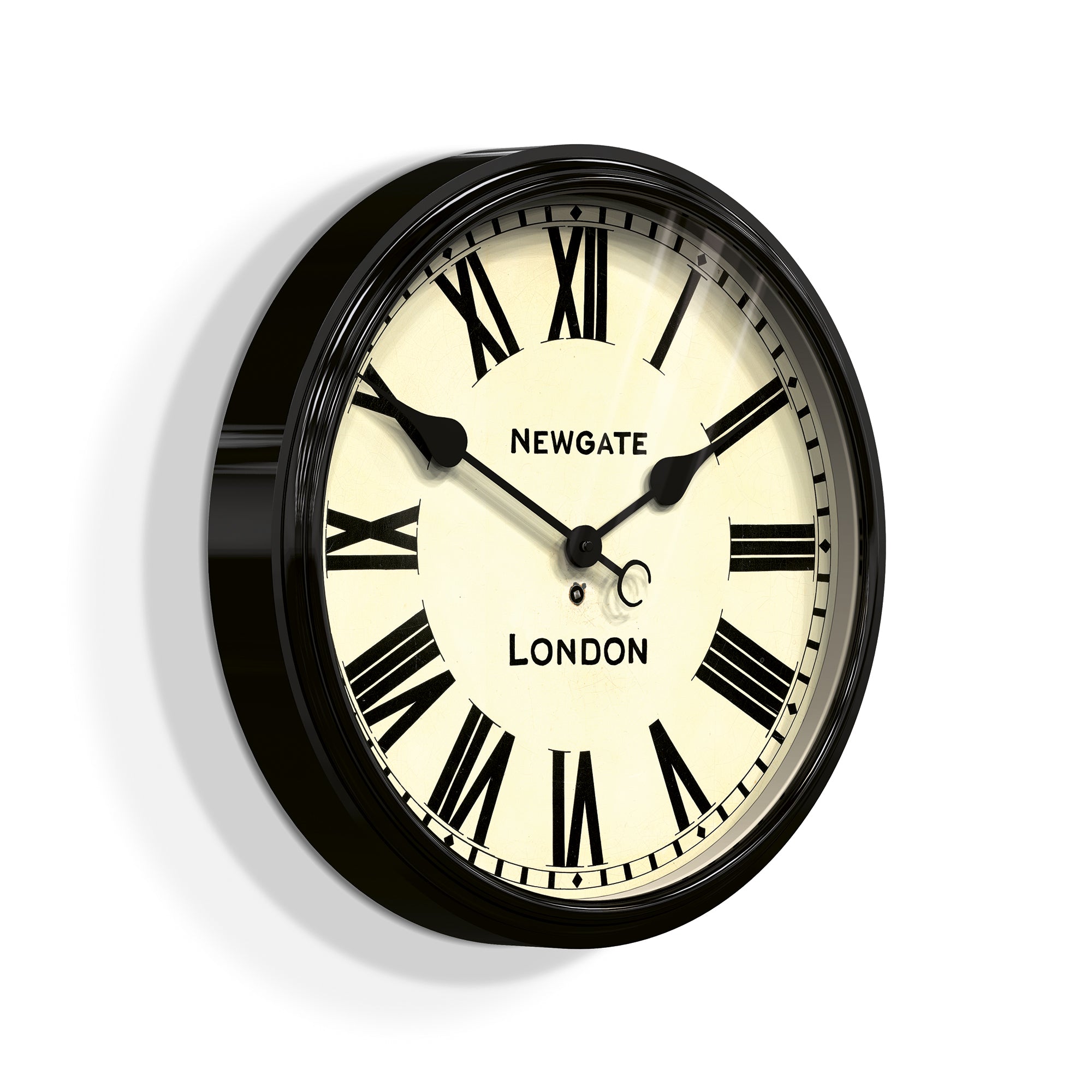Newgate Battersby Clock Black – Black Roman Numeral Wall Clock | Classic Station Clock. A large railway station wall clock with a classic Roman numeral dial and gloss black metal case.