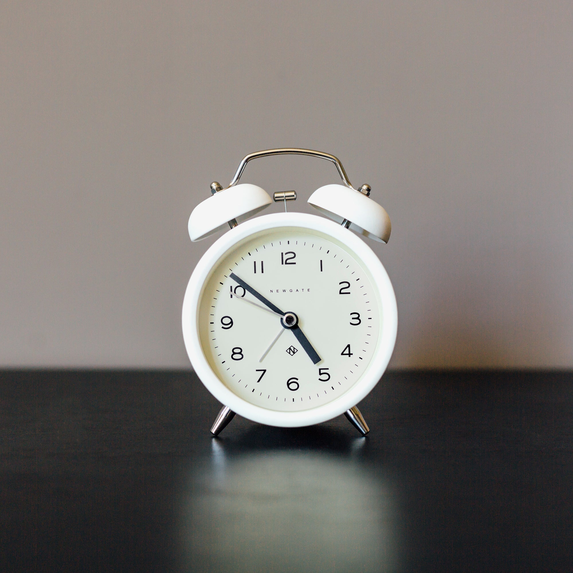 Newgate Charlie Bell Echo Matte Pebble White A modern white alarm clock with a contemporary graphic dial and a moving hammer and twin-bell alarm.