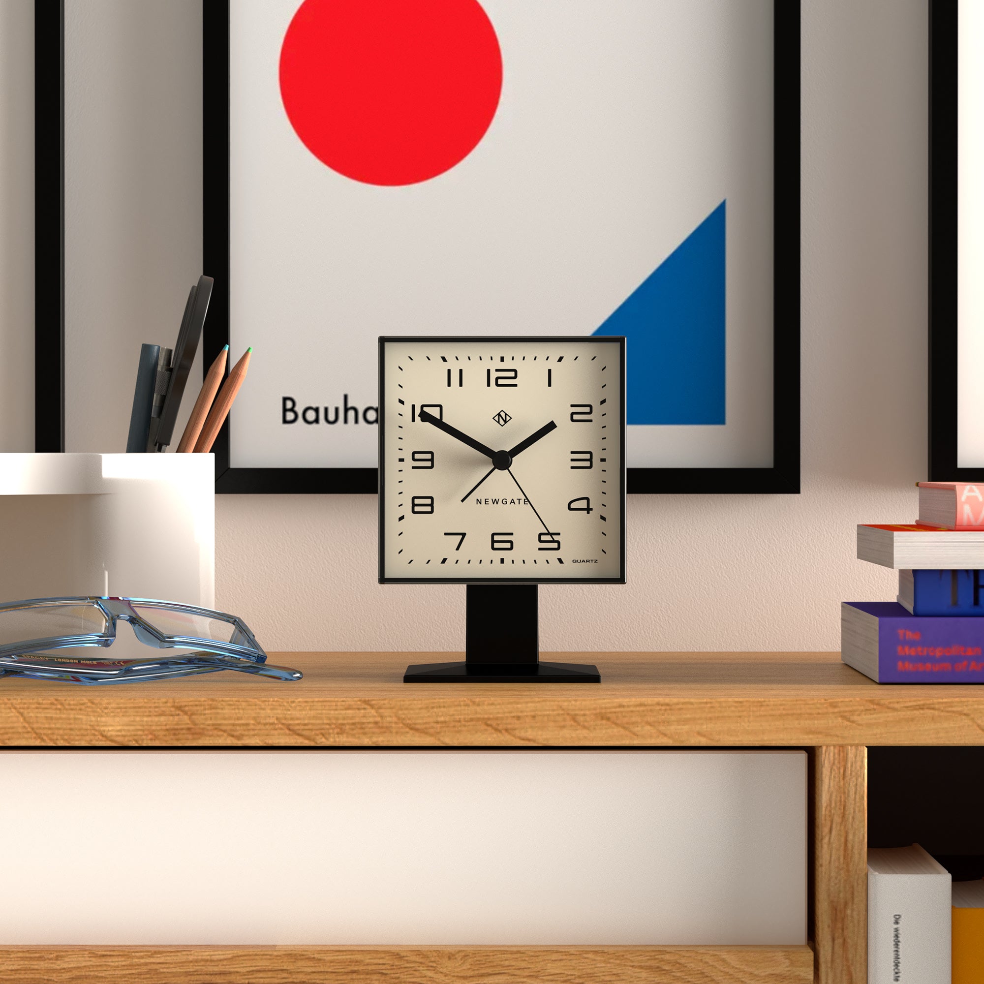 Newgate Victor Alarm Clock Black An acrylic modern retro-inspired alarm clock with an arabic dial and deep acrylic lens. The square case has a matt finish and sits on a square podium, making this unique Newgate designed alarm clock a great addition to your desk, shelf or bedside.