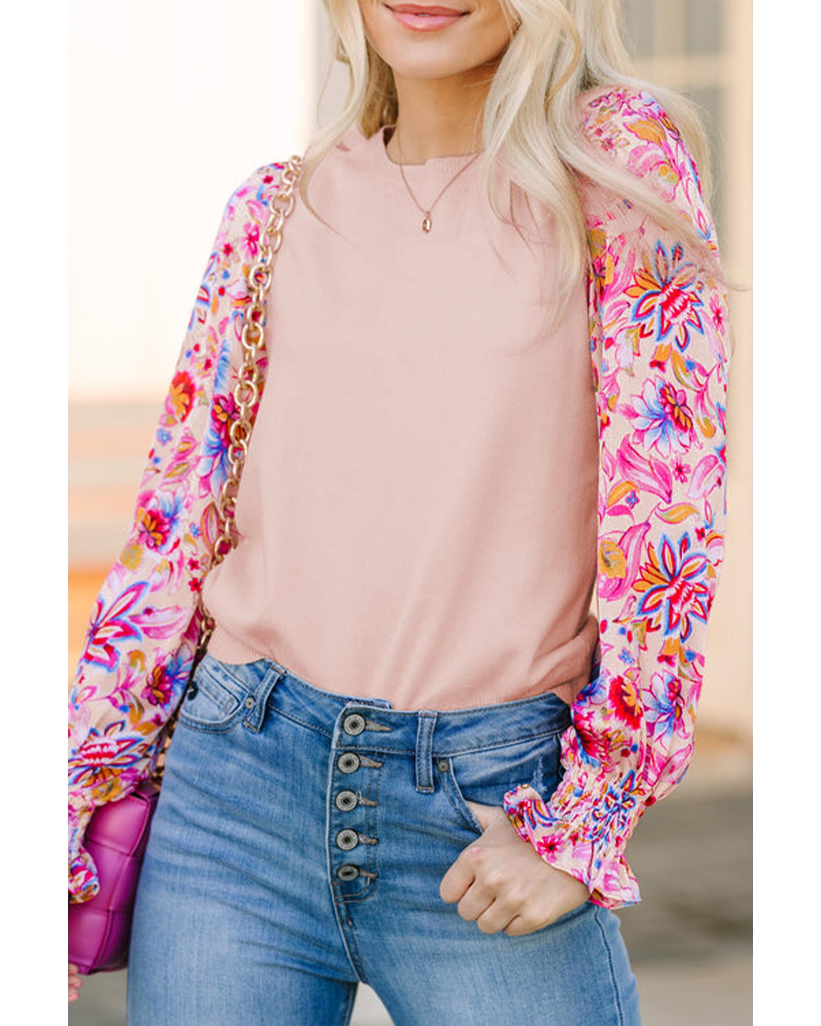 Oatmeal Floral Printed Patchwork Smocked Lantern Sleeve Knit Top – S