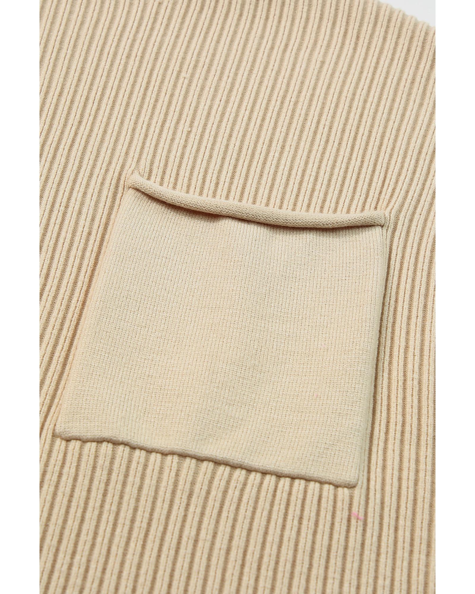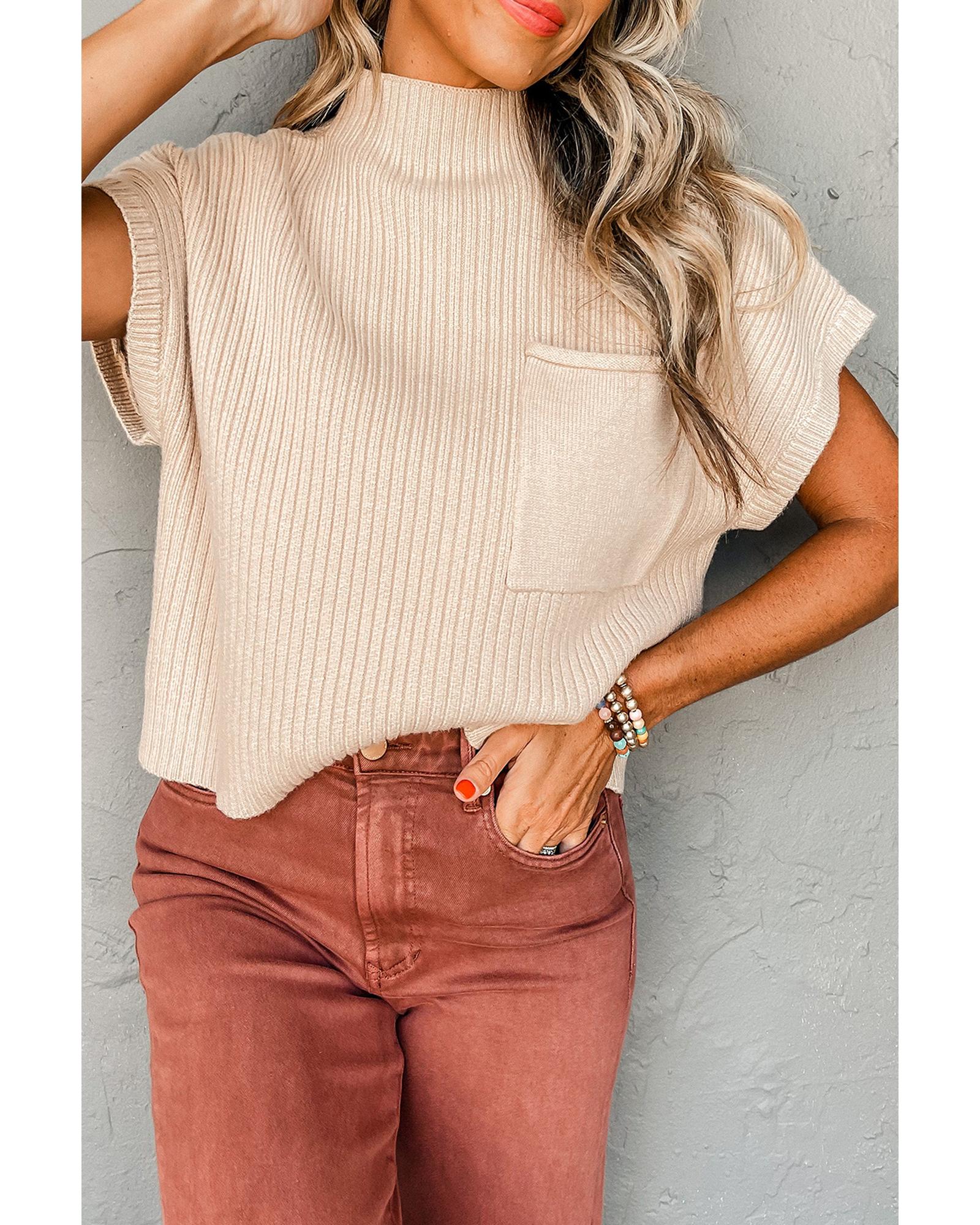 - Oatmeal patch pocket ribbed knit short sleeve sweater