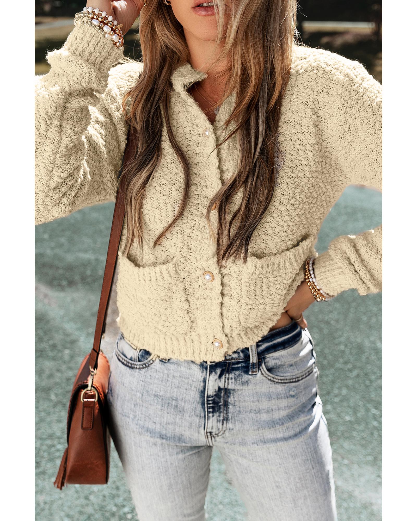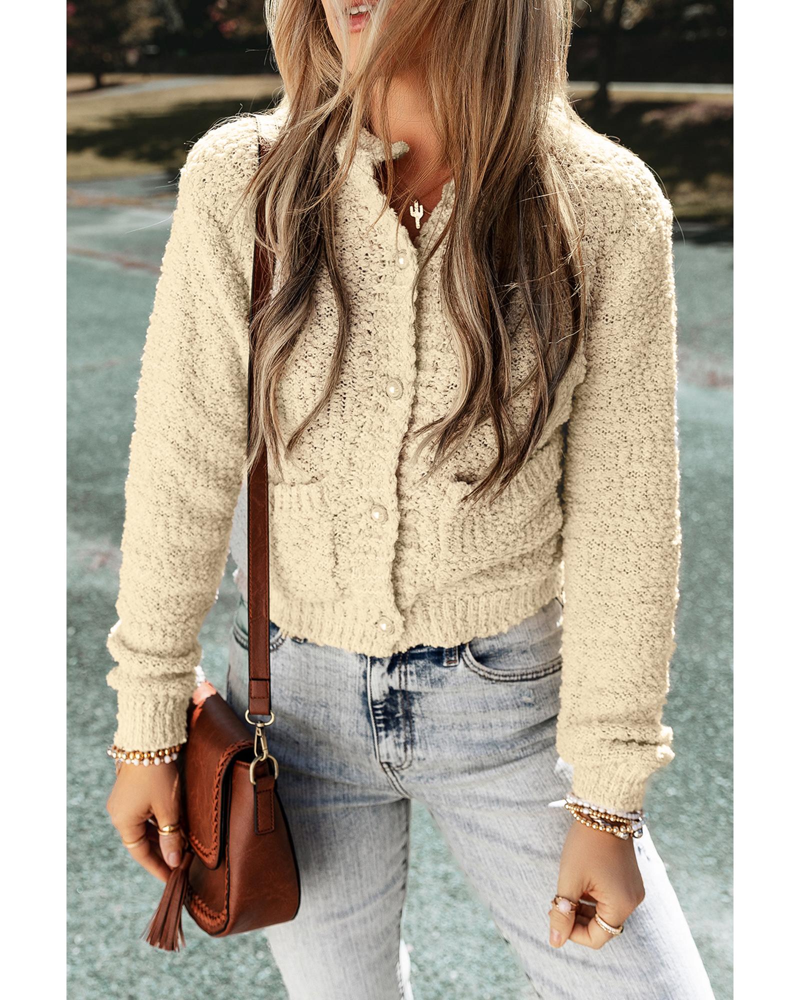Oatmeal Pearl Buttons Popcorn Textured Sweater Cardigan – M