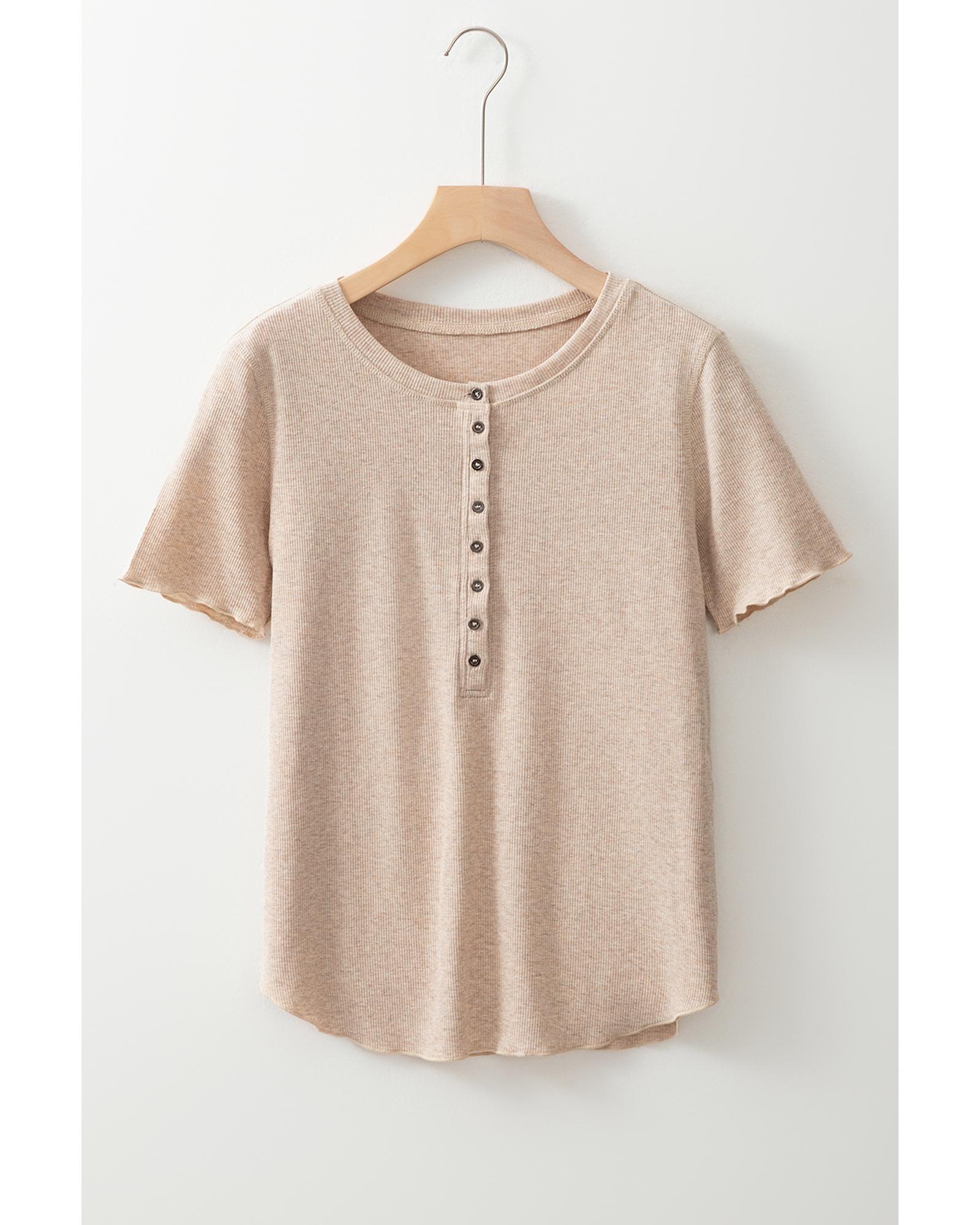 Oatmeal Short Sleeve Half Button Ribbed Knit Top – M