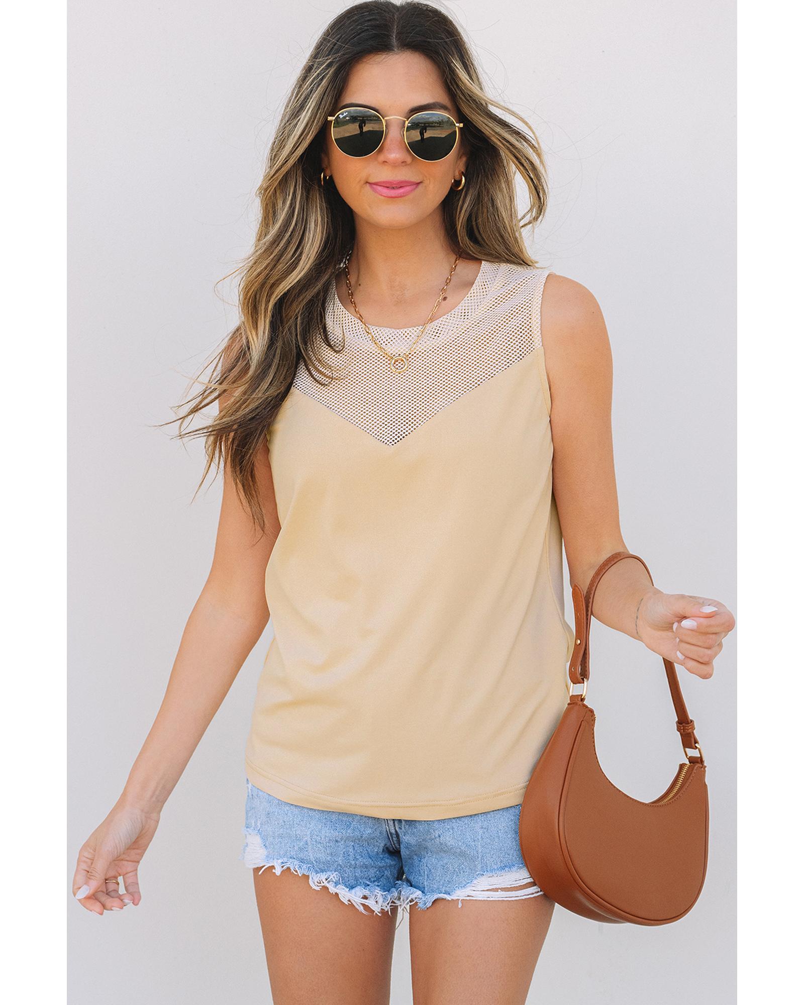 Oatmeal Solid Mesh Patchwork Crew Neck Tank Top – XL