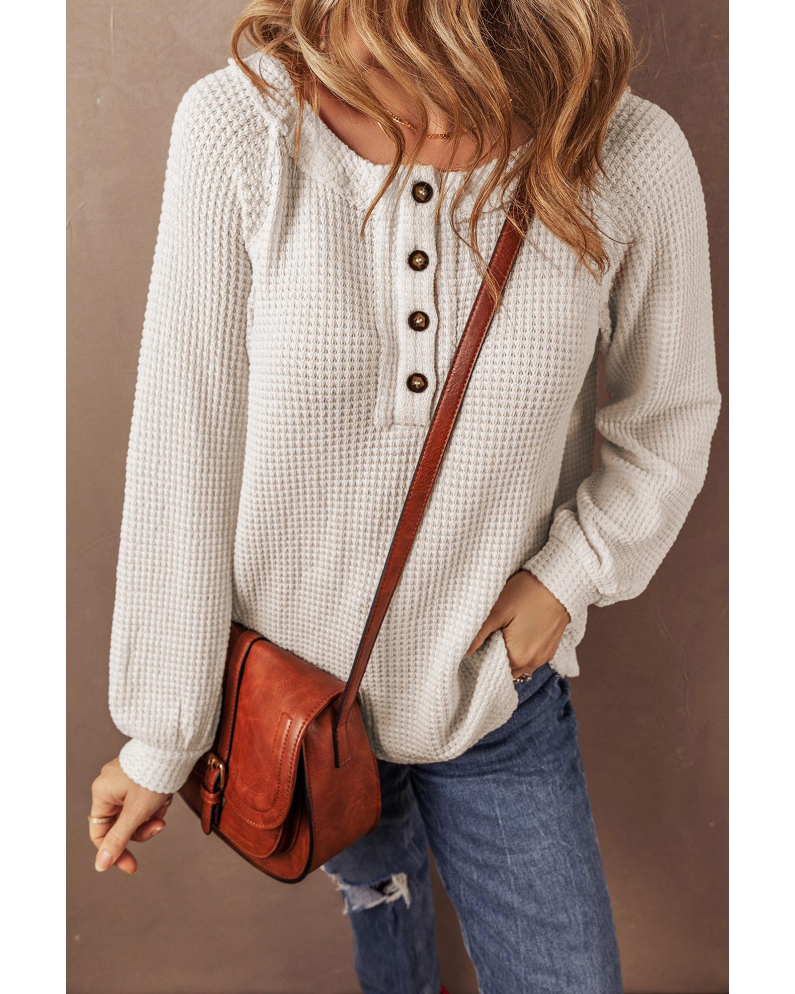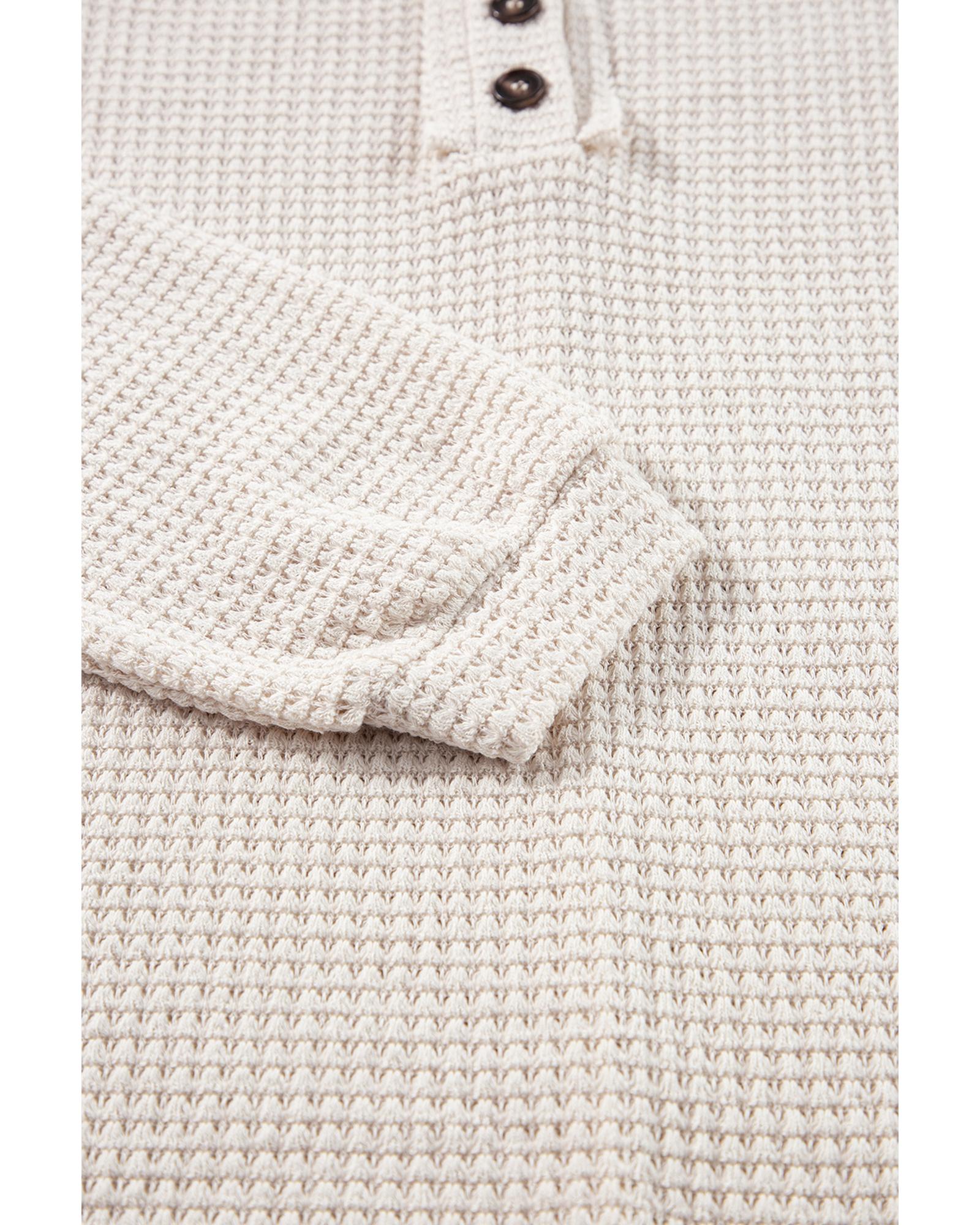 Oatmeal Waffle Knit Buttoned Front Raglan Sleeve Loose Blouse – M